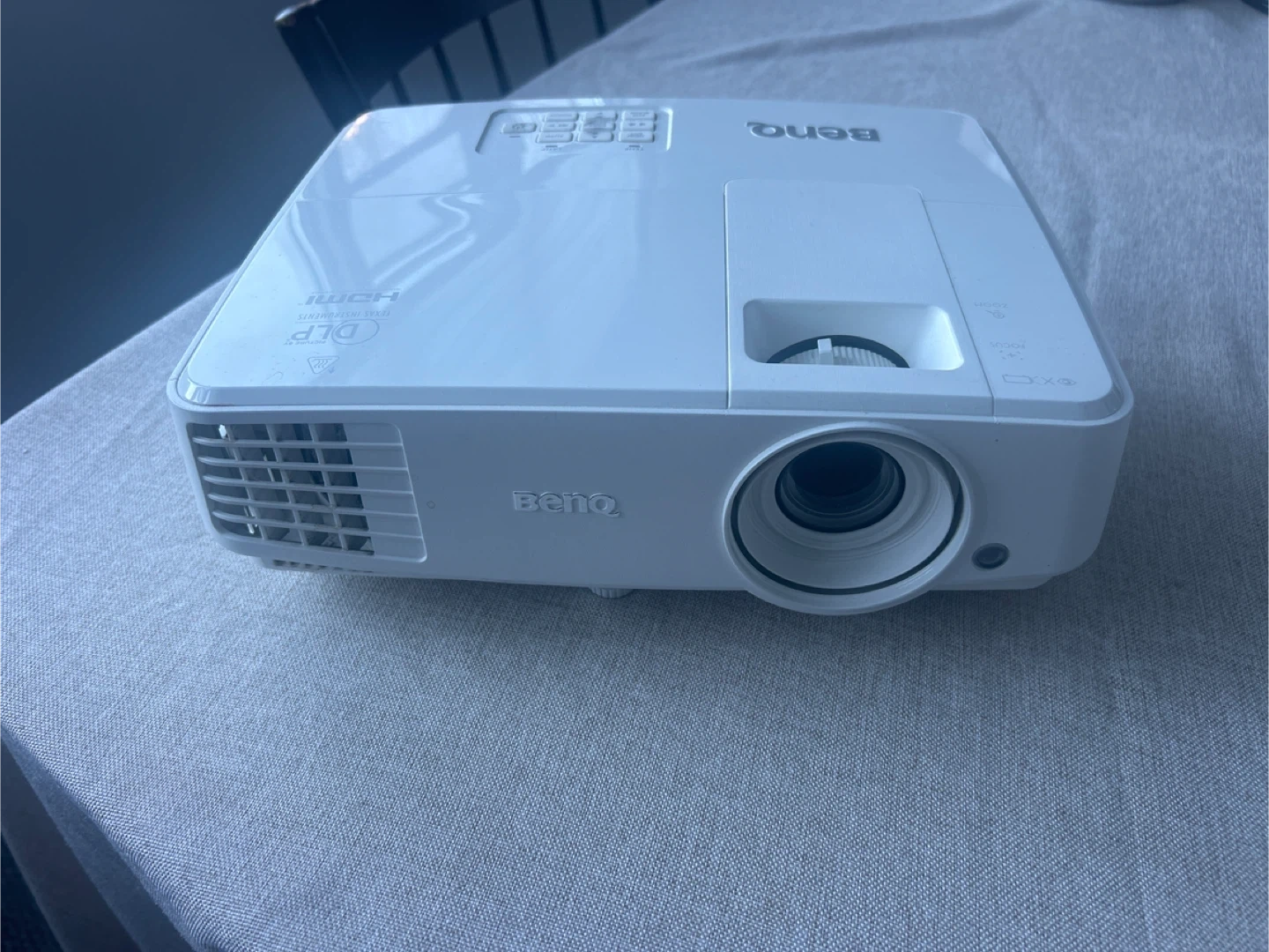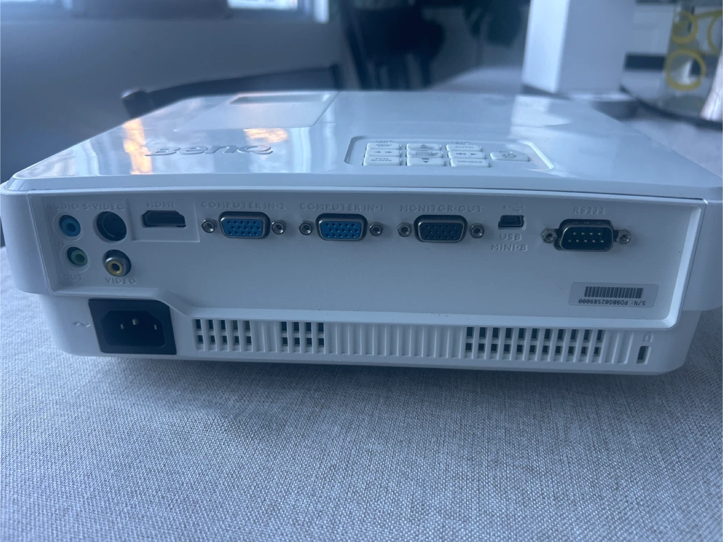 White BenQ DLP projector with focus and zoom adjustments. It has multiple input ports including HDMI, Computer-In, Monitor-Out, USB Mini-B, and RS232. This projector's display technology is DLP.
