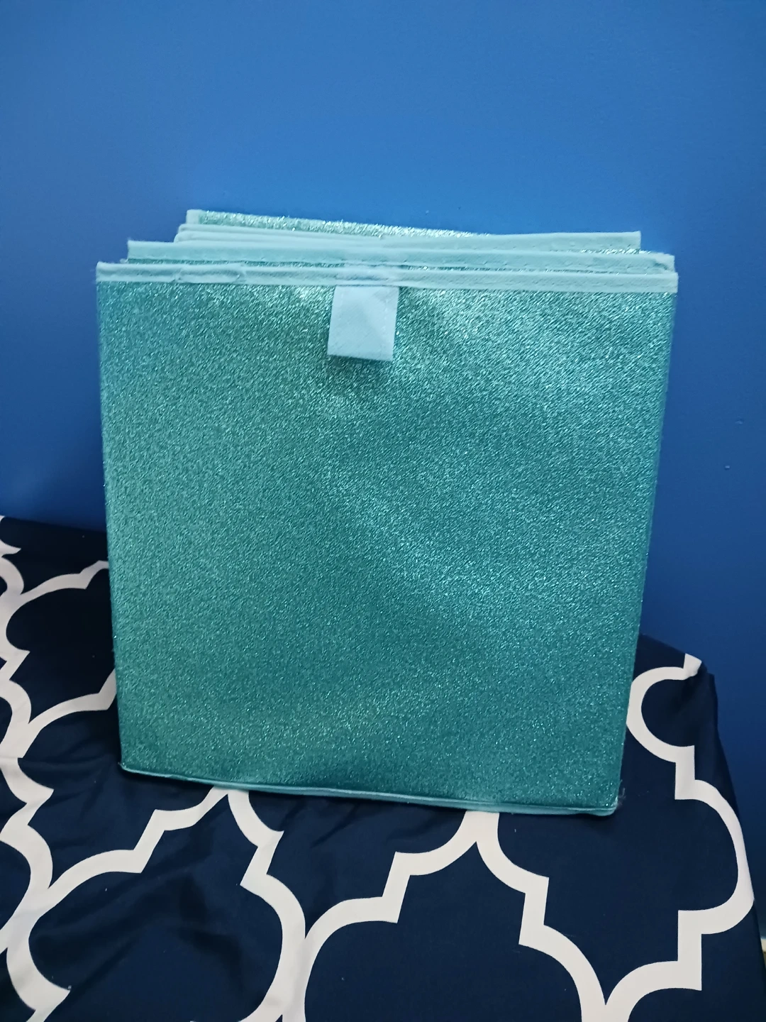 This sparkly teal storage bin is perfect for organizing small items. It's made of a durable material and features a zipper closure. It's a great size for shelves or closets!