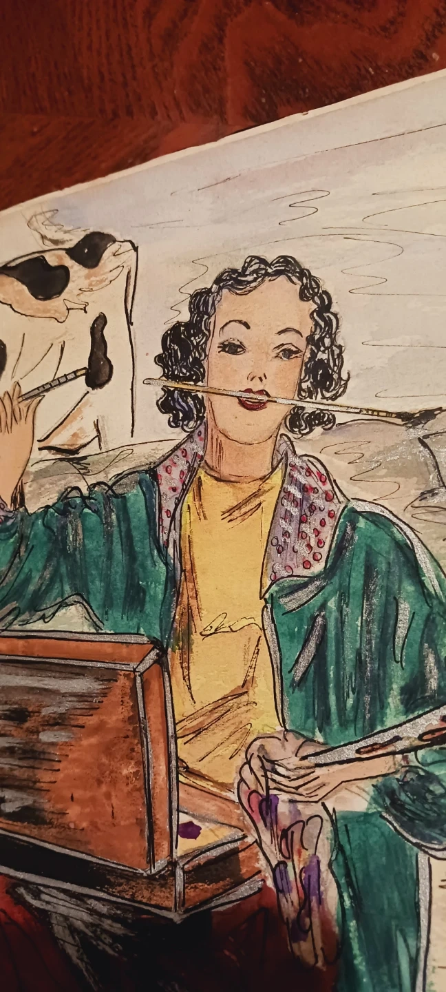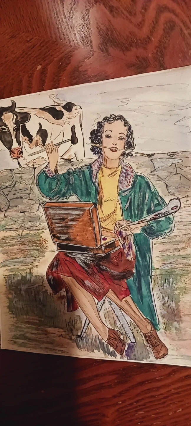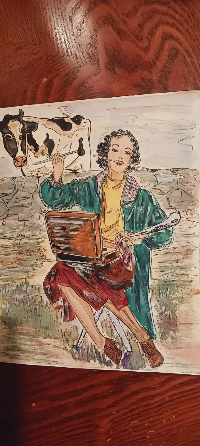 Antique 1930s Unique Authentic Artwork Colorful Drawing. It is not framed, selling as is. It depicts a woman artist painting outdoors. 11"×10". ALL MY PRICES ARE NEGOTIABLE !!