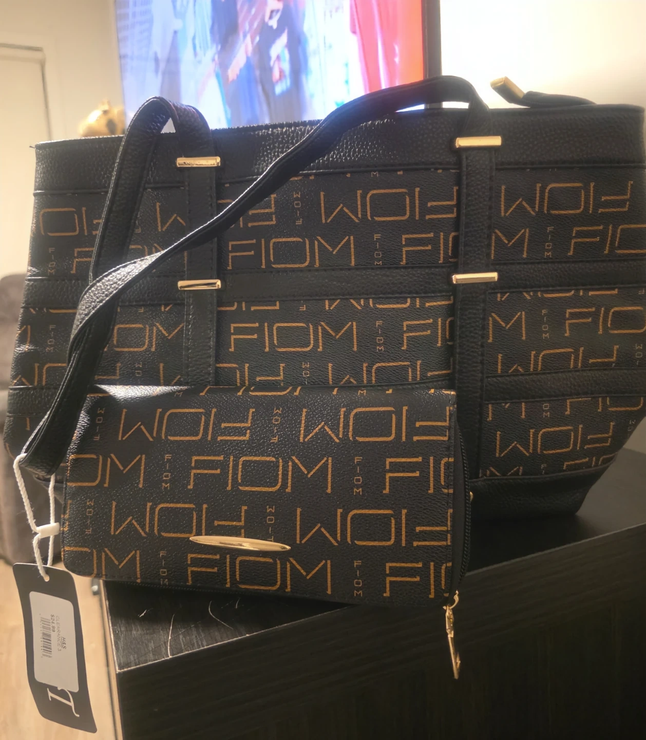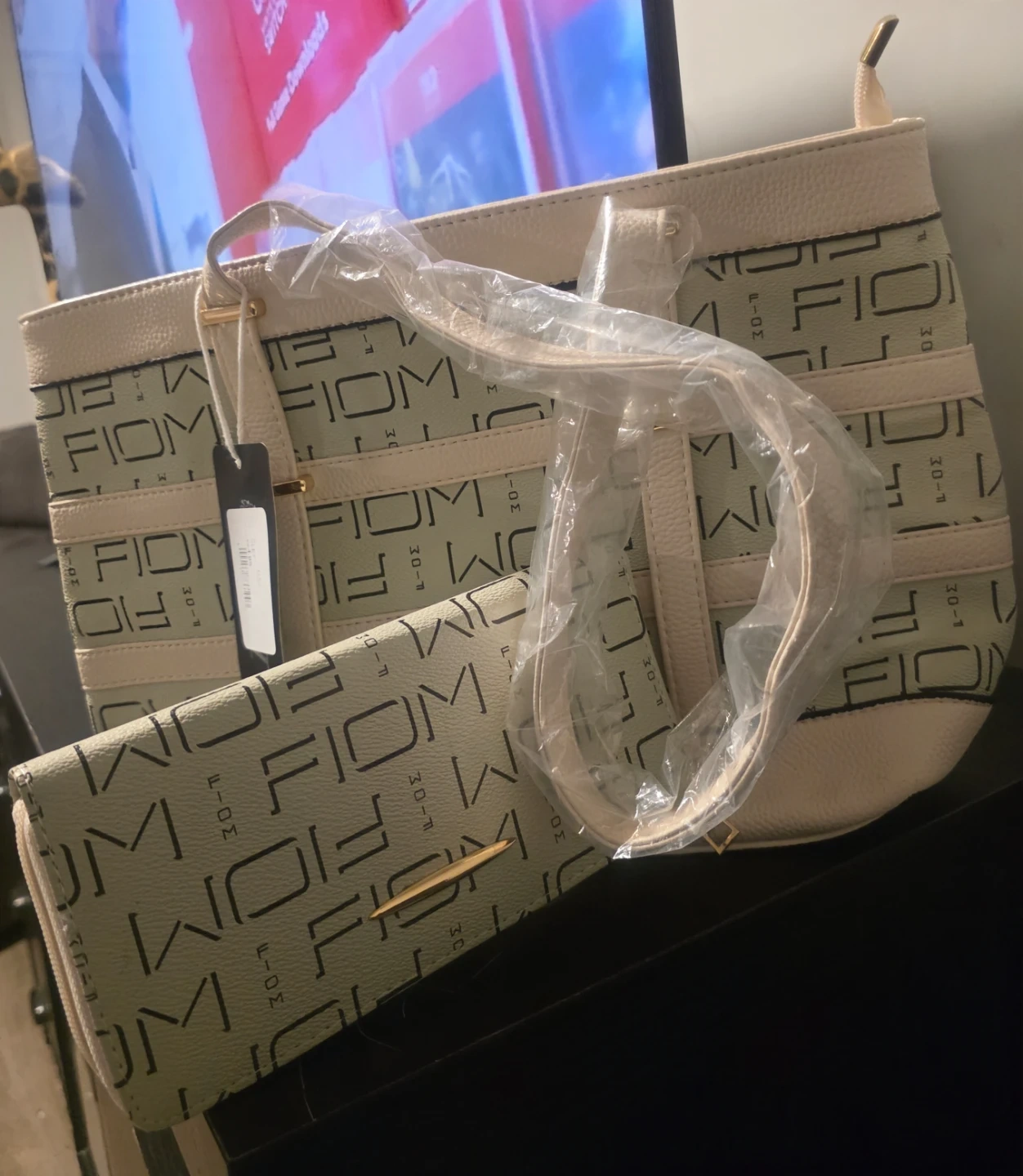This set includes a large tote bag and a smaller clutch, both with a textured pattern. The tote has red trim and gold-tone hardware. The clutch is solid red with a gold-tone zipper. A matching wallet is also included with the tote.