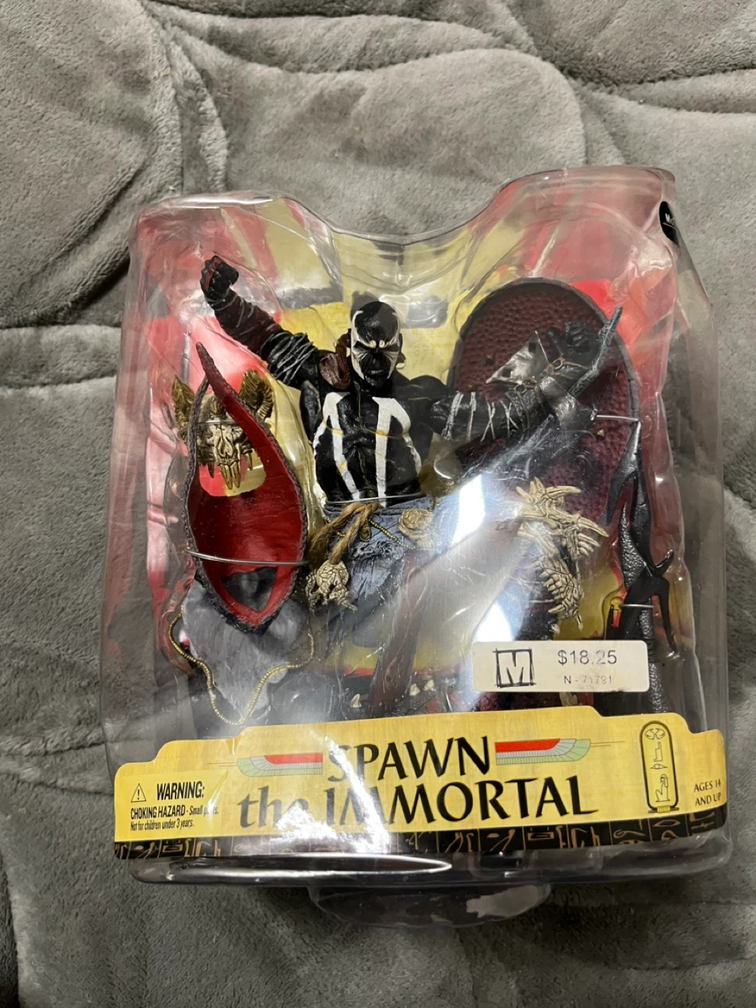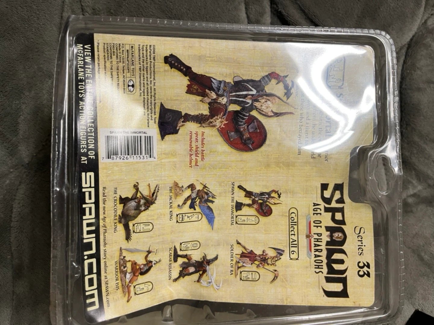 This is the Spawn The Immortal action figure from McFarlane Toys Series 33, Age of Pharaohs. It includes battle scars and a shield accessory. This figure is recommended for ages 14 and up.