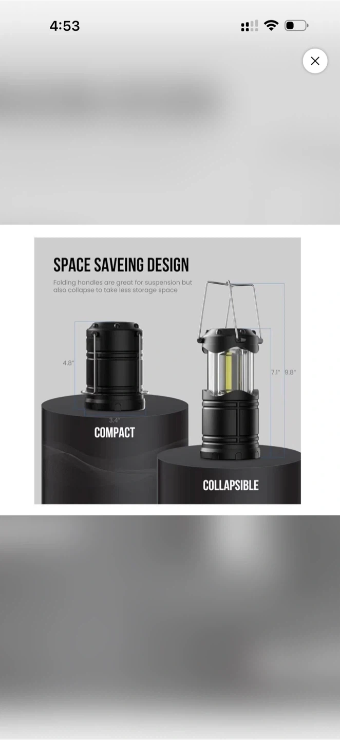 This lantern features a space-saving collapsible design with folding handles for suspension. It's compact at 4.8" tall and expands to 7.1" tall. It's perfect for camping or emergency preparedness!