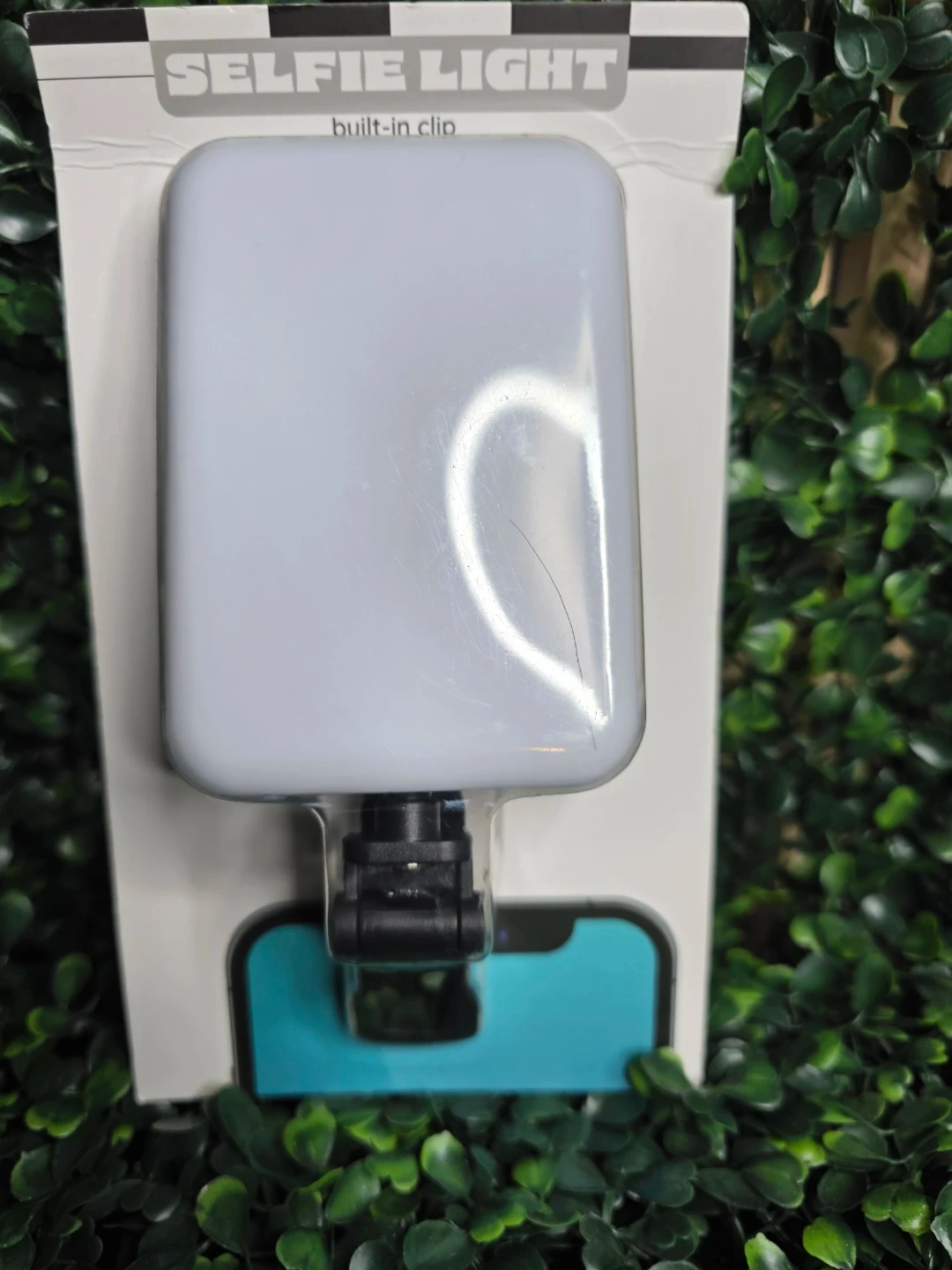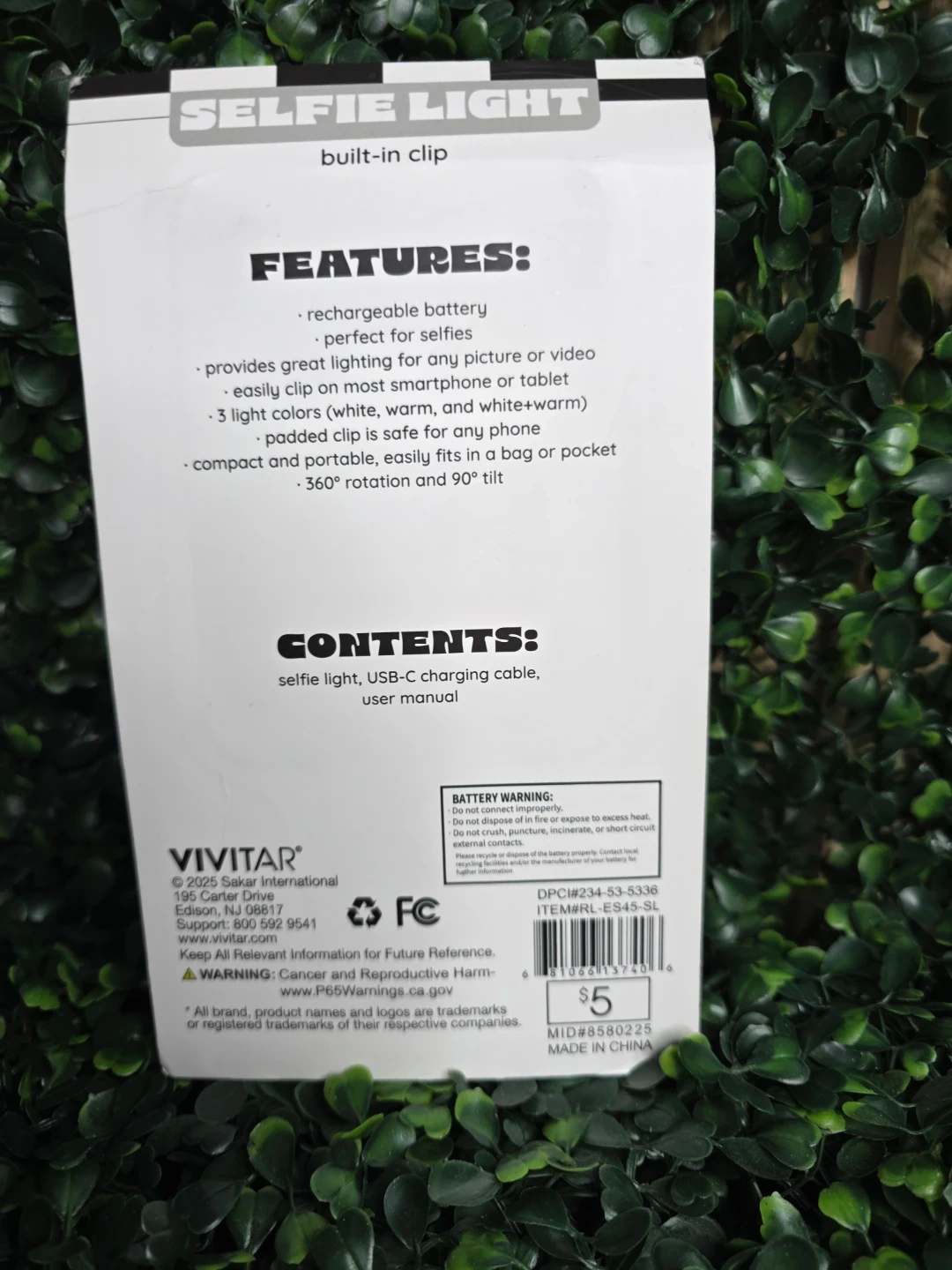 This portable selfie light is great for photos or videos! It features a rechargeable battery, 3 light colors (white, warm, and white+warm), and a padded clip that easily attaches to most smartphones. It offers 360° rotation and a 90° tilt. Includes a USB-C charging cable and user manual.