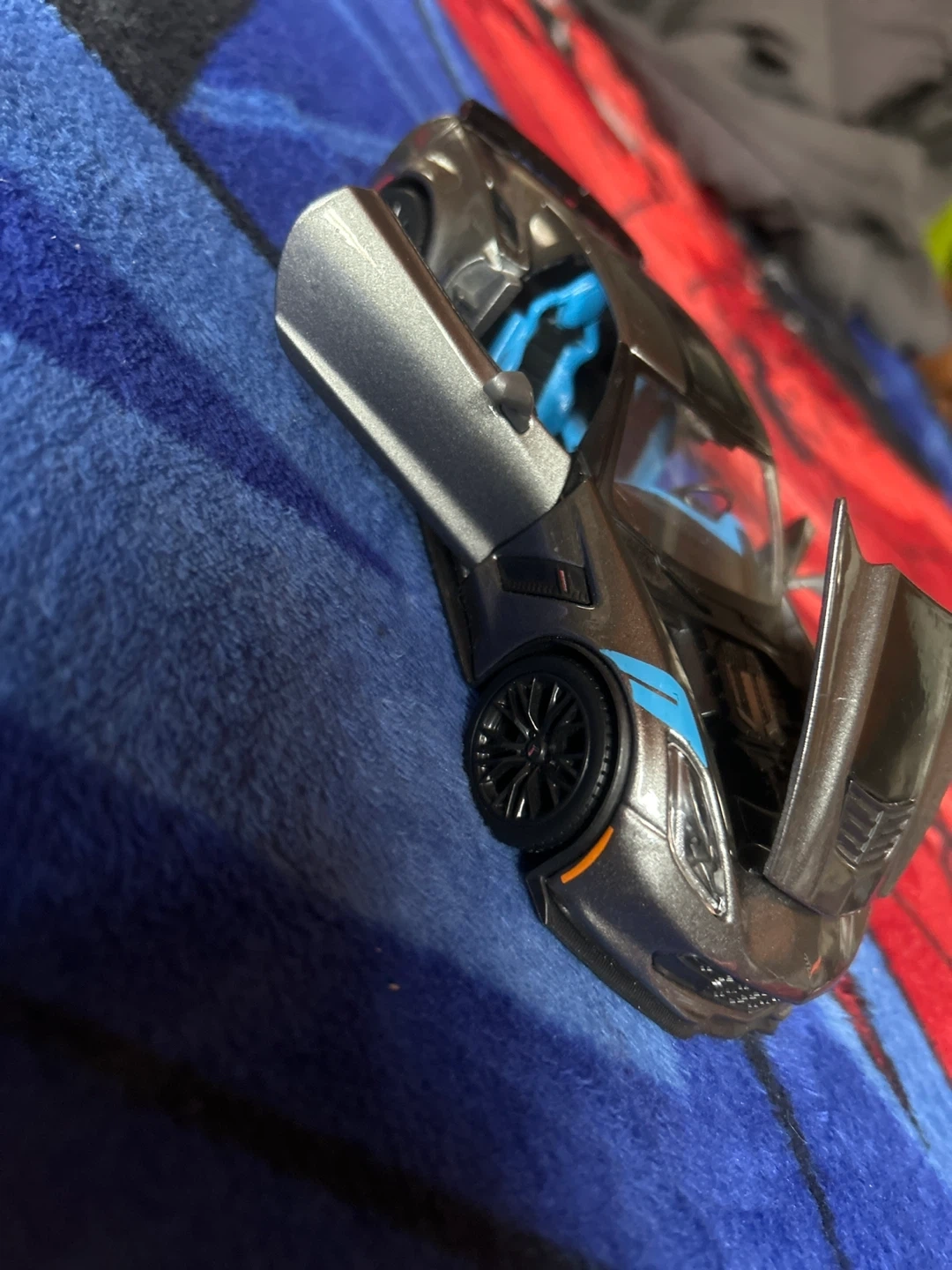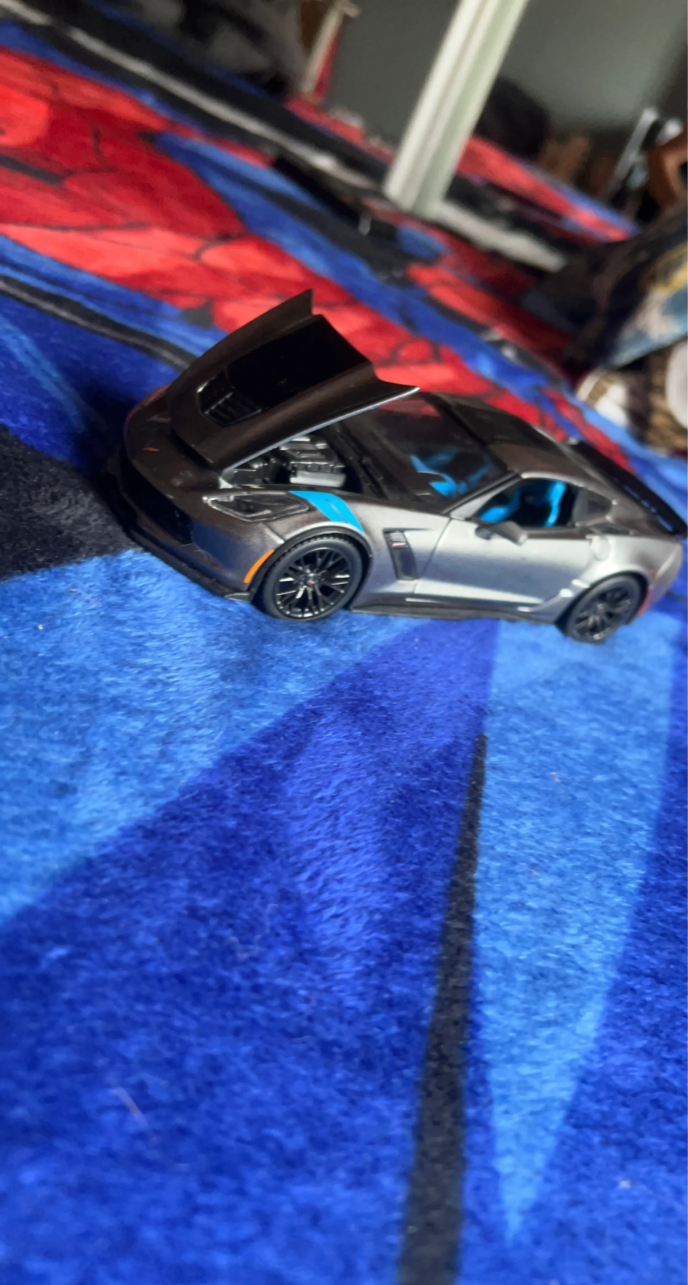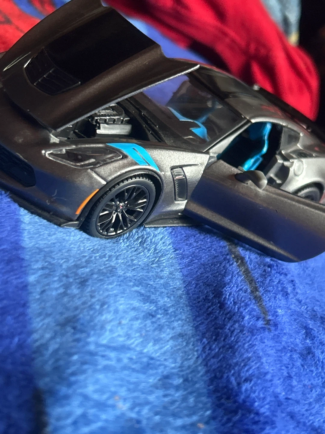 A detailed model of a 2017 C7 Z06 Corvette. It features opening doors and hood, with a blue interior and exterior accents. This collectible is great for display or play! CASH ONLY price is negotiable zero scratches on car just a little dusty