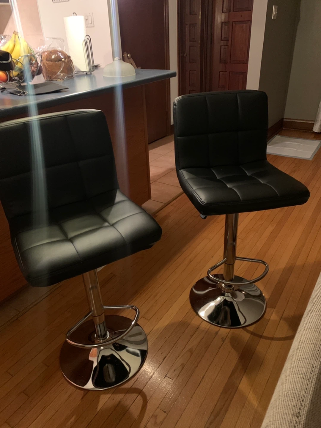 Two adjustable height bar stools upholstered in black faux leather. They feature a tufted seat design and a chrome base with a footrest. These stools offer comfortable seating for kitchen islands or home bars.
