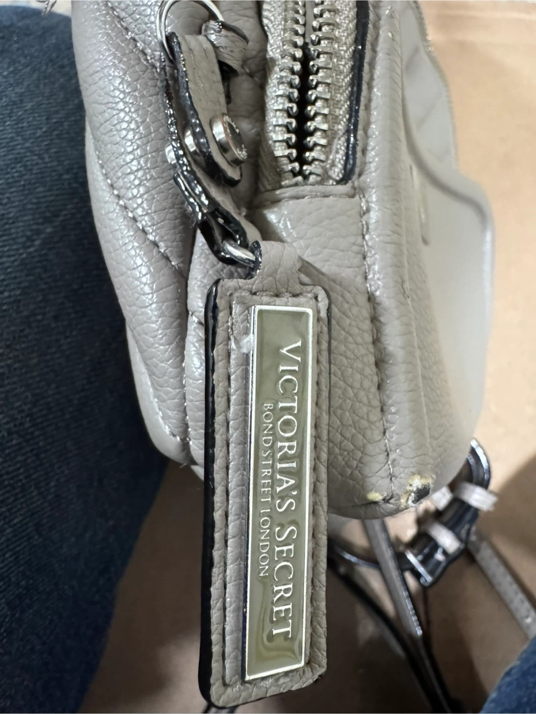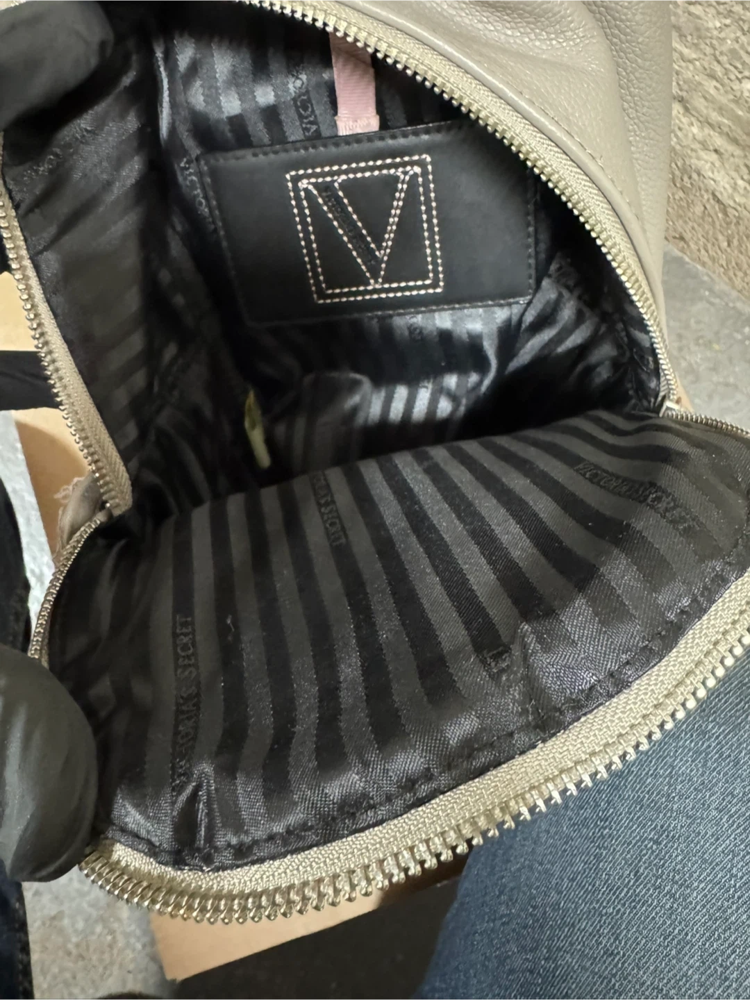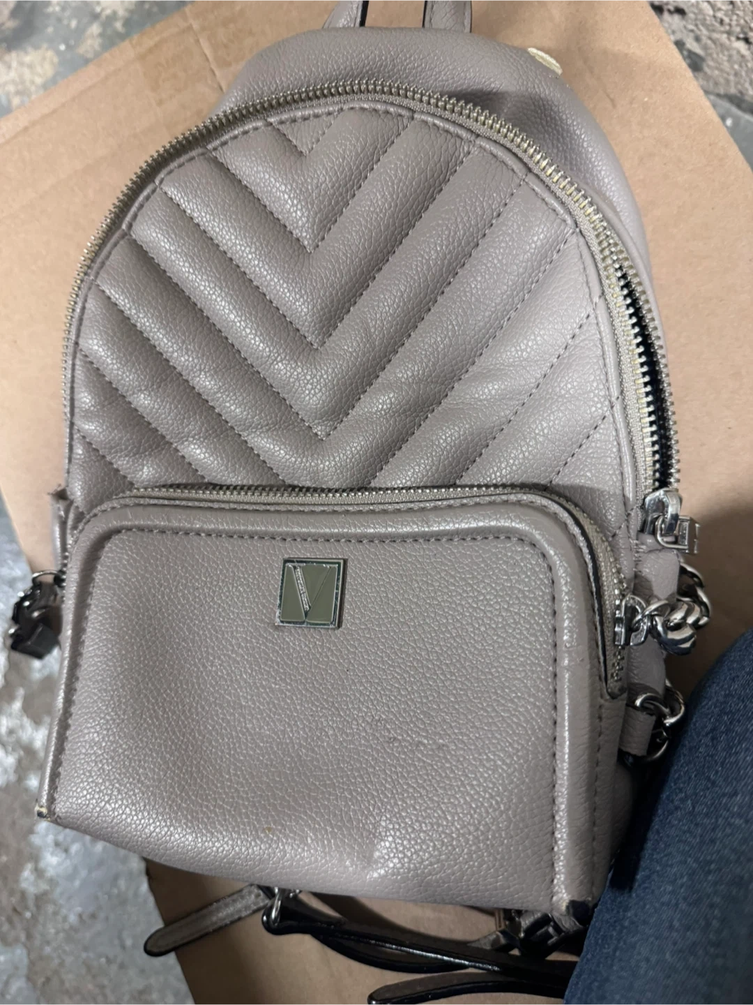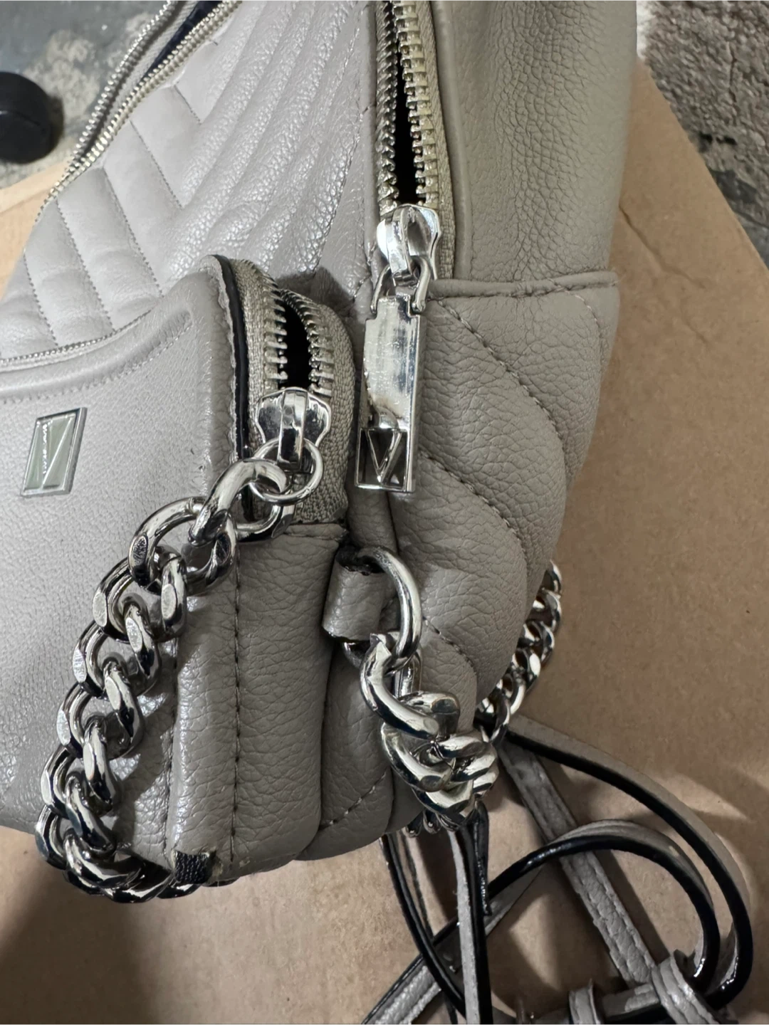 Stylish gray mini backpack from Victoria's Secret. It's made of faux leather with a chevron quilted pattern. Features a front zip pocket and adjustable straps.