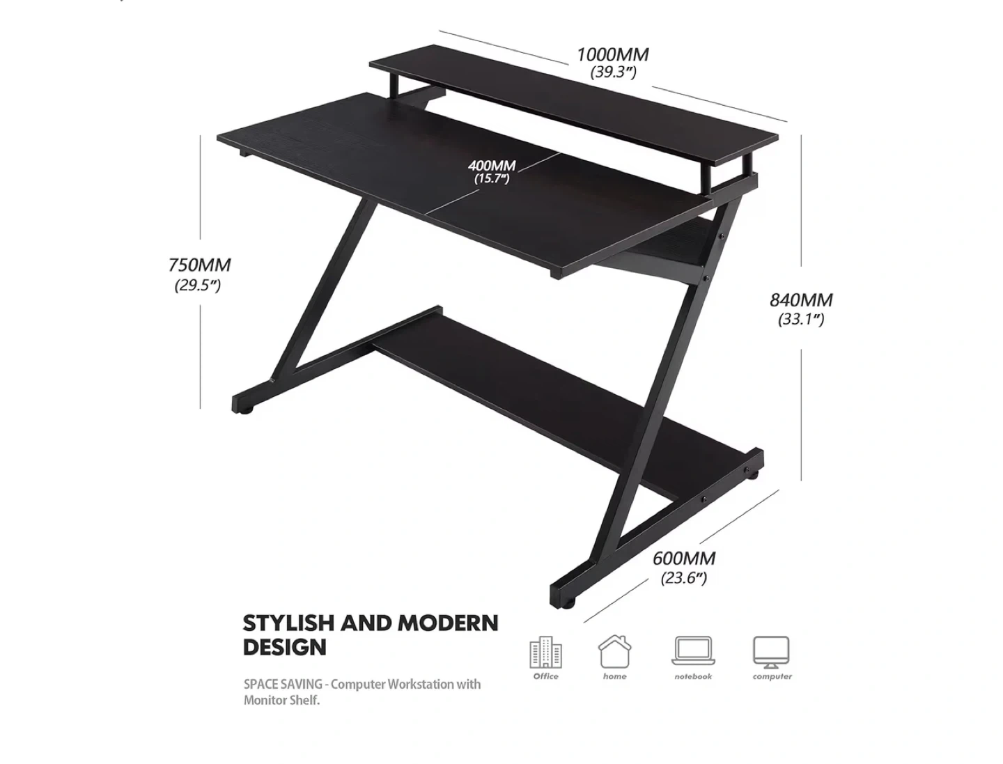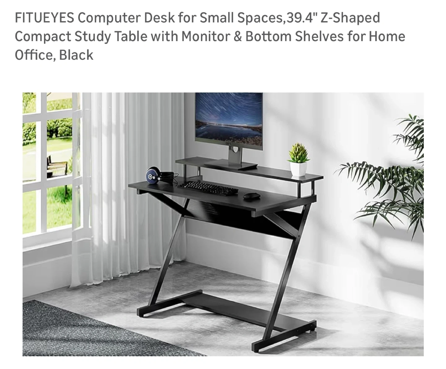 This black FITUEYES computer desk features a Z-shaped design with a monitor shelf and bottom shelves. It's 39.4 inches wide. This compact study table is ideal for home office use.