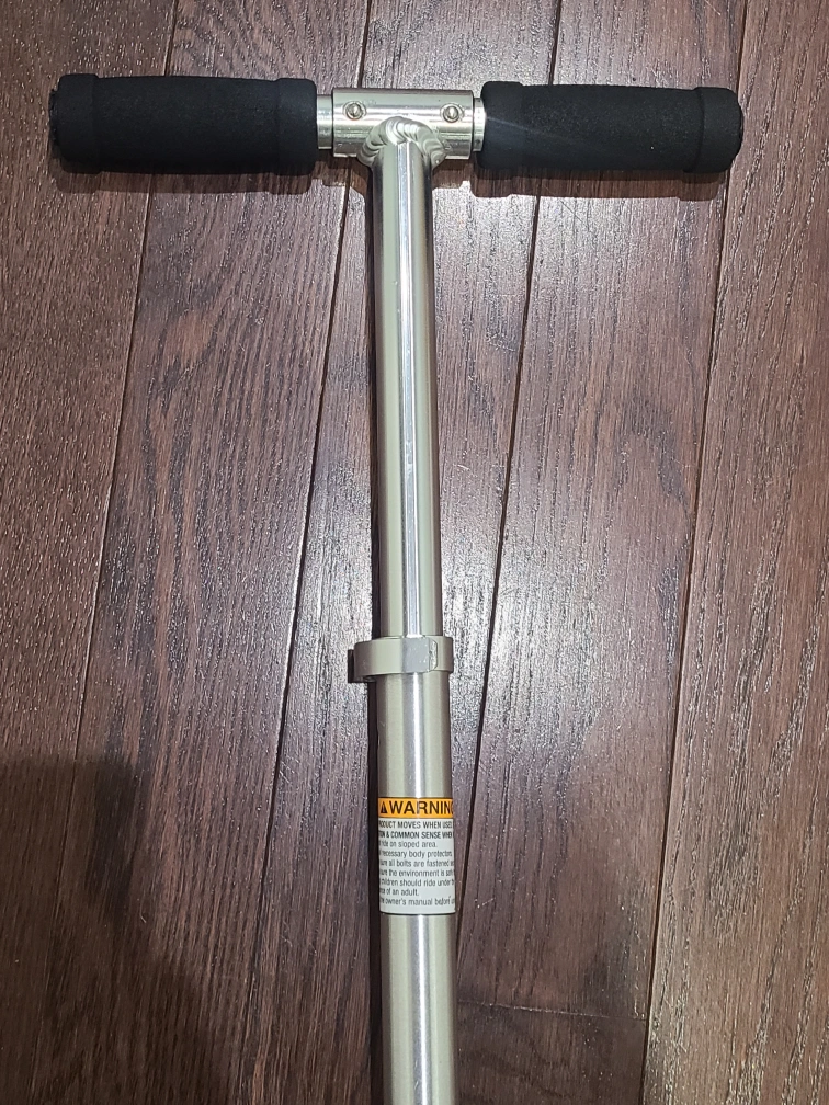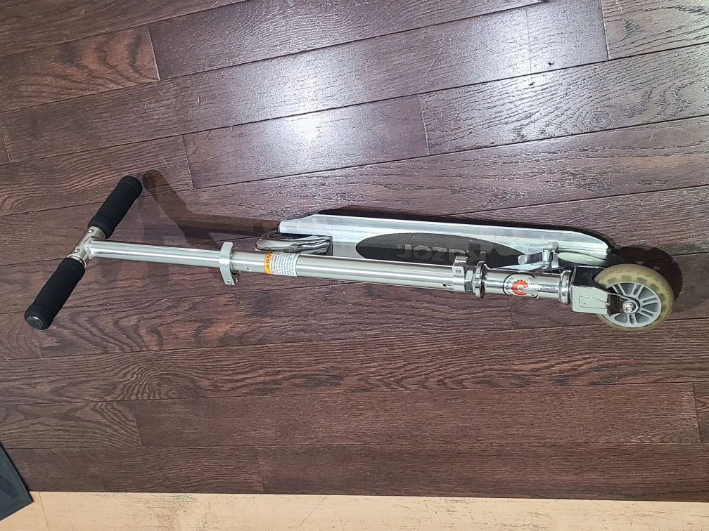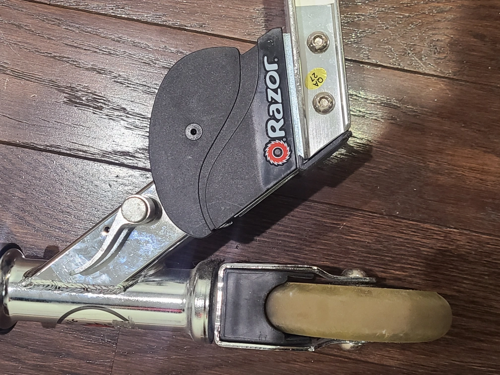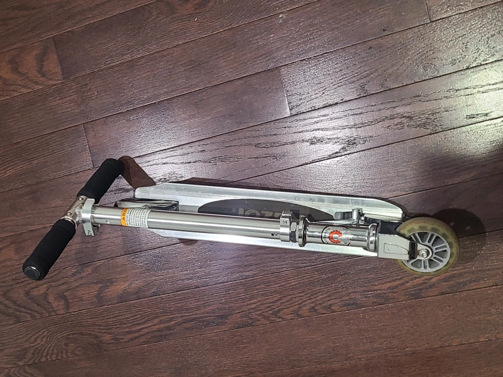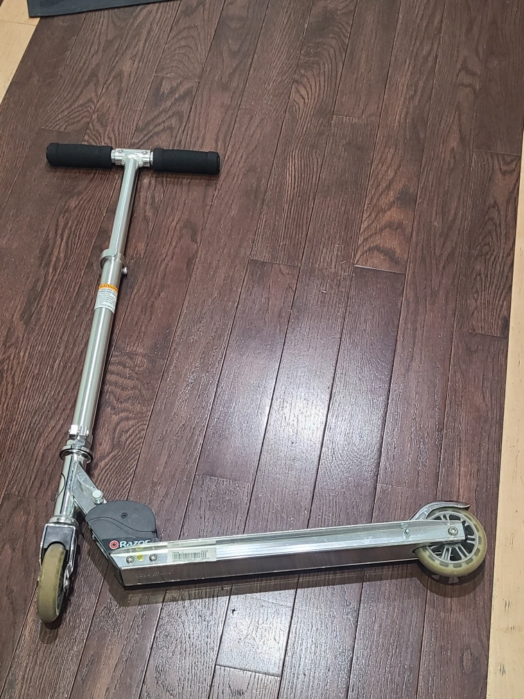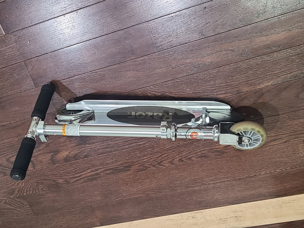 gently used, silver Razor scooter. It's made of aluminum with black handlebar grips. The scooter is foldable for easy storage and transport. great for kids ages 6 to 9.