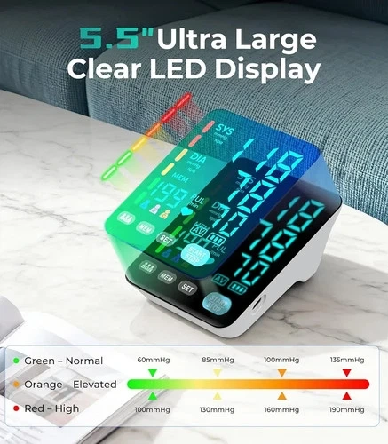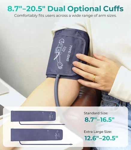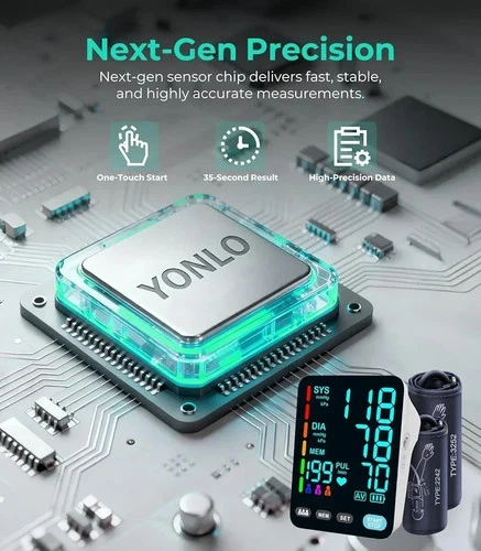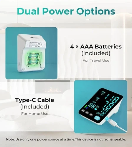 This YONLO blood pressure monitor is great for home use. It's accurate and fast, giving results in about 35 seconds. It comes with two cuff sizes (9-17 inches and 13-21 inches) to fit most arms comfortably. The large LED display is easy to read and shows color-coded results (green for normal, orange for moderate, red for high). It can store up to 199 readings for three different users, so everyone can track their own history. You can power it with 4 AAA batteries or a Type-C cable (batteries and cable included). It also comes with a carry bag. Let me know if you have any questions!