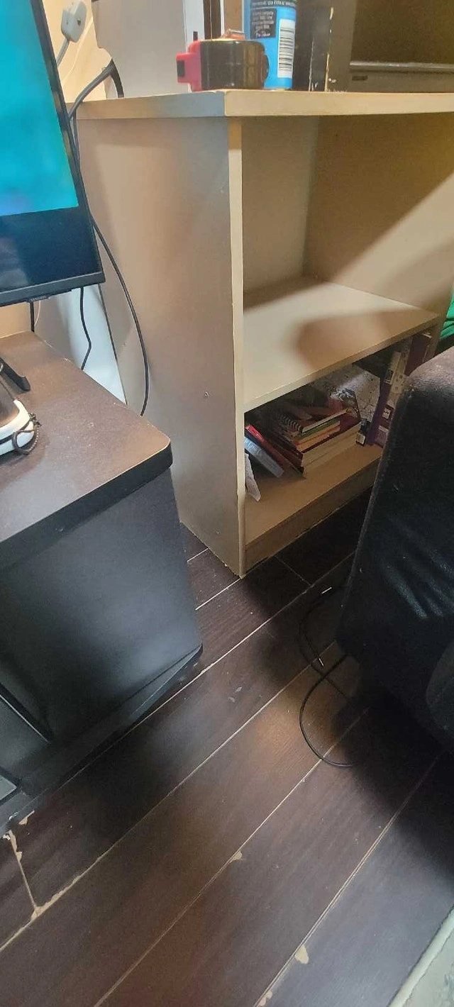The tv stand is holding a 43" tv. I am selling it because I'm going to mount my tv. I am asking $25 for it. The shelf is 2 tear, very sturdy (can hold my weight) top shelf has an open back the bottom shelf does not. the color i think is salmon or like light peach I'm not sure. It will need to be painted, would make a nice end table. Asking $10