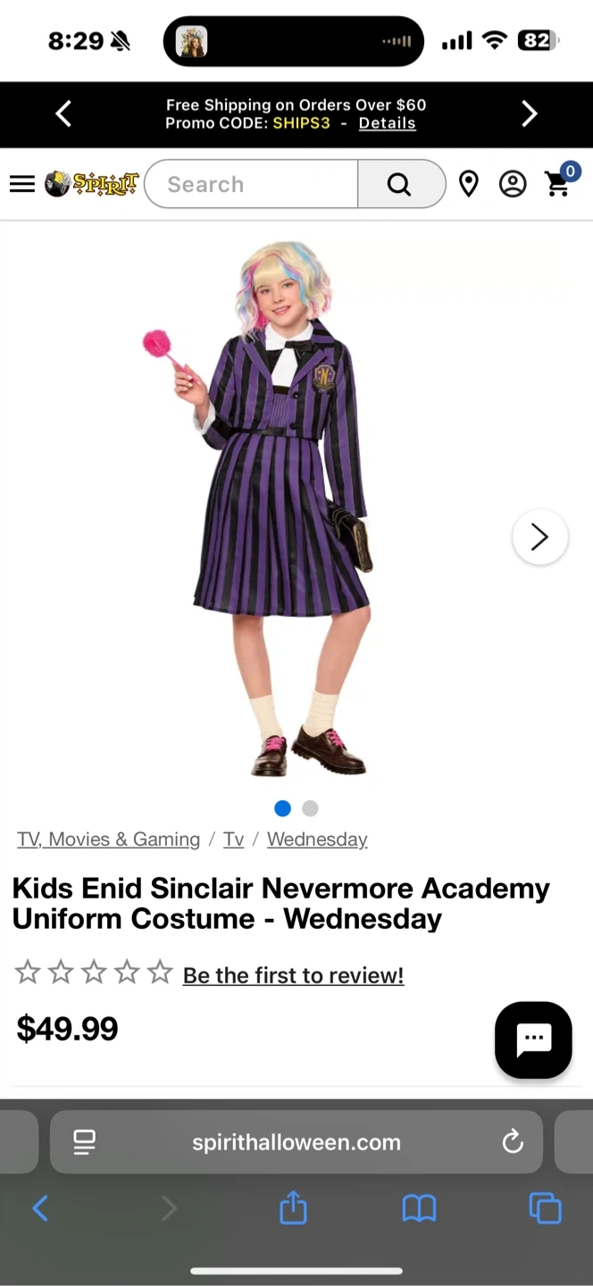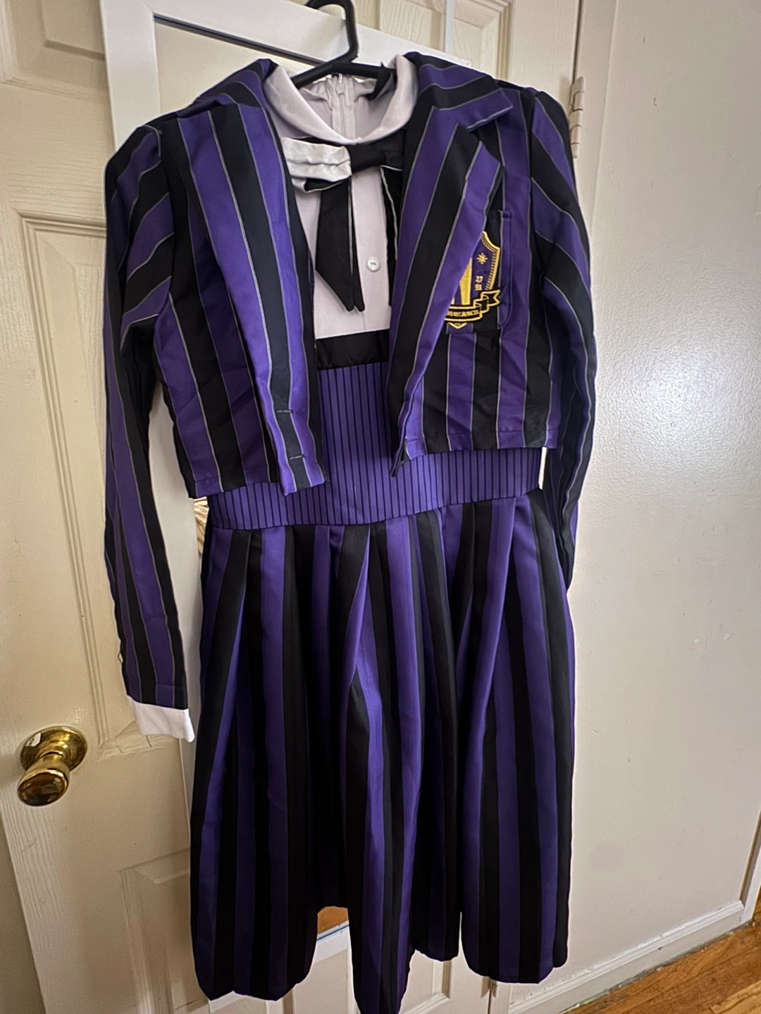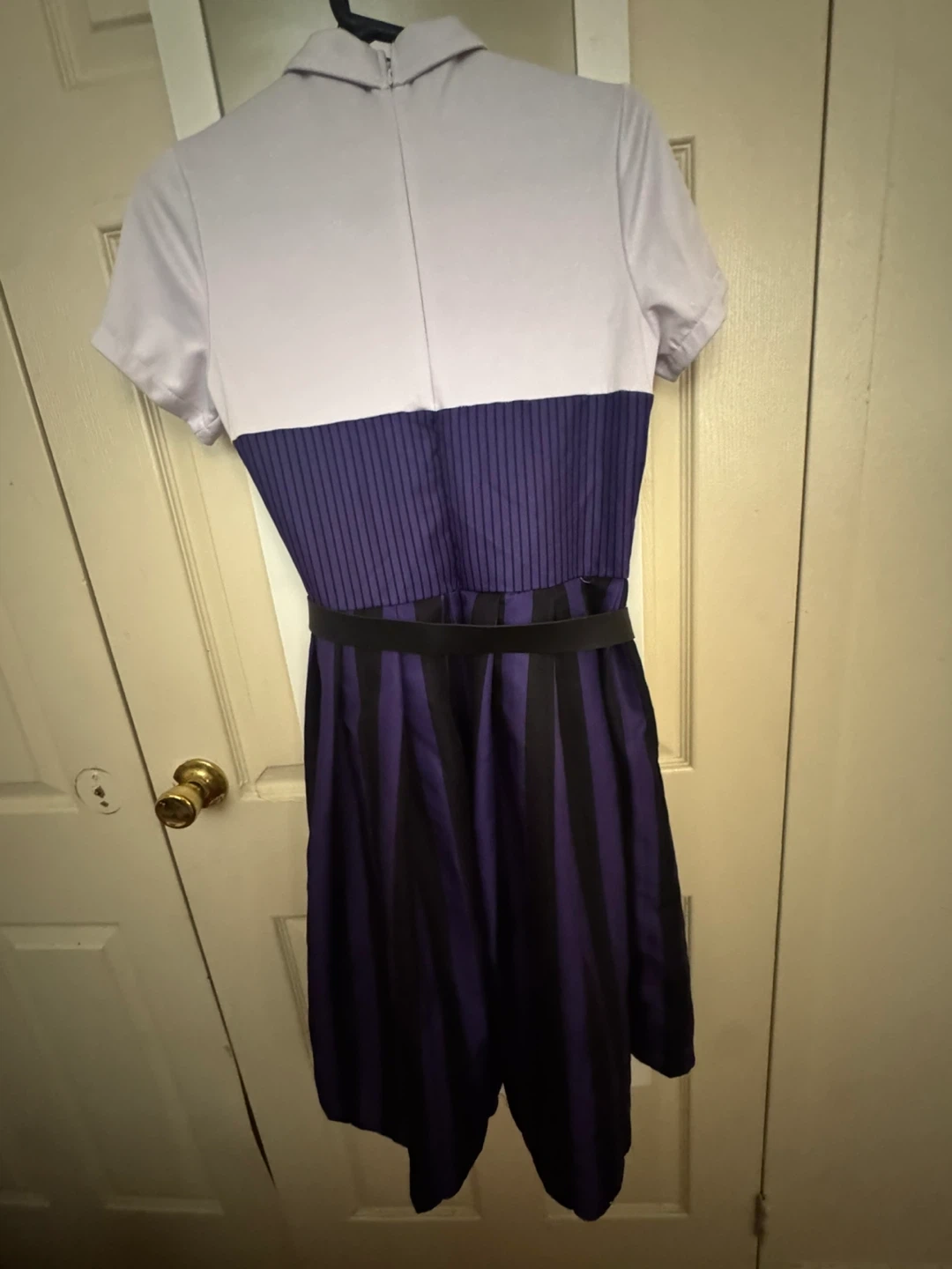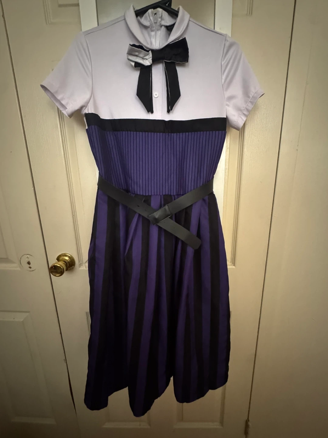 This is a Wednesday Nevermore Academy uniform costume dress. It's a size small and features the iconic purple and black striped design with a white collar and black bow tie. It comes with a black belt.