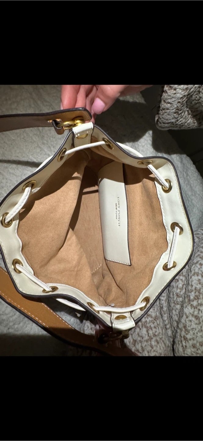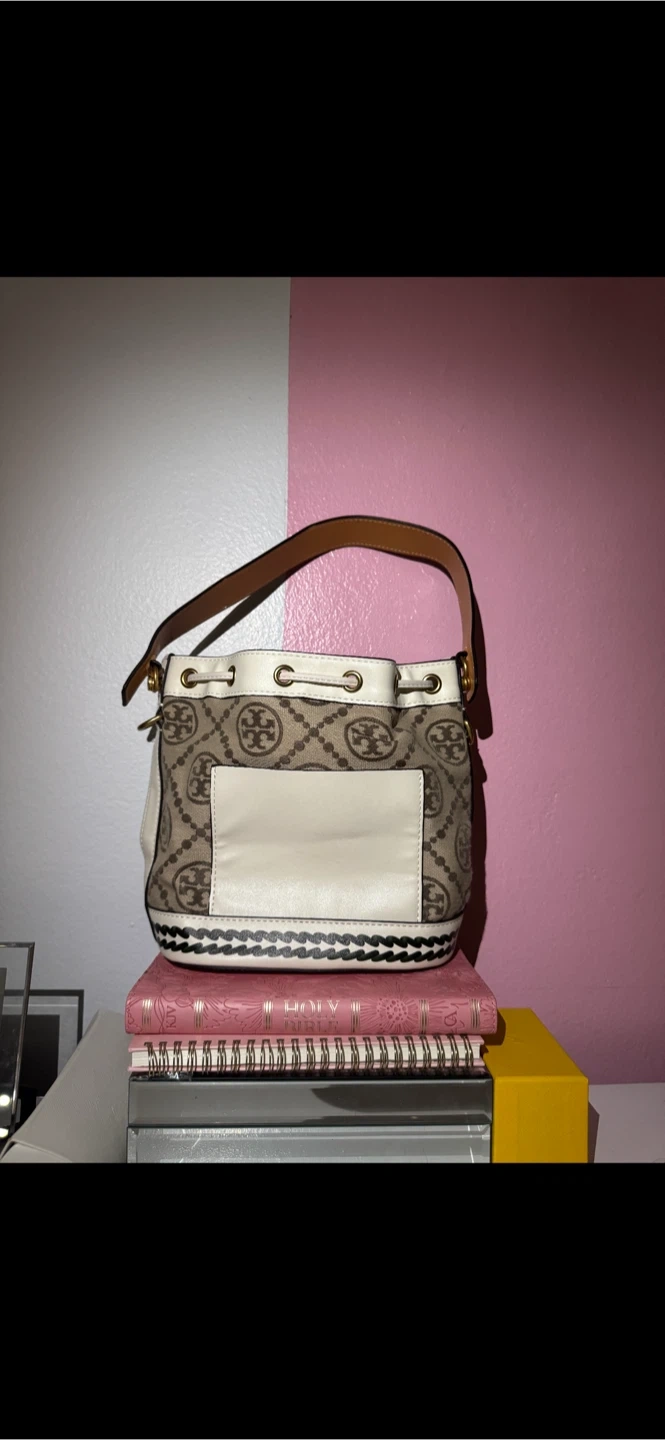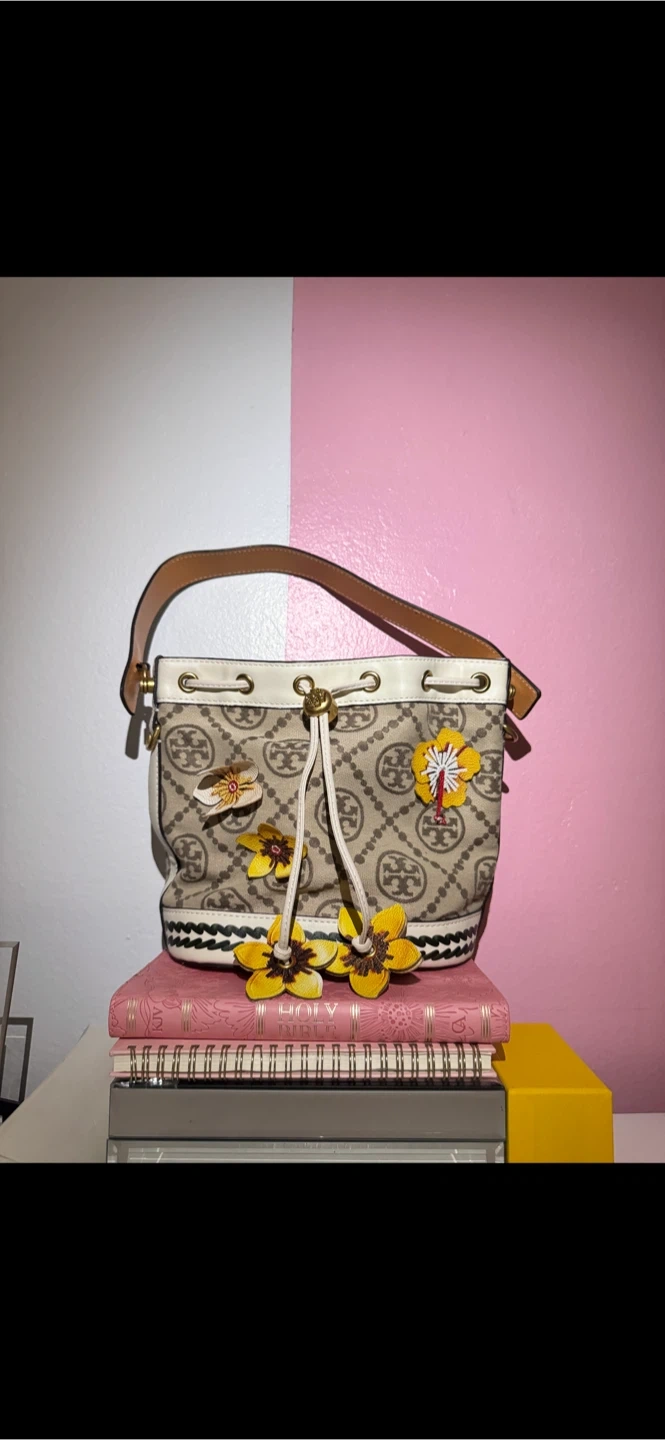 This Tory Burch bucket bag features the signature logo pattern. It has a drawstring closure and leather trim. Includes a small interior pouch. The exterior has decorative floral and bee appliques.