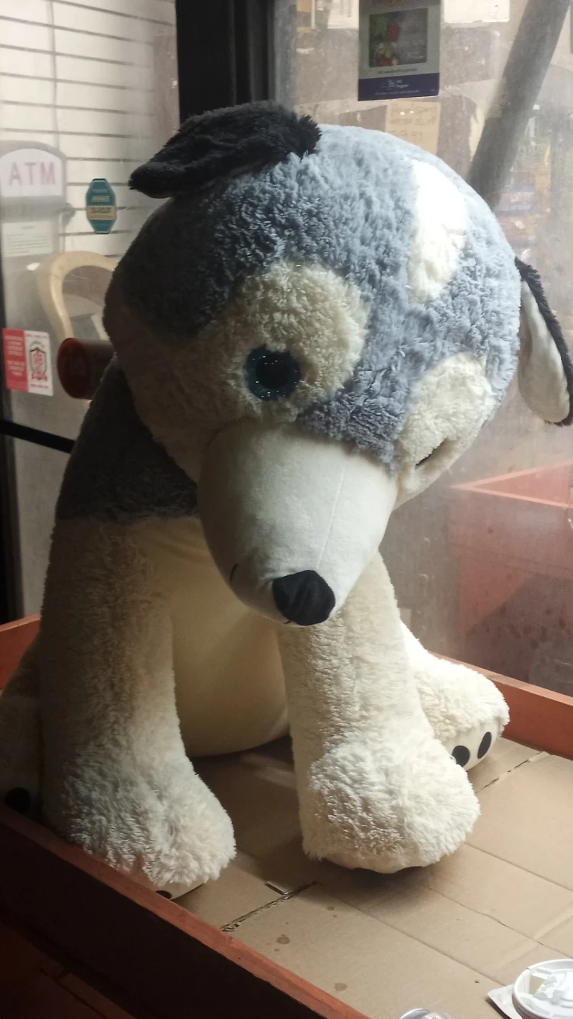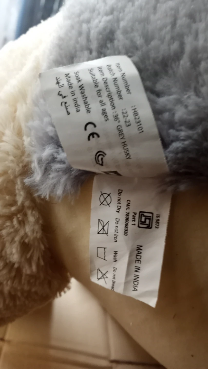 This is a large, plush husky dog toy, measuring 36 inches. It's soft and huggable with a grey and white color scheme. Suitable for all ages, this stuffed animal is spot clean or surface washable. It's a fun companion for playtime or decoration!