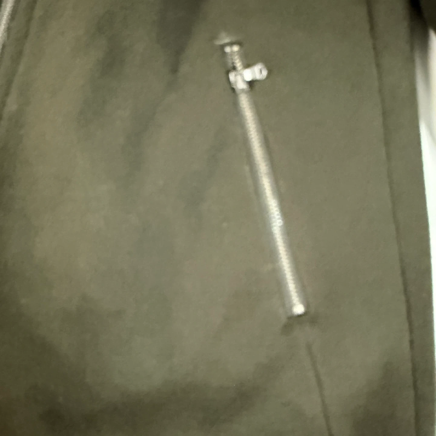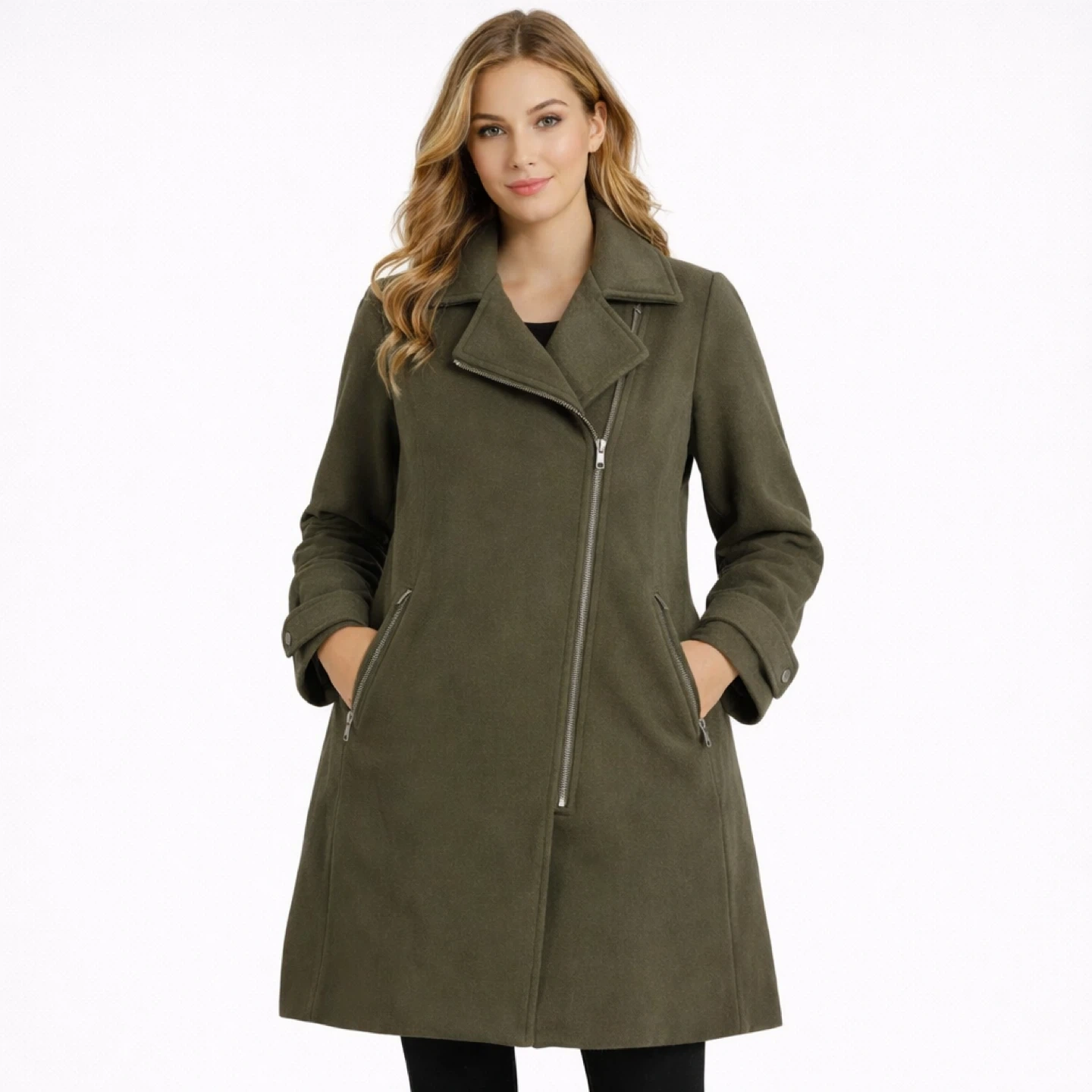 Elegant olive green color with asymmetrical zip front and zip pockets. Perfect for fall and winter.