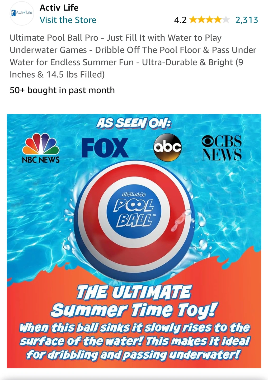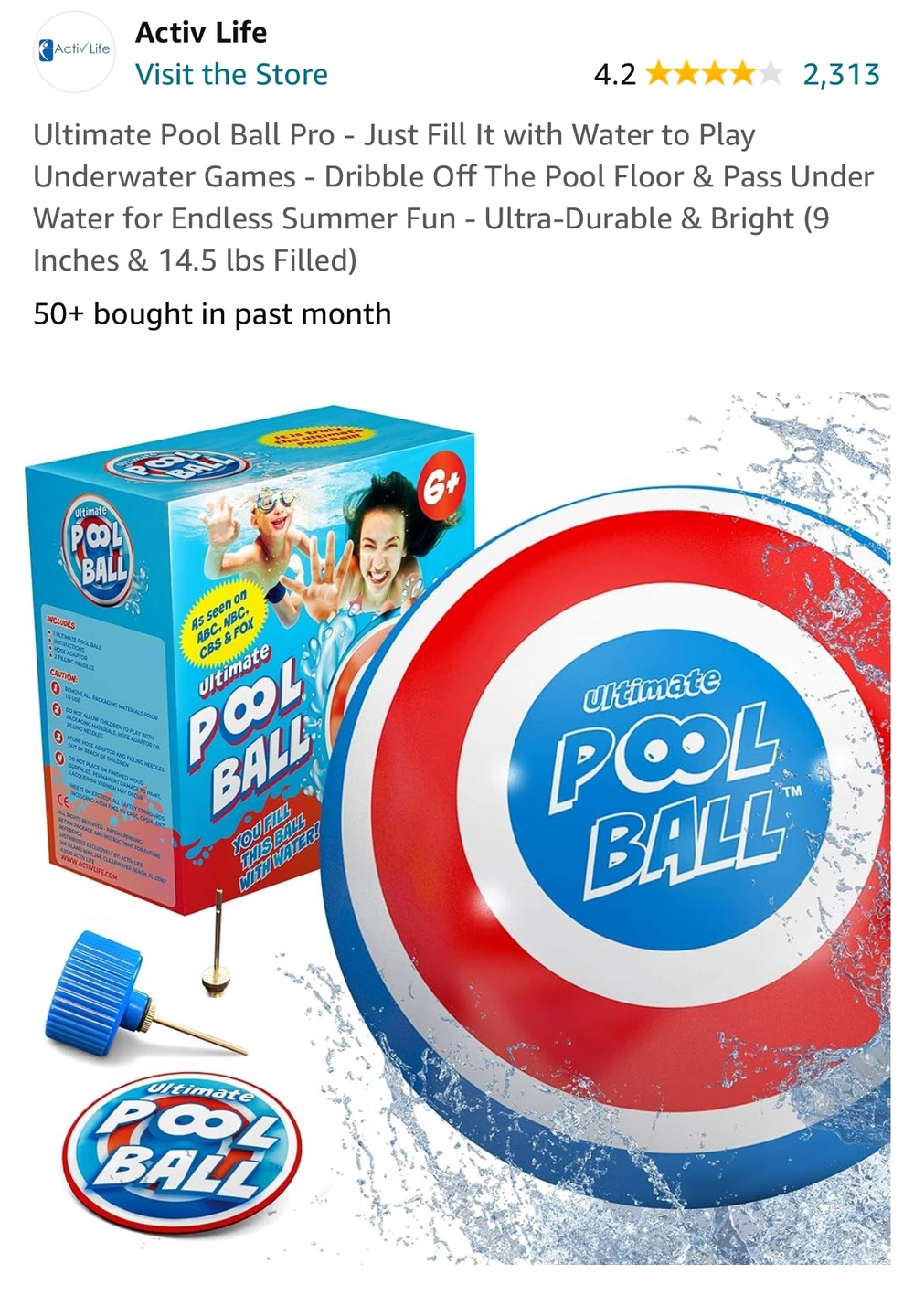 Fun water toy for kids and teens; fills with water for underwater games. Nine inches in diameter and weighs 14.5 lbs when full.