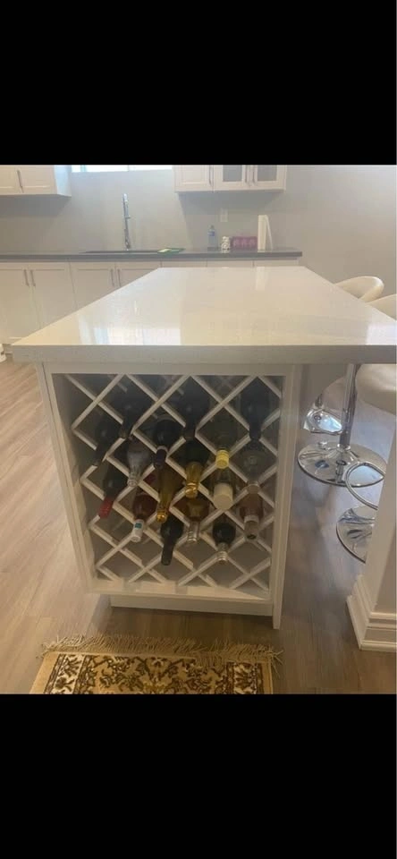 This solid wood island features a built-in wine rack, perfect for your kitchen. It offers ample counter space for food preparation and a convenient storage solution for your wine bottles.