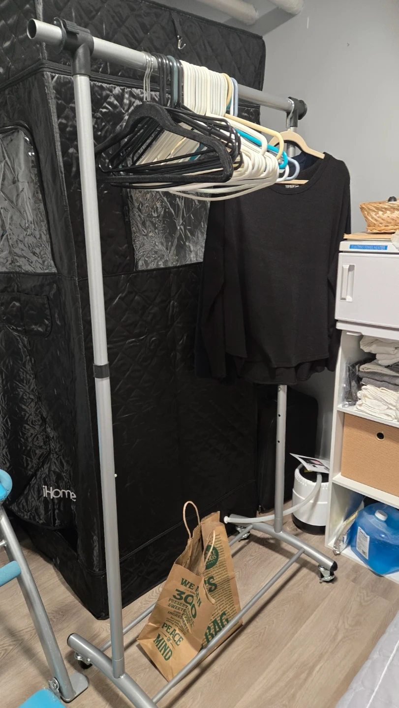 This is a portable clothing garment rack from iHome. It's made of metal and features wheels for easy mobility. It's perfect for storing or displaying clothes. Great for closets. One screw missing on base but doesn't affect function and missing one side pole extension.
