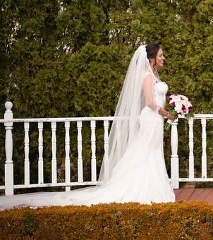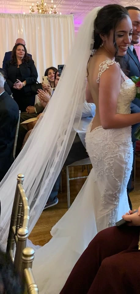 Included is a matching cathedral veil, completing the look with soft, ethereal drama and making this a truly unforgettable bridal ensemble. Previously worn and meticulously cared for, this set is perfect for the bride seeking a high-fashion designer gown with effortless sophistication.