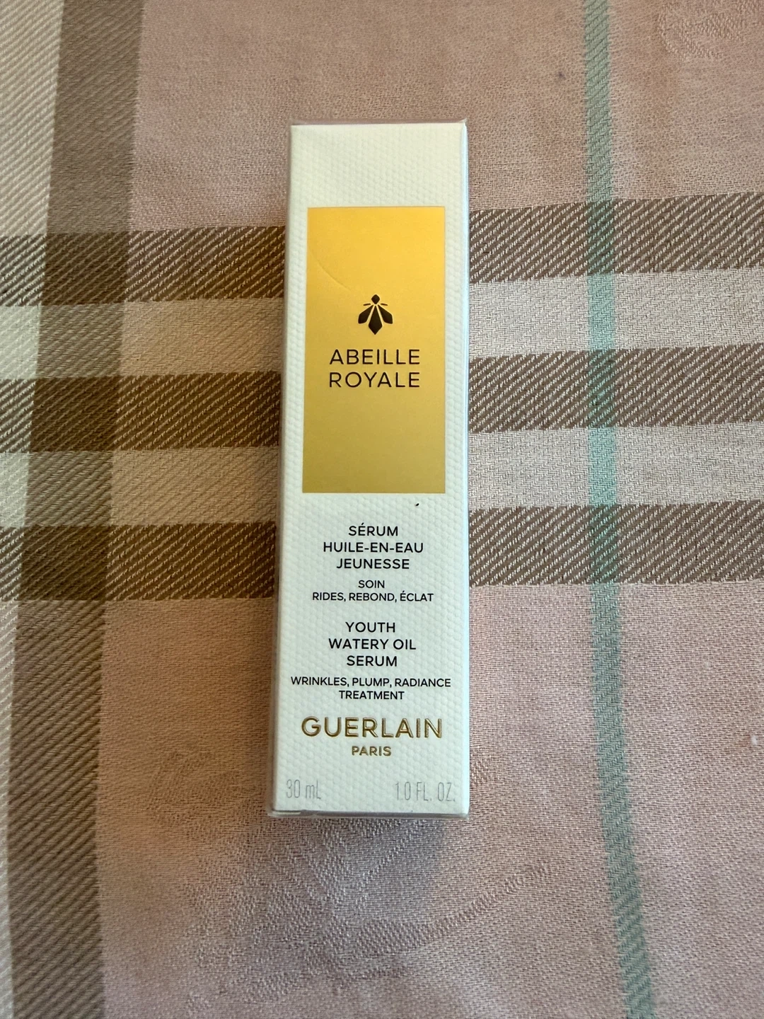 This is the Guerlain Abeille Royale Youth Watery Oil Serum. It's for wrinkles, plumpness, and radiance treatment. The bottle contains 30 mL (1.0 FL. OZ.).