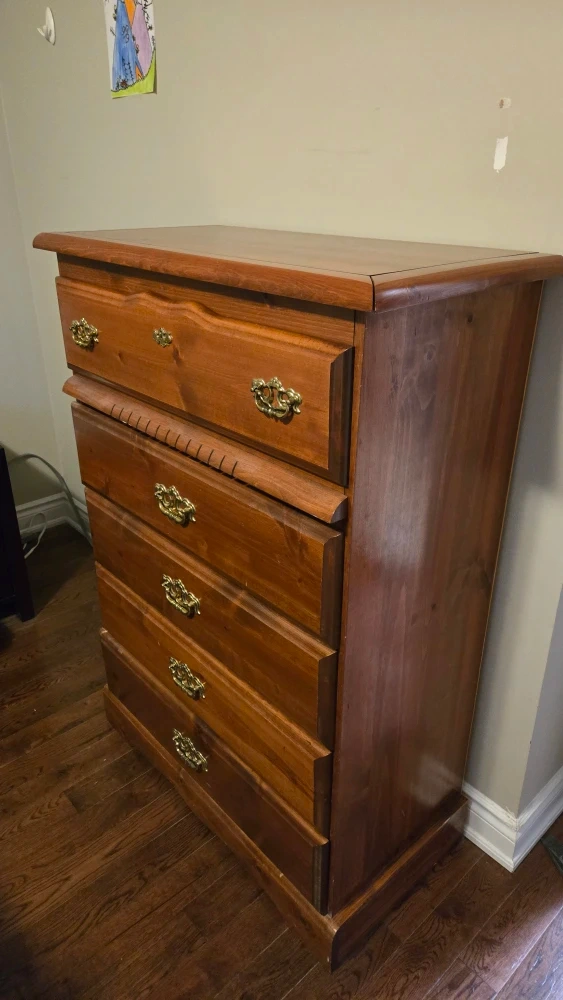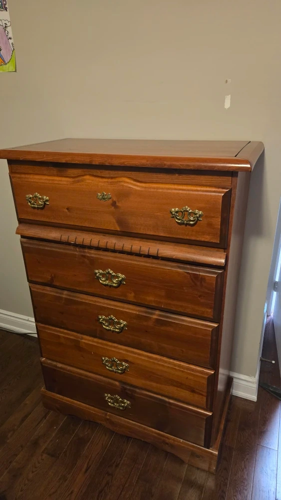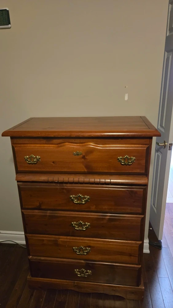 A classic wooden chest of drawers with five spacious drawers. It's made of solid wood with decorative brass handles. This piece offers ample storage for clothing or linens.
