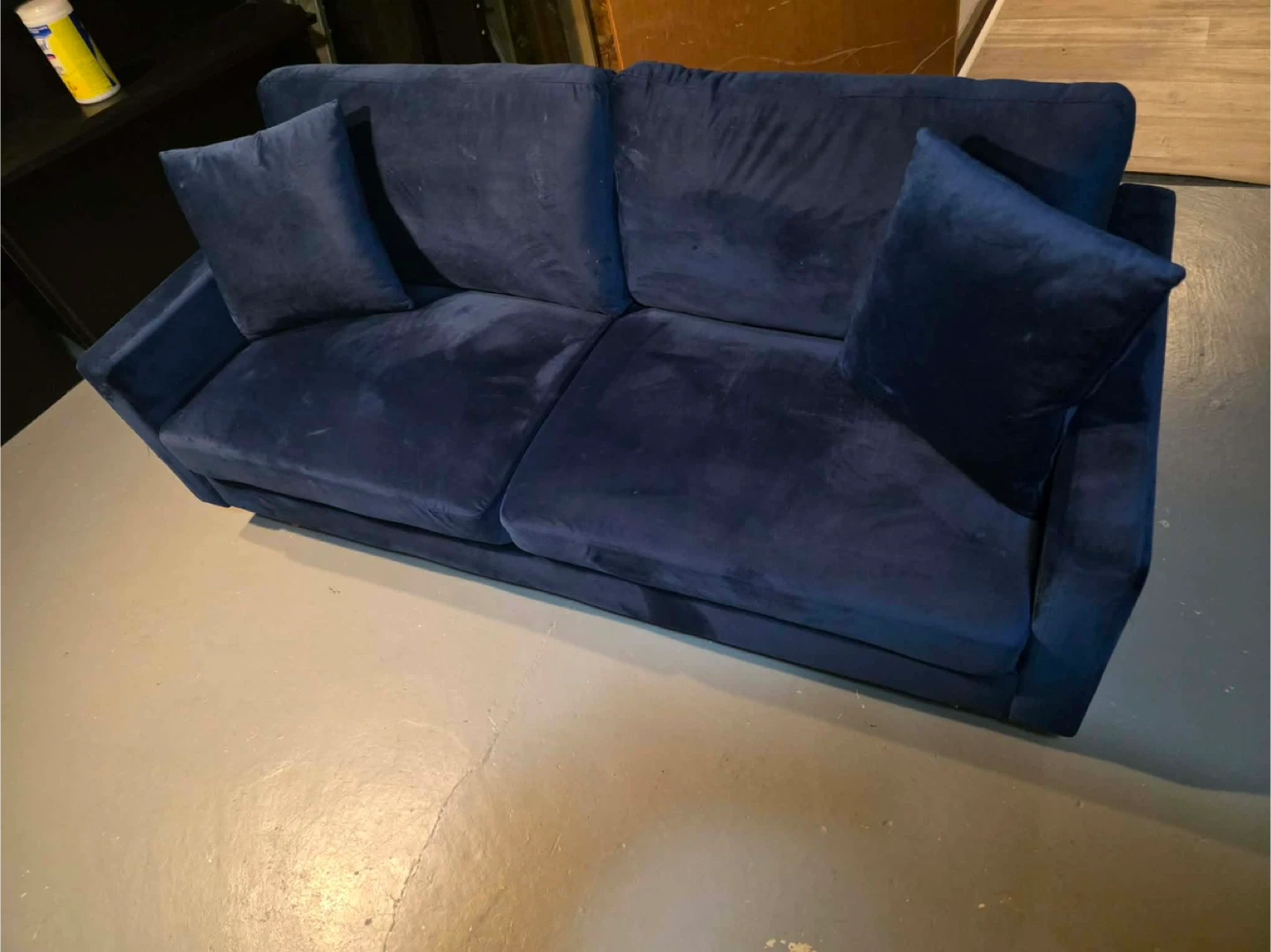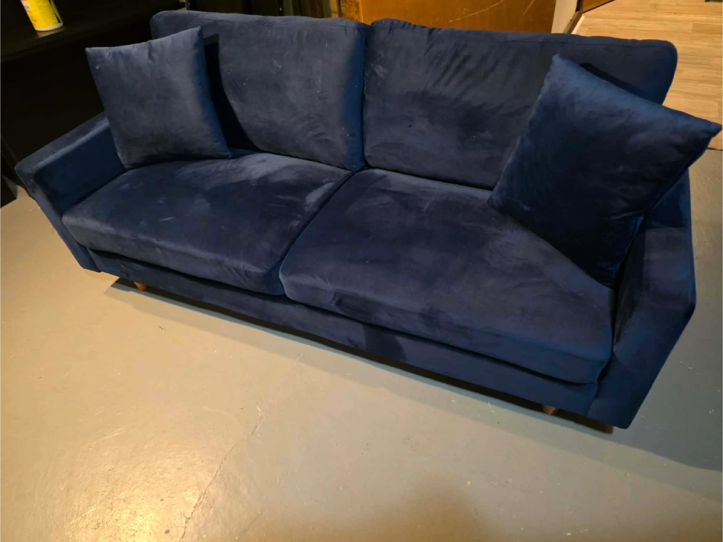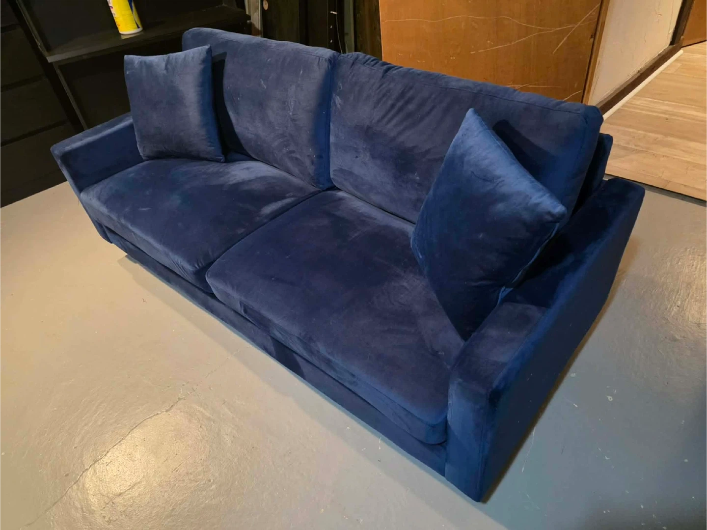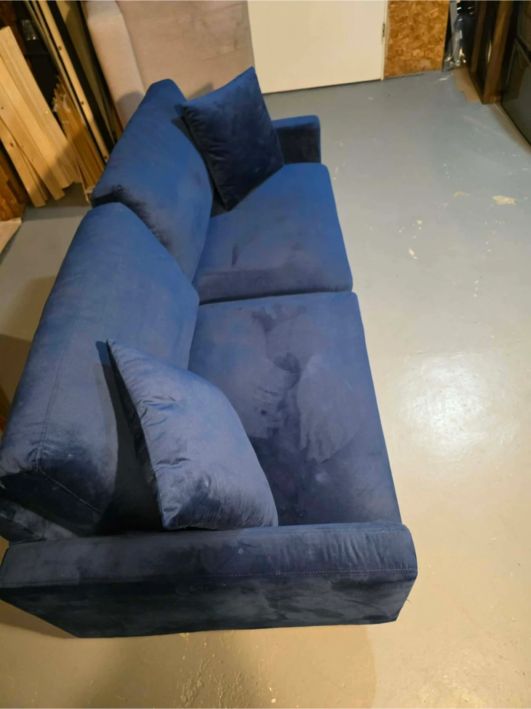 This is a comfy blue velvet sofa, perfect for lounging. It comes with several throw pillows. Plush fabric adds a touch of coziness home delivery available