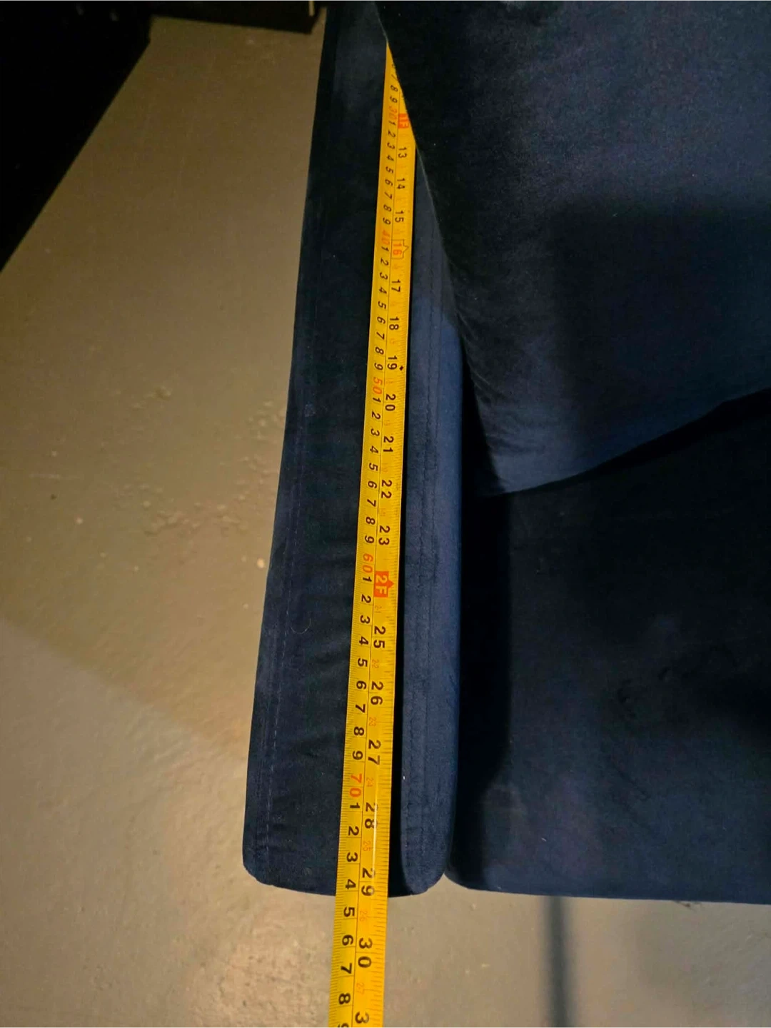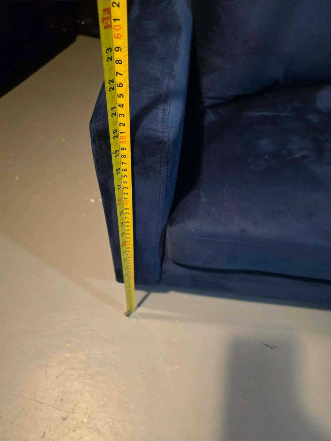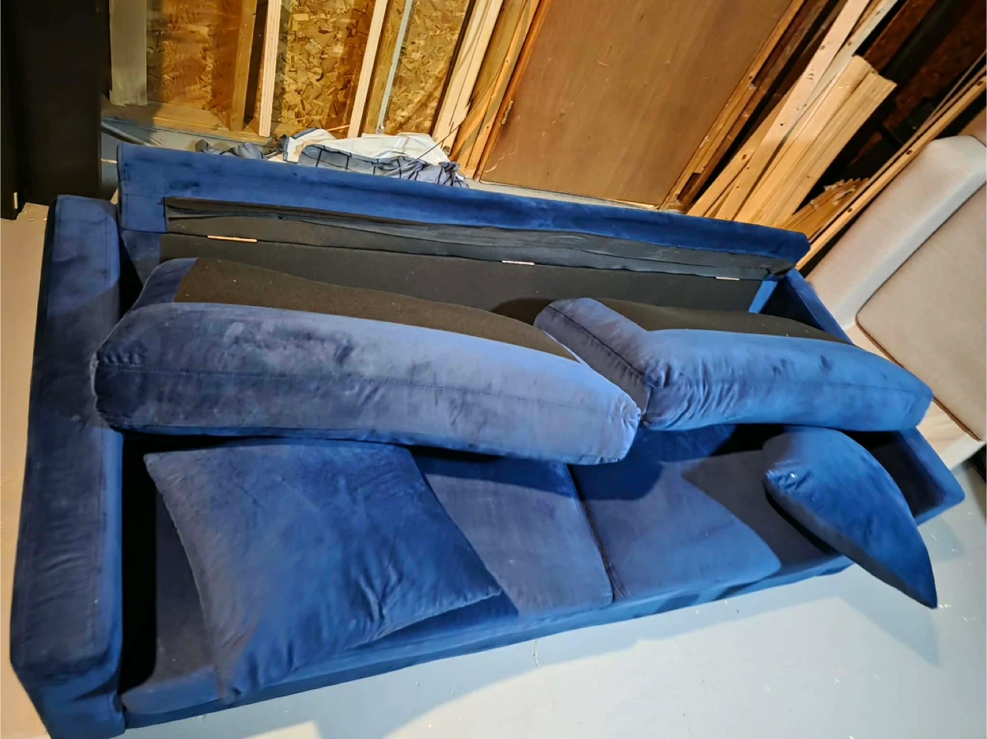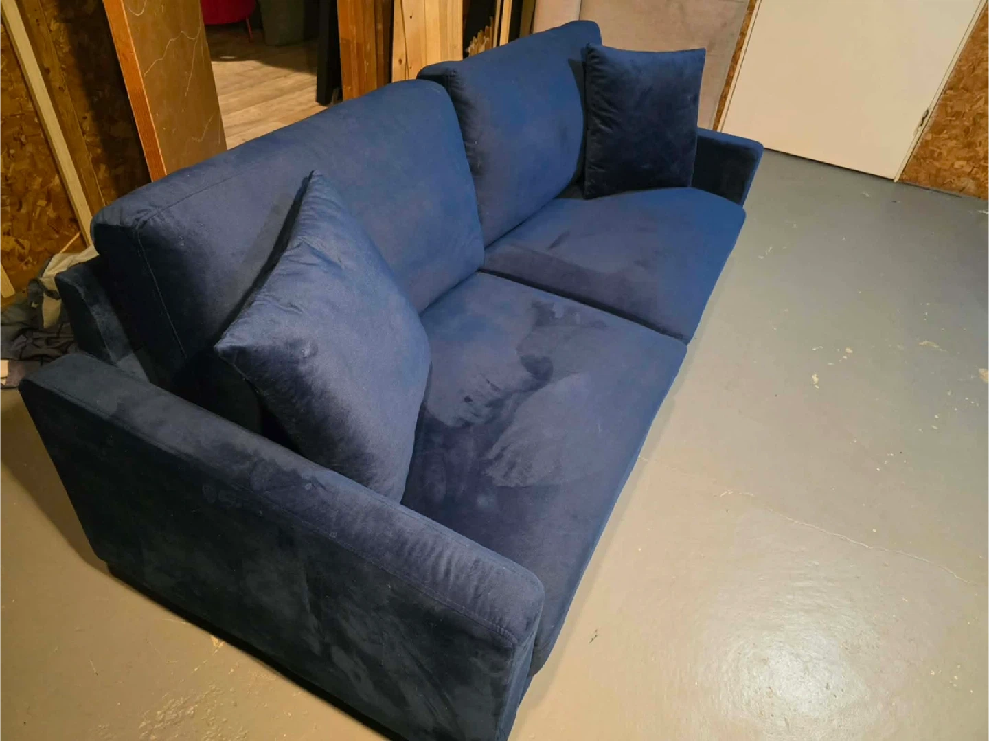 This is a comfy blue velvet sofa, perfect for lounging. It comes with several throw pillows. Plush fabric adds a touch of coziness home delivery available
