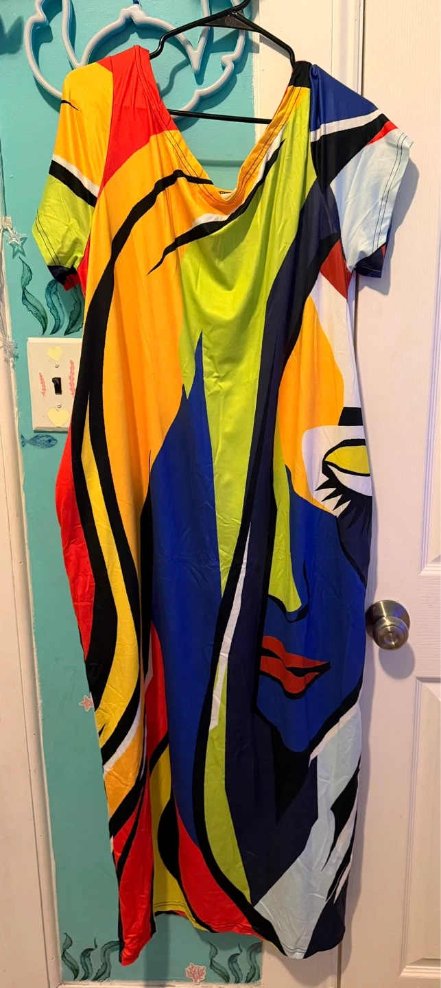 SHEIN CURVE maxi dress in size 2XL. It's a vibrant abstract print with short sleeves. Made with a polyester and elastane blend. Great for casual wear or beach outings! With pockets.