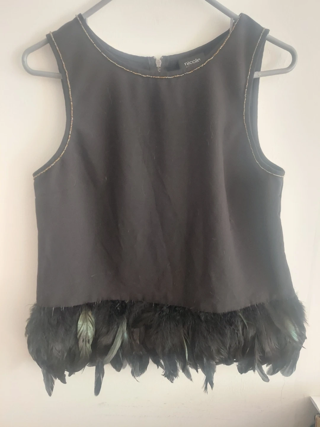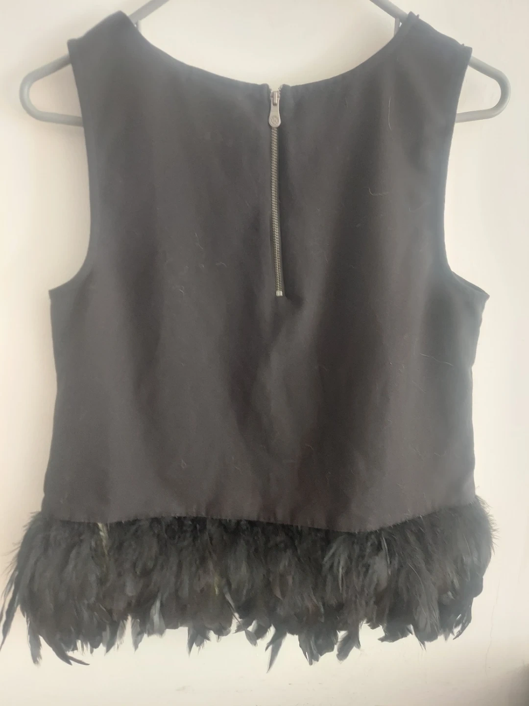 This black sleeveless top features a beaded neckline and a playful feather trim at the hem. It has a zip closure at the back. Feather trim detail.