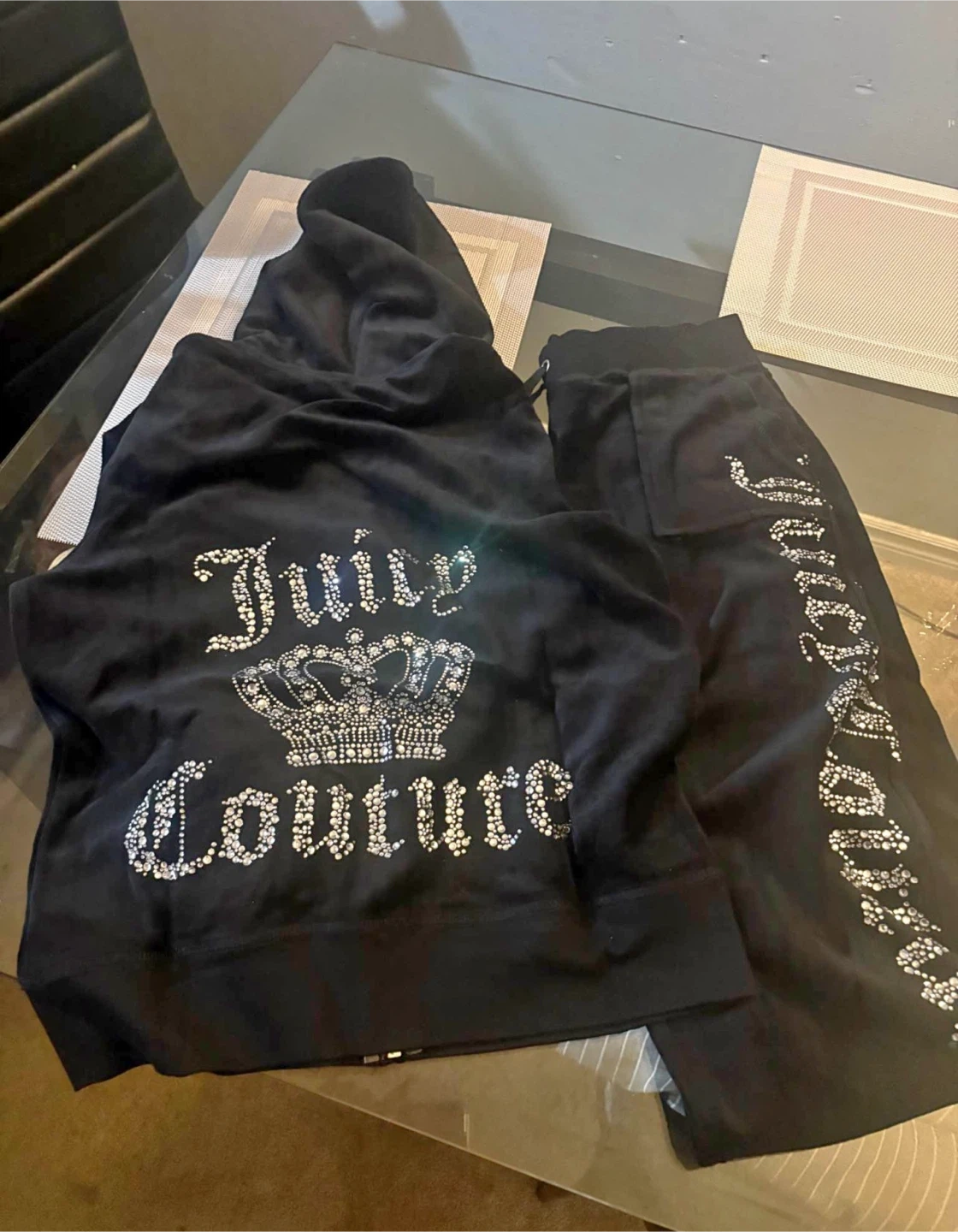 Selling a Juicy Couture tracksuit set in black! The set includes a hoodie and pants, both with the iconic Juicy Couture logo in rhinestones. It's in great condition and ready for a new owner! Only worn 2-3 times and no longer fits me.