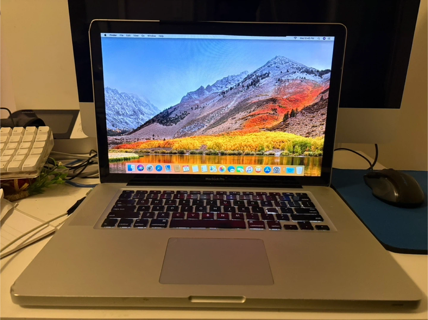 This is a pre-owned Apple MacBook Pro 15-inch laptop. It's silver and features a backlit keyboard. The screen displays a mountain landscape. It's a reliable machine for everyday tasks and creative work!