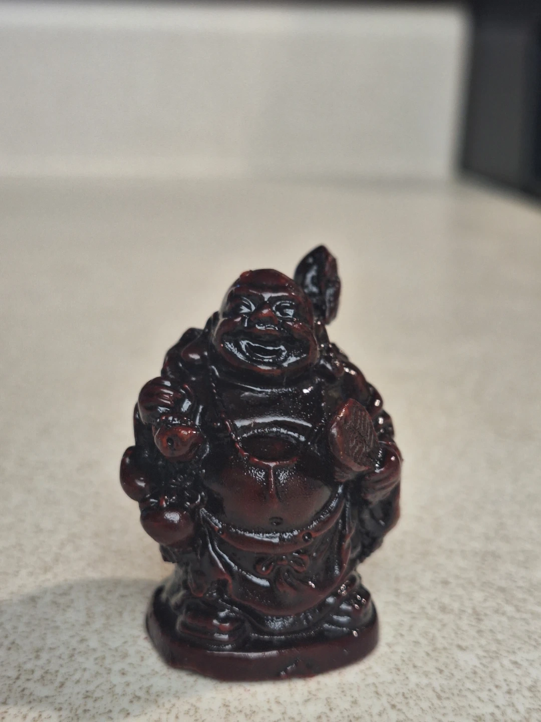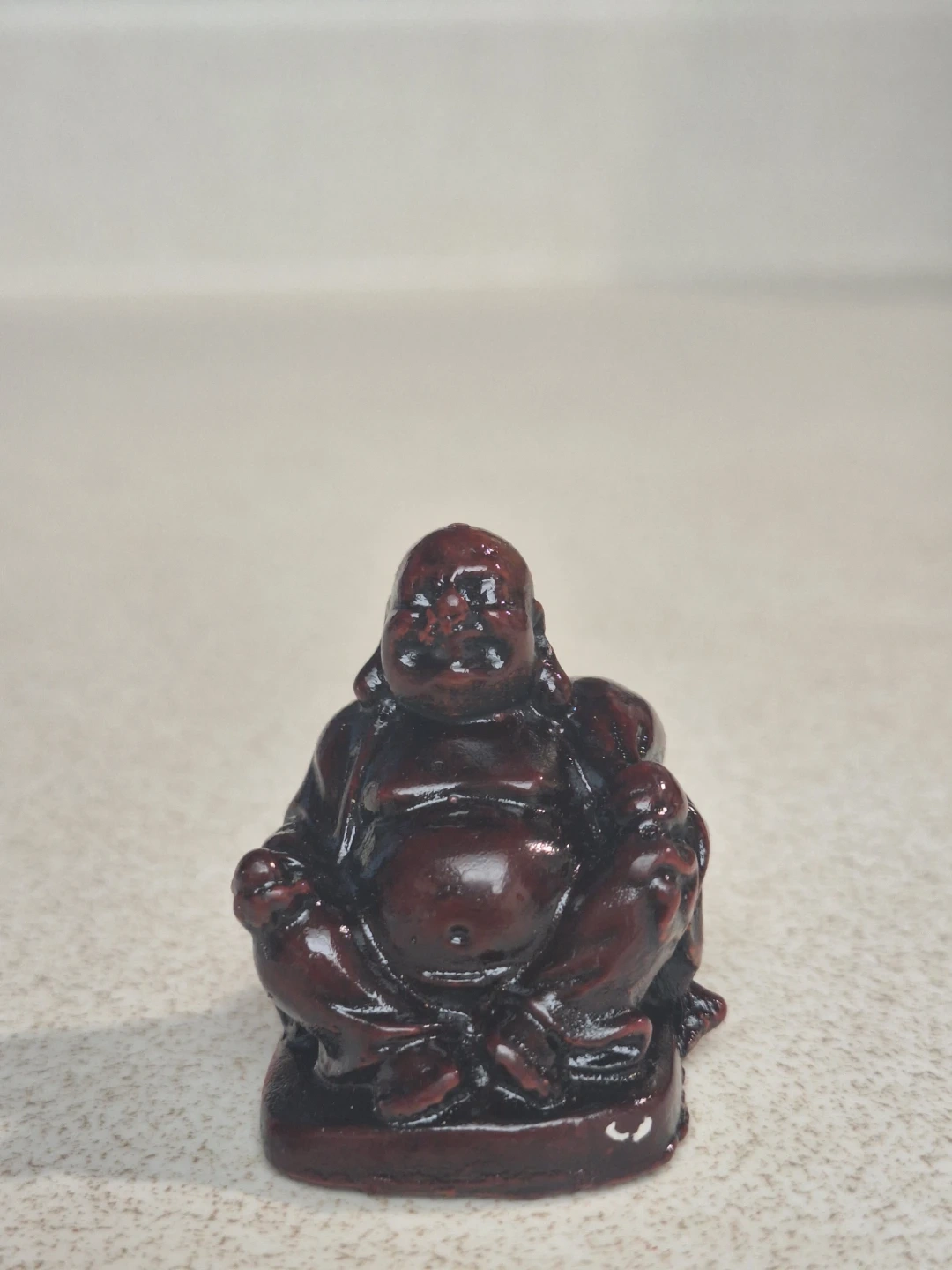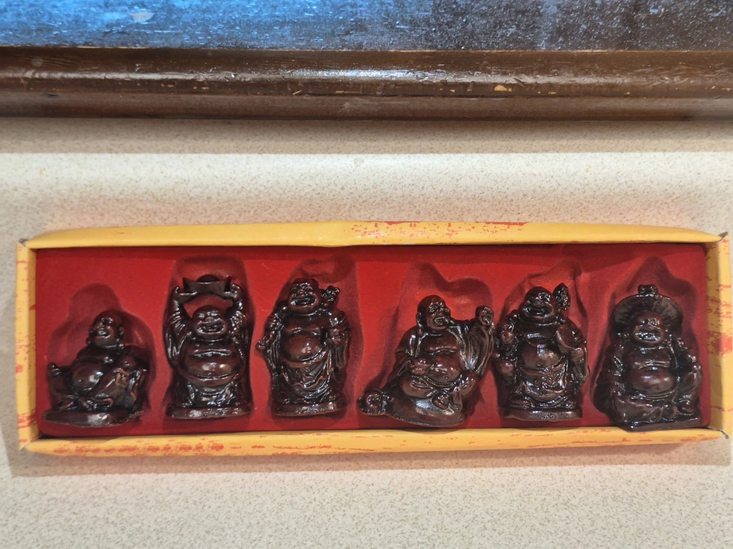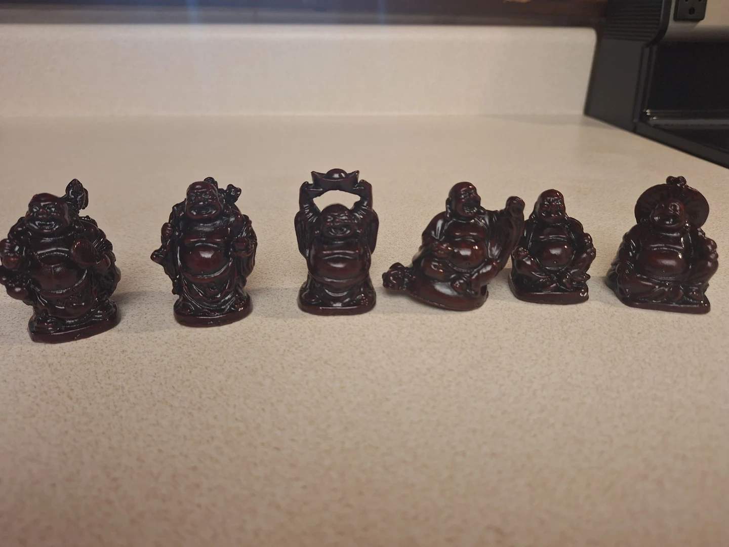 A set of 6 Lucky/Laughing Buddha. It's made of a dark, glossy resin. Laughing Buddha symbolizes joy and prosperity. It's good luck piece for a desk or store front or cash register.
