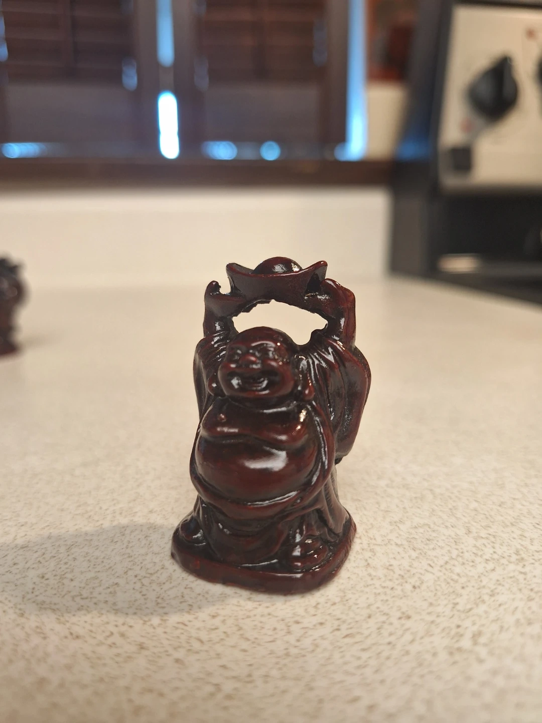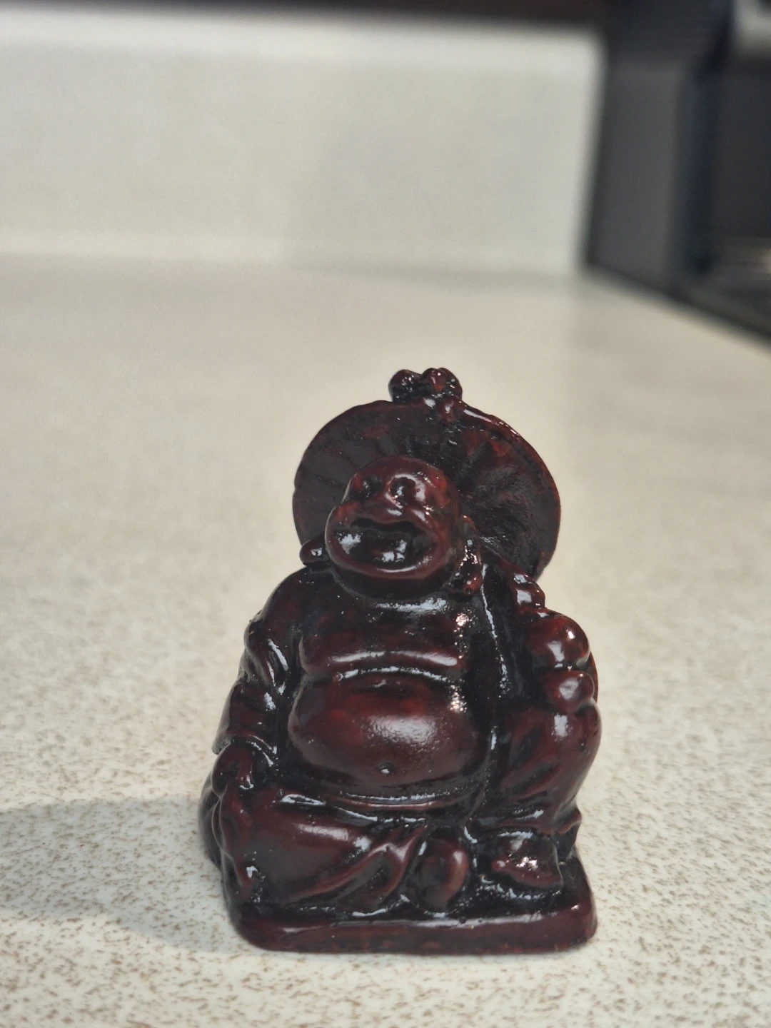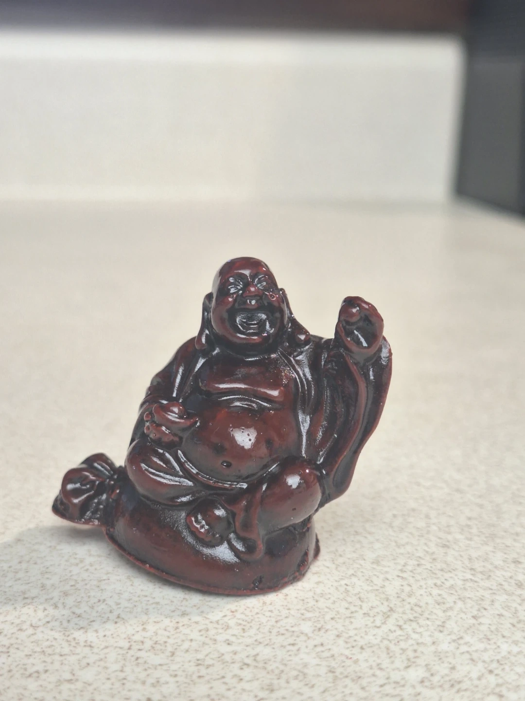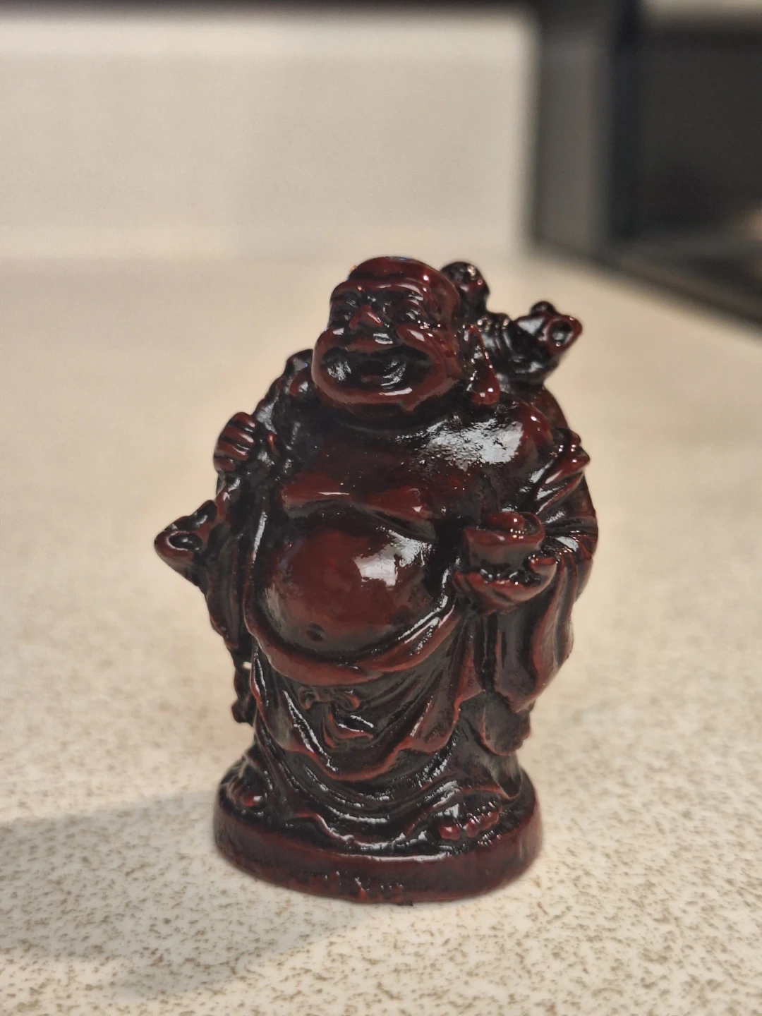 A set of 6 Lucky/Laughing Buddha. It's made of a dark, glossy resin. Laughing Buddha symbolizes joy and prosperity. It's good luck piece for a desk or store front or cash register.
