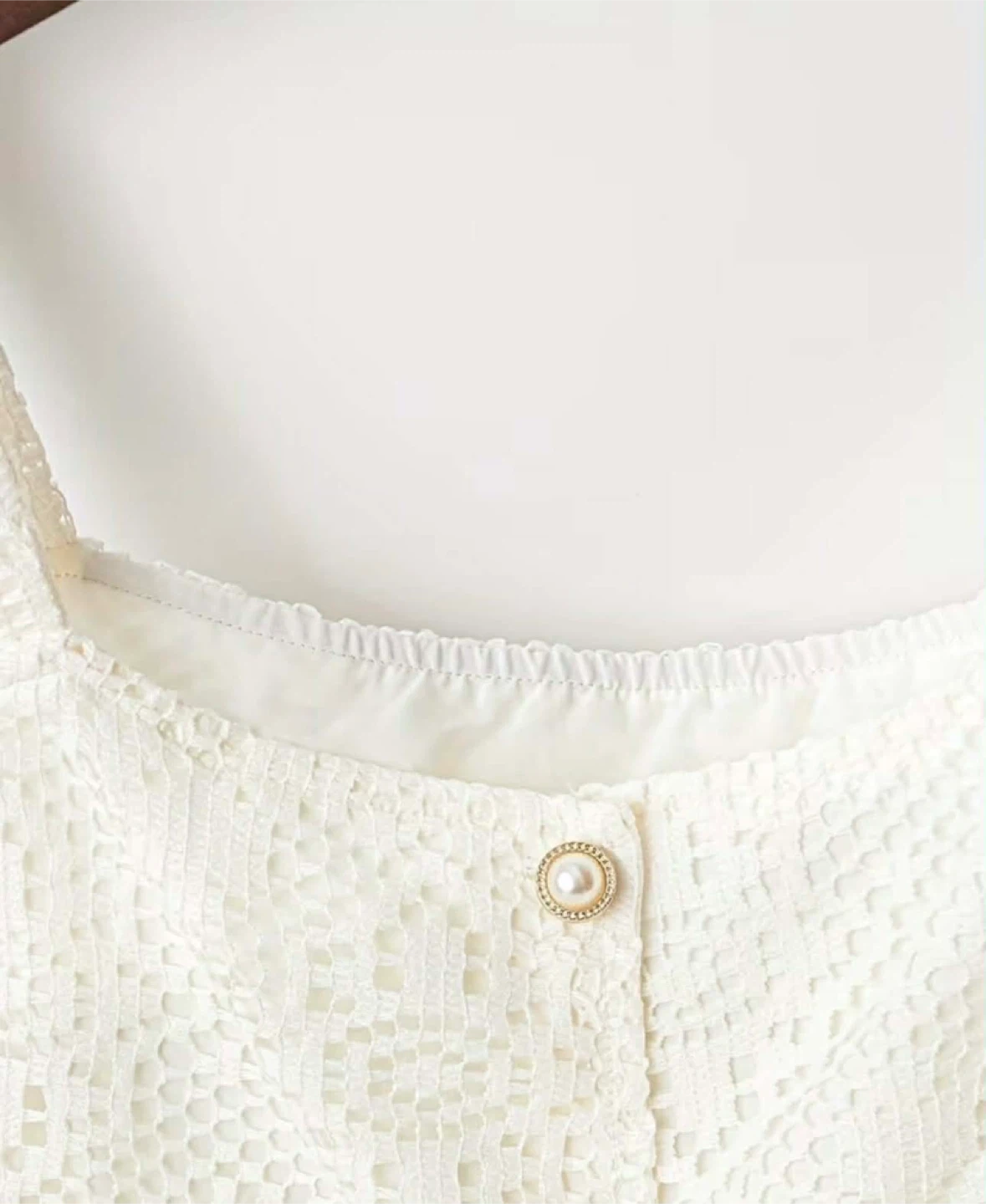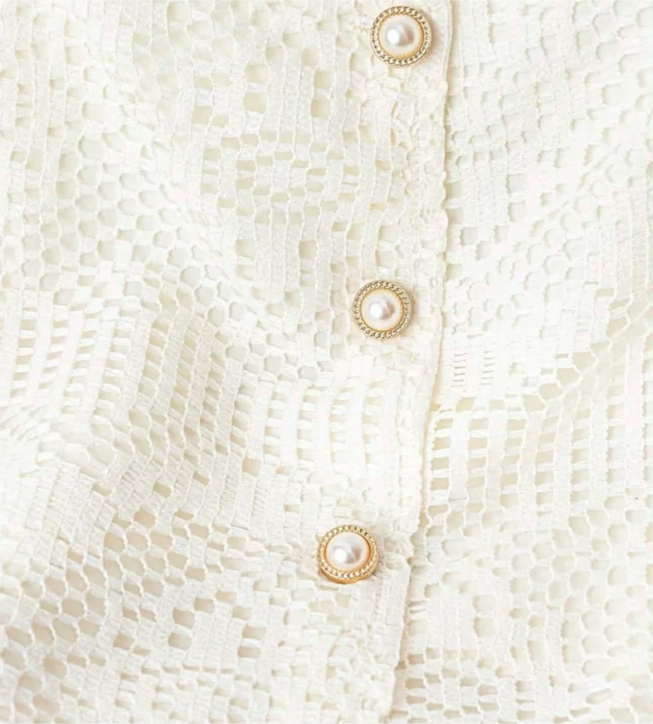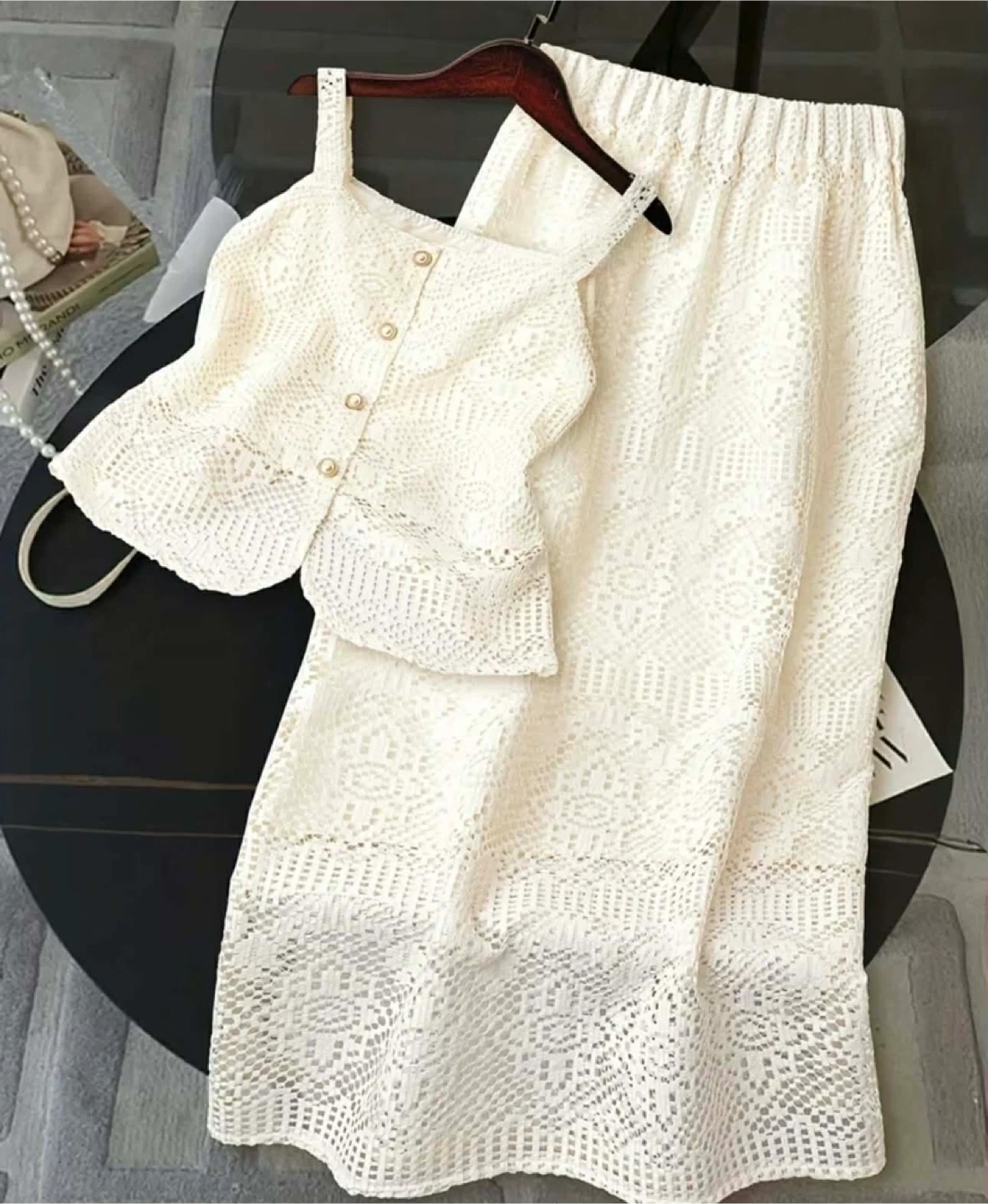 Two-piece outfit featuring a white lace crop top with pearl-button closure and matching midi skirt. Delicate floral pattern throughout.
