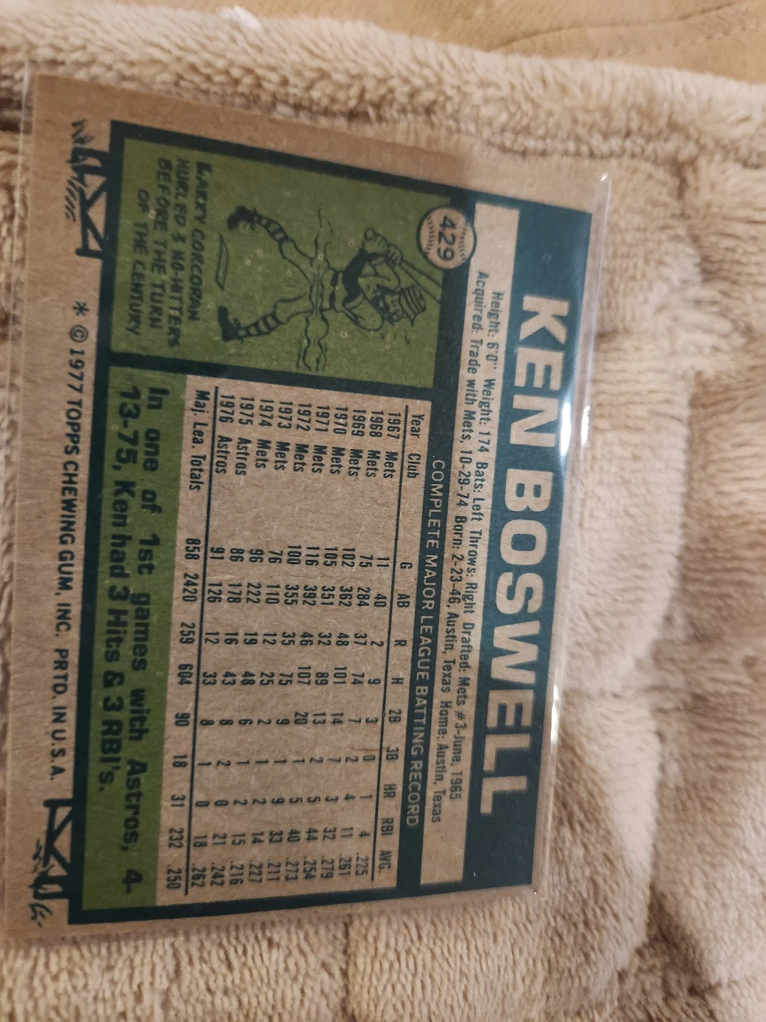 1977 Topps baseball card featuring Ken Boswell of the Houston Astros. The card includes his career statistics and biographical information. Card number is 429. Printed in the USA.