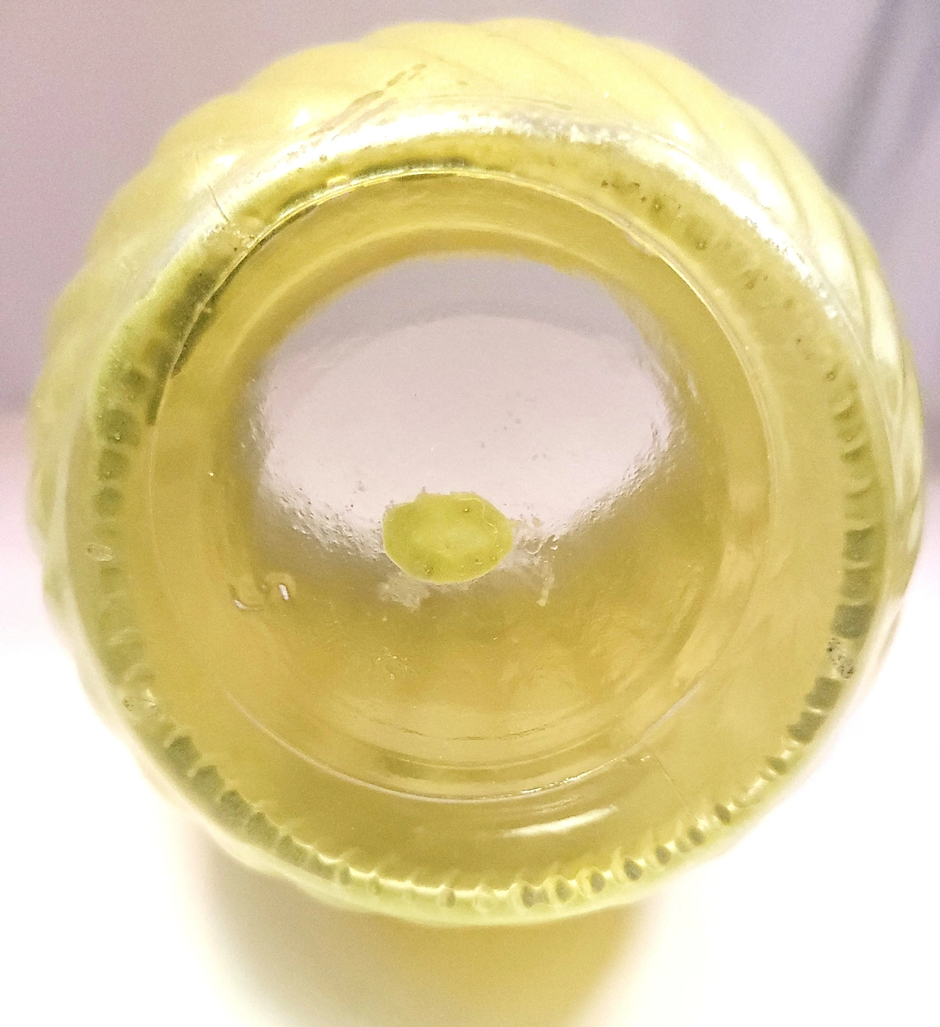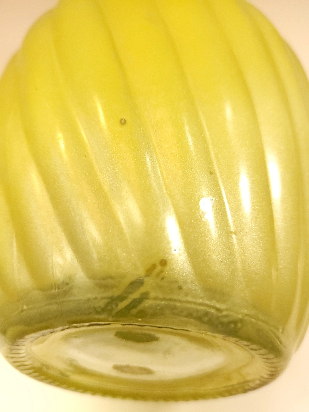 The glass remains structurally sound with no chips, cracks, or repairs. There are visible surface scratches on the body of the vase and typical shelf wear/roughness on the bottom surface, as shown in the provided photos. Please review the close-up images of the scratches and the base to ensure satisfaction with the condition.
