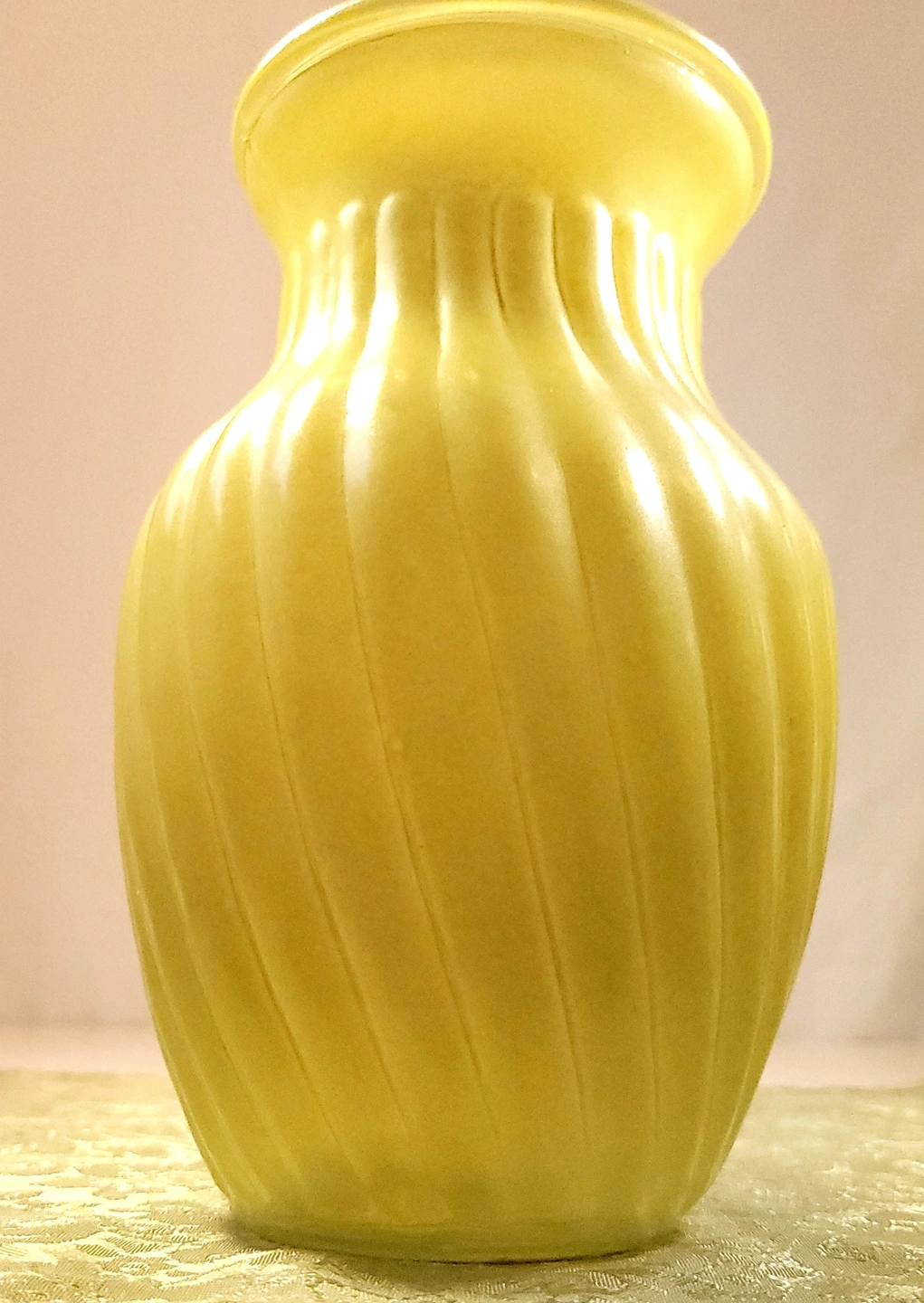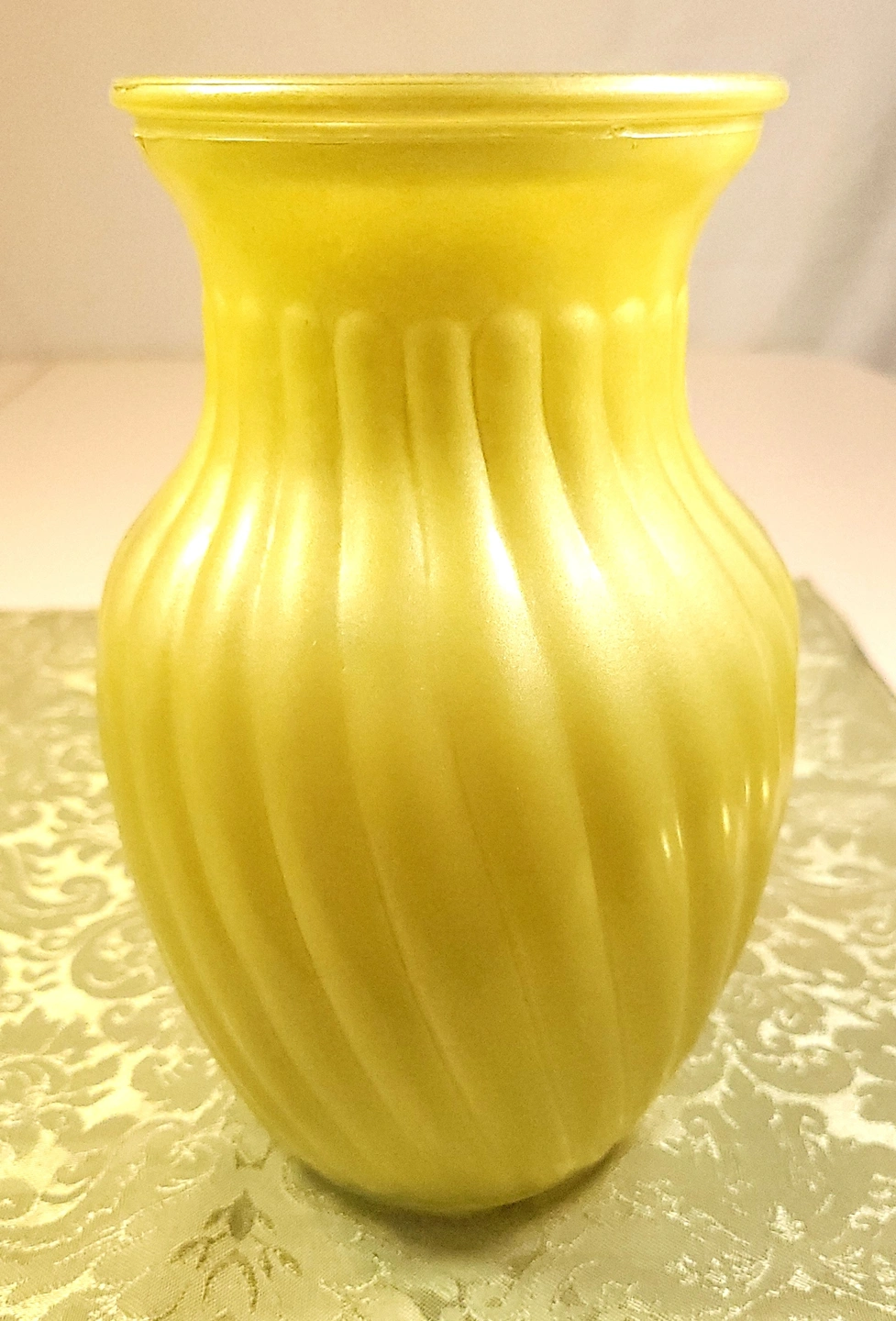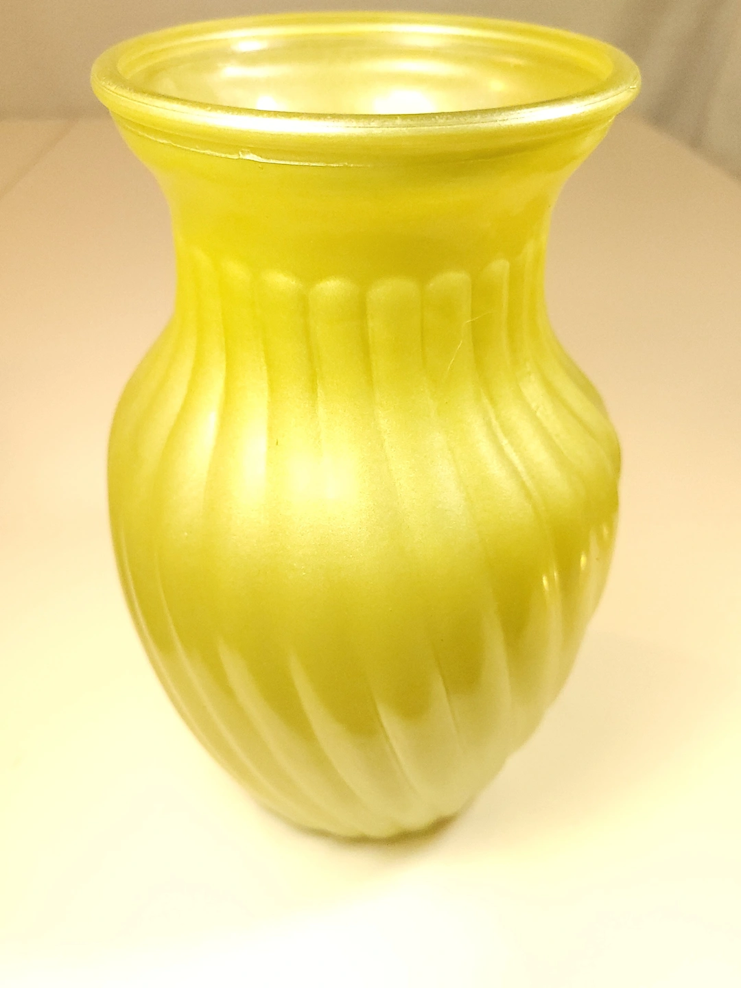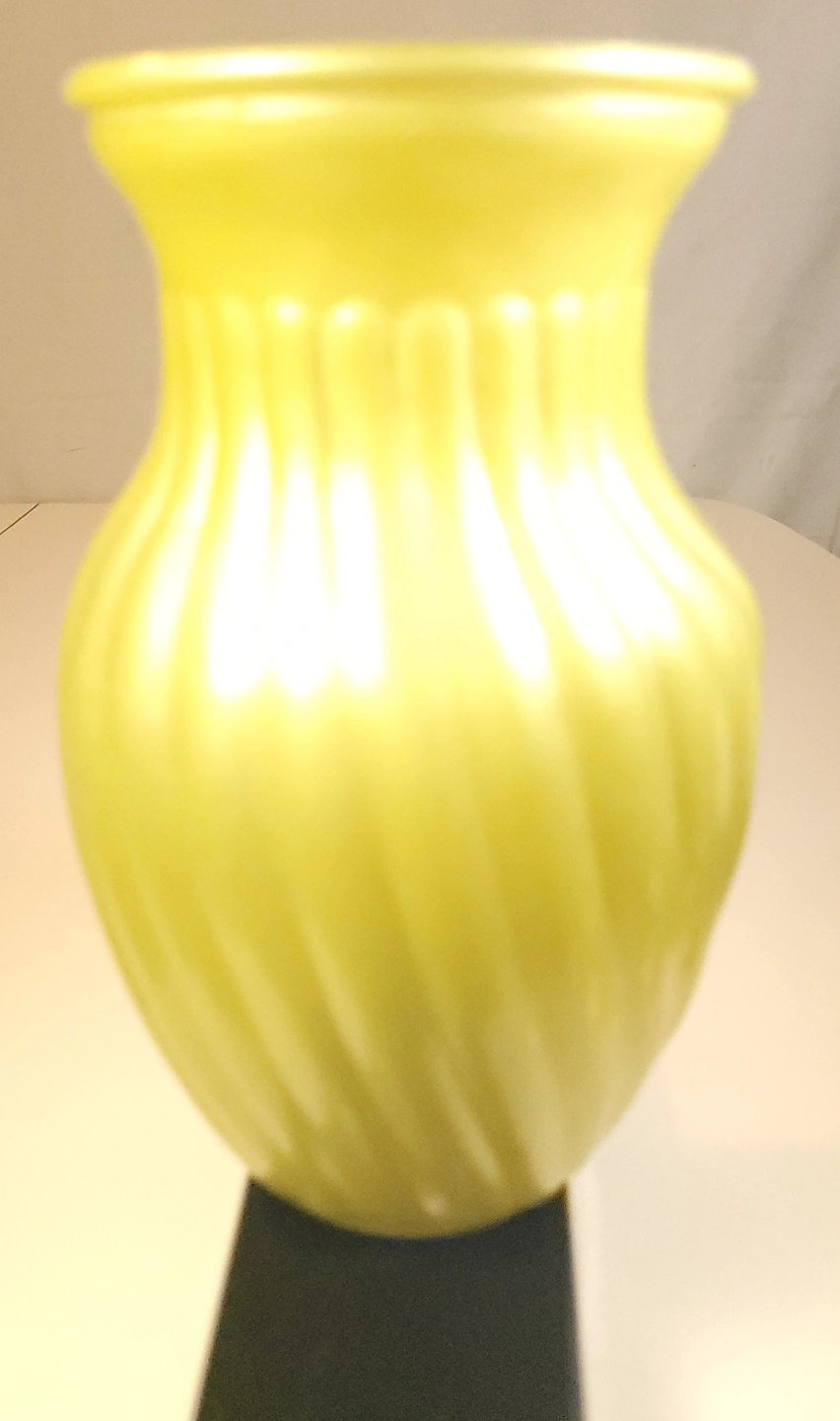 This striking mid-century vase features a vibrant "sunny yellow" satin finish with a classic swirl optic (ribbed) pattern. This is high-quality cased glass, meaning the bright yellow exterior is layered over a crisp white interior, giving the piece excellent color depth and a substantial weight.