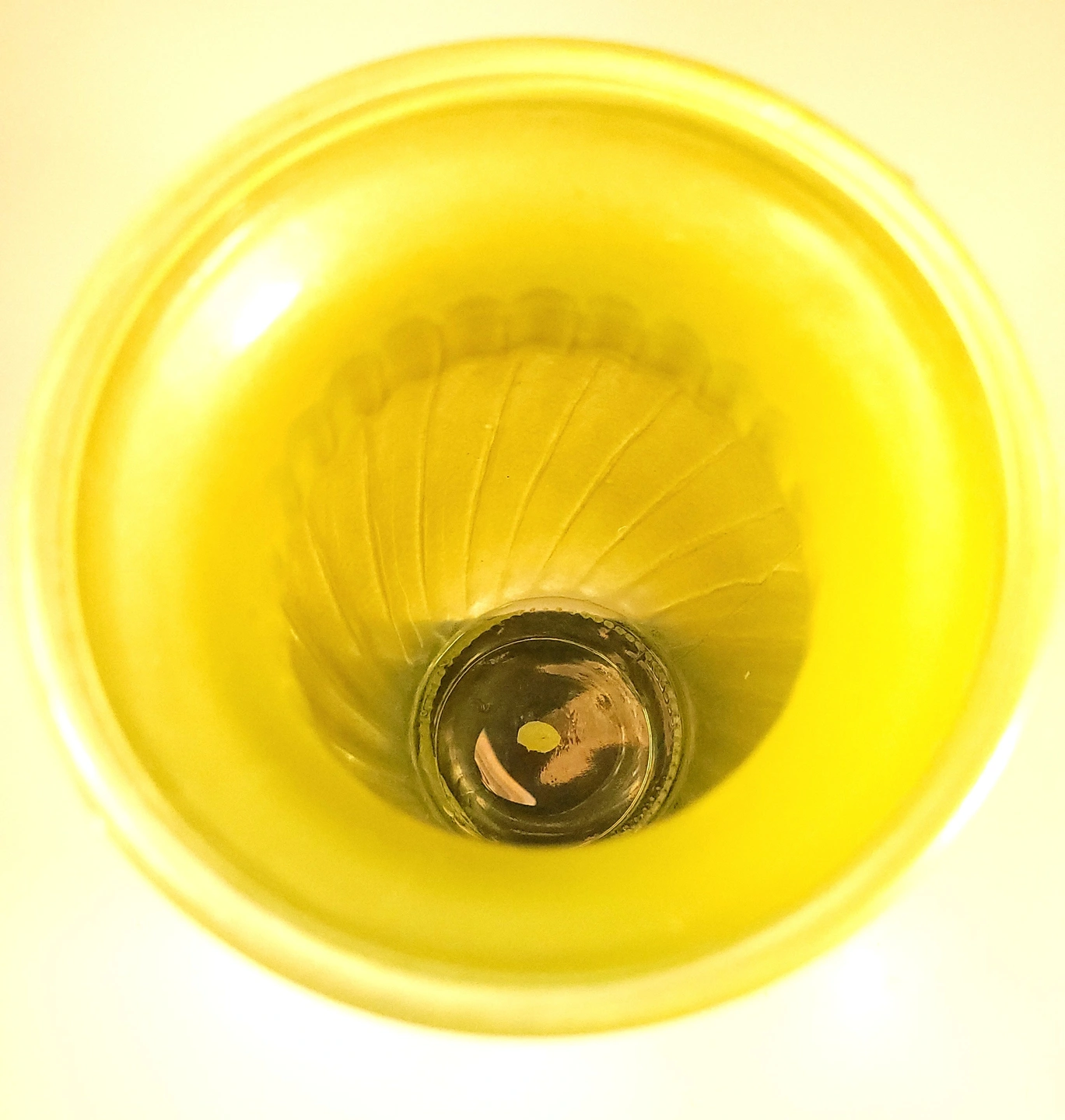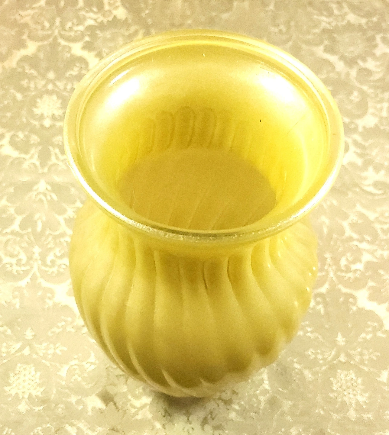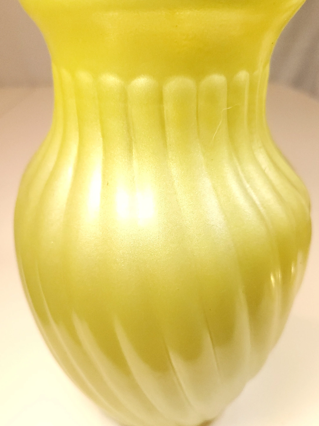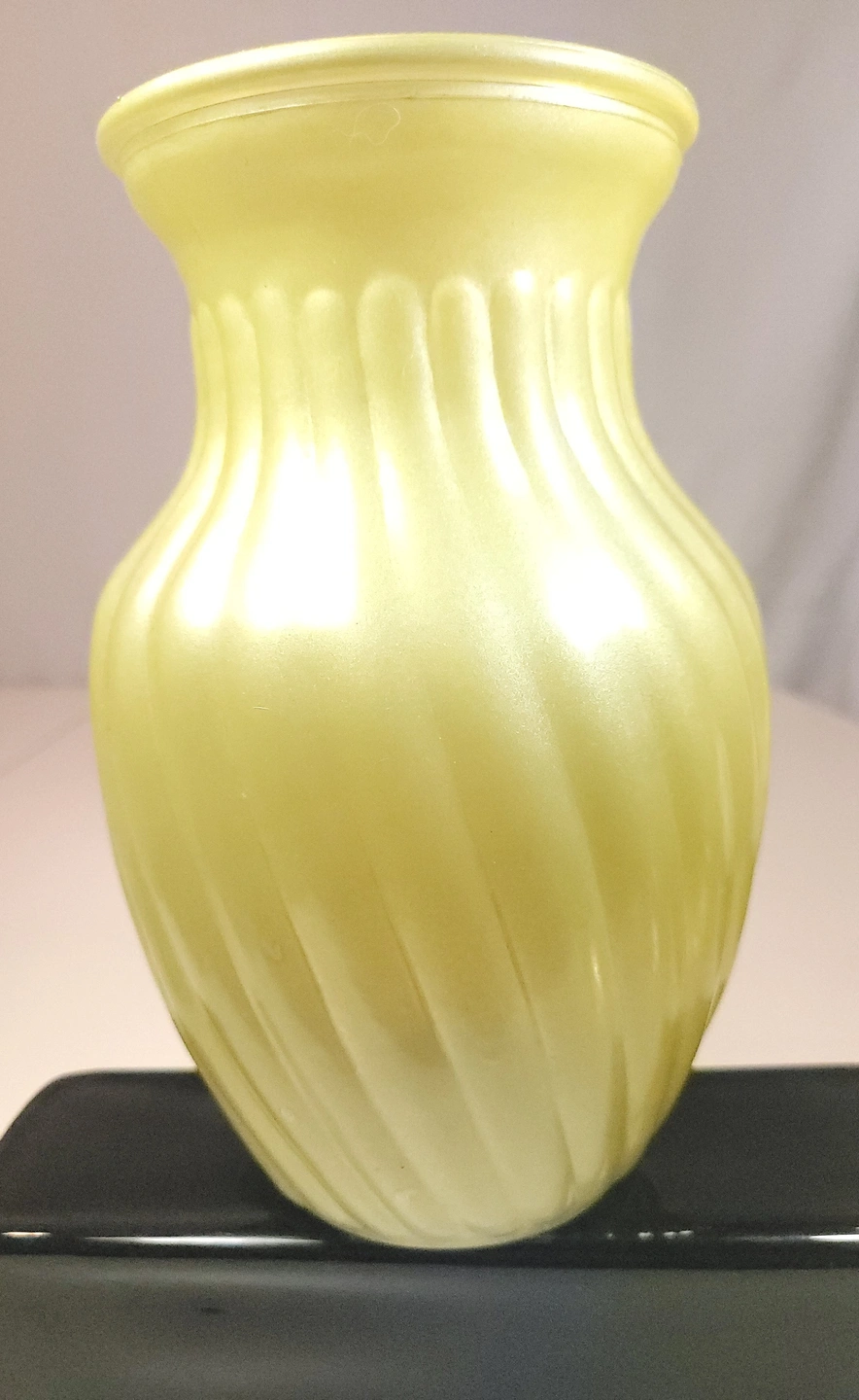 This striking mid-century vase features a vibrant "sunny yellow" satin finish with a classic swirl optic (ribbed) pattern. This is high-quality cased glass, meaning the bright yellow exterior is layered over a crisp white interior, giving the piece excellent color depth and a substantial weight.