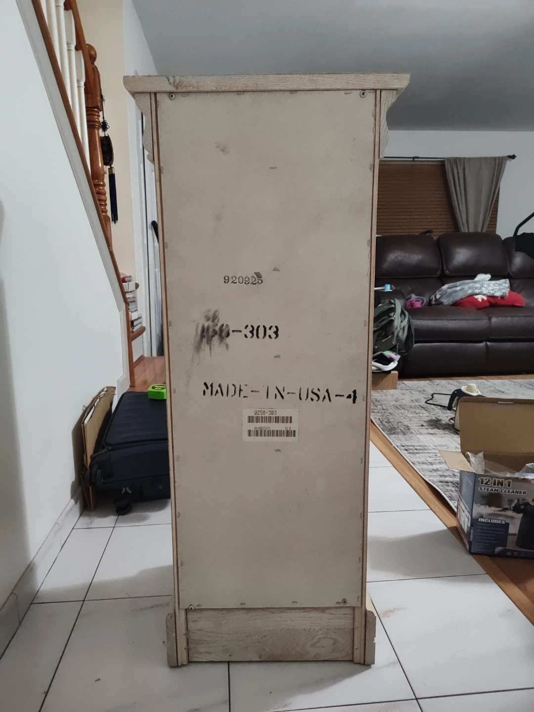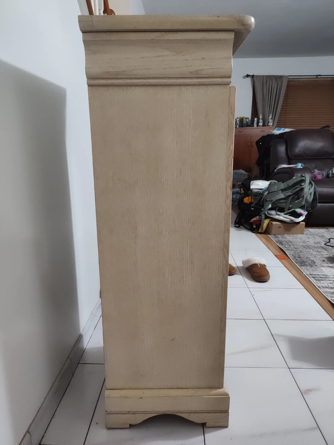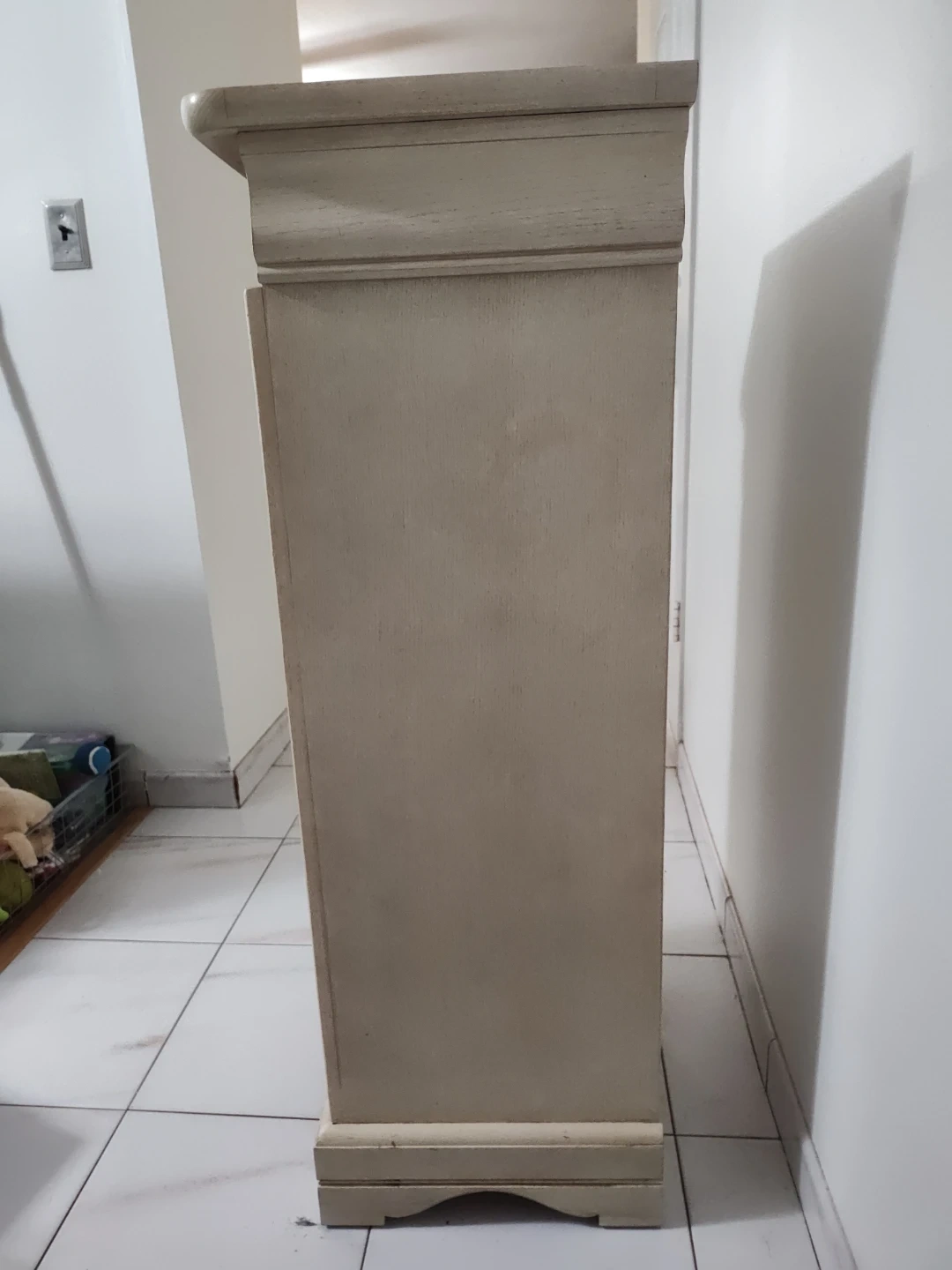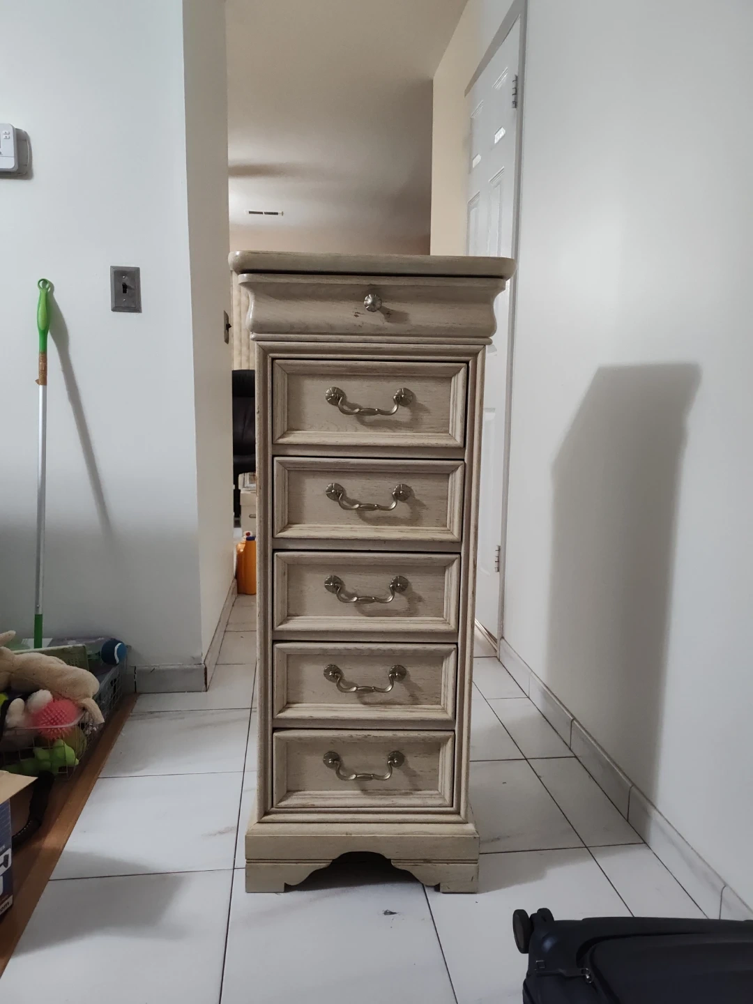 A tall, narrow chest of drawers made by Lington. It has five drawers with ornate brass pulls. The wood has a distressed finish and the top has a decorative molding. Perfect for small spaces!