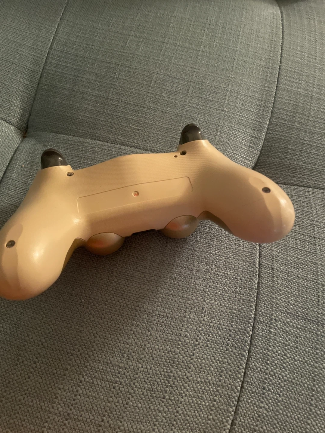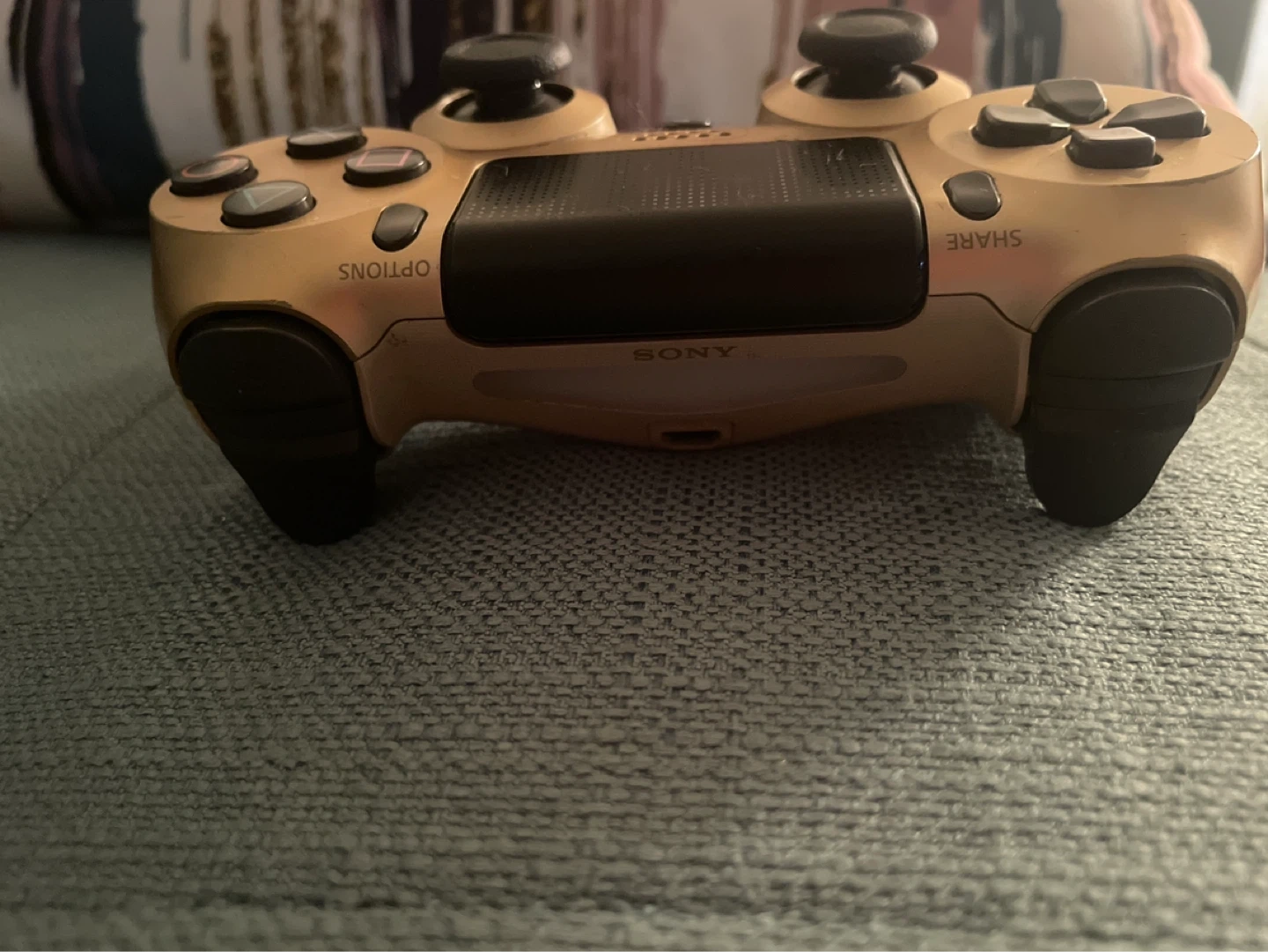 This is a gold-coloured PlayStation 4 DualShock 4 controller. It's a wireless controller with standard button layout. It's a great addition for any gamer looking for a stylish controller.