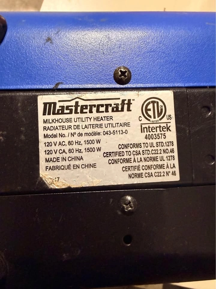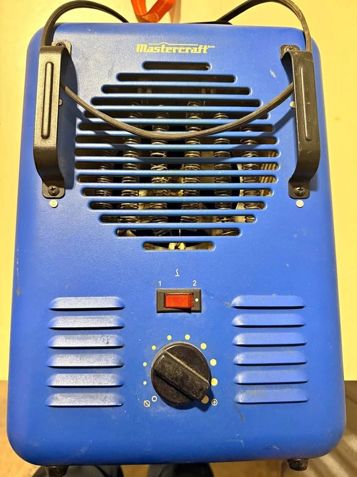 It features two heat settings (1300W and 1500W) and an adjustable thermostat. It has all-metal construction with a carrying handle for portability, designed for use in garages or workshops. The heater includes tip-over protection, overheat protection, and a polarized plug. It is rated for 120V outlets and can be used for tasks like drying out basements or providing localized heat.