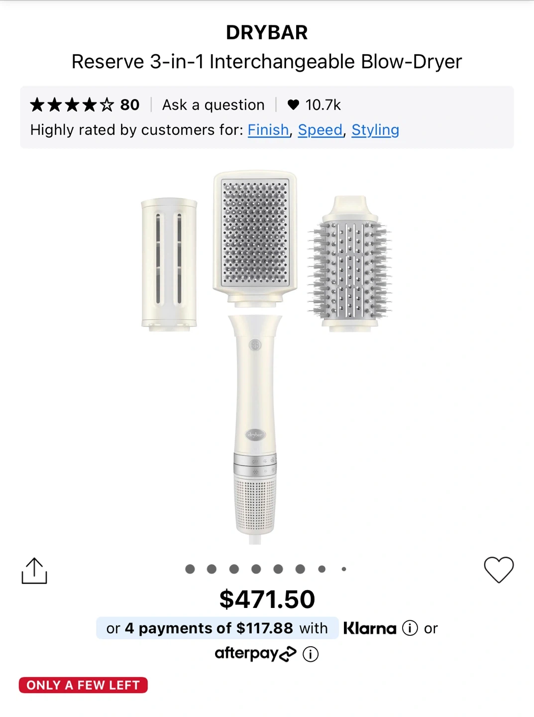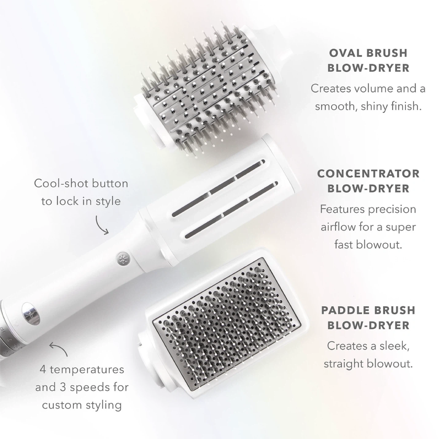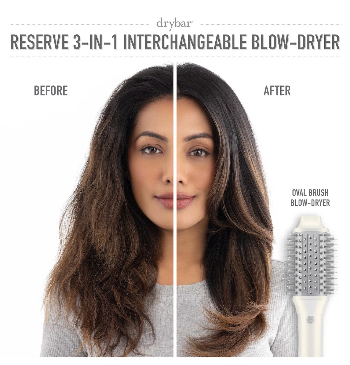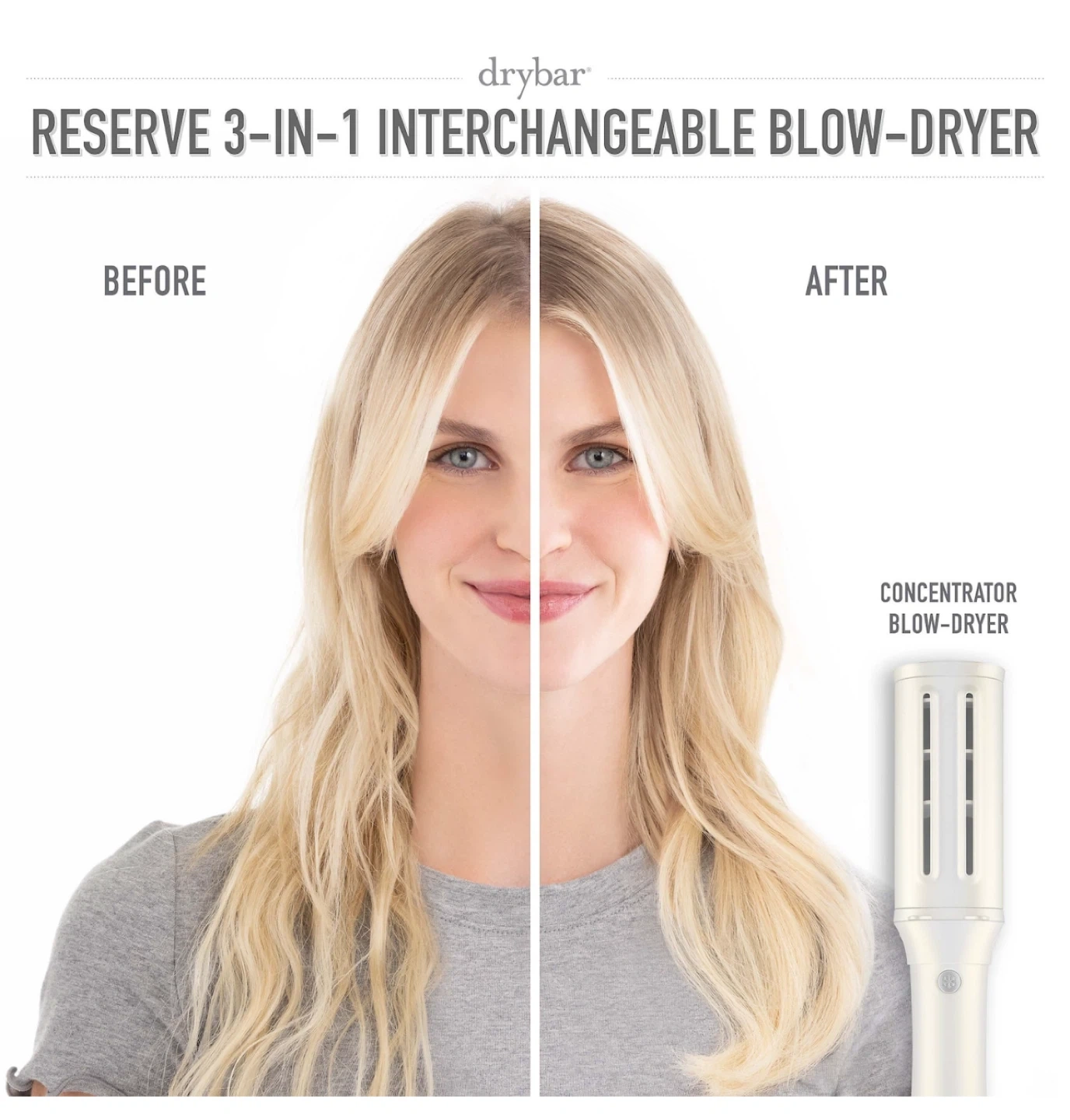 This is the Drybar Reserve 3-in-1 Interchangeable Blow-Dryer. It includes an oval brush attachment for volume and a smooth finish, a concentrator attachment for fast blowouts, and a paddle brush attachment for a sleek, straight finish. It has 4 temperatures and 3 speeds for custom styling.