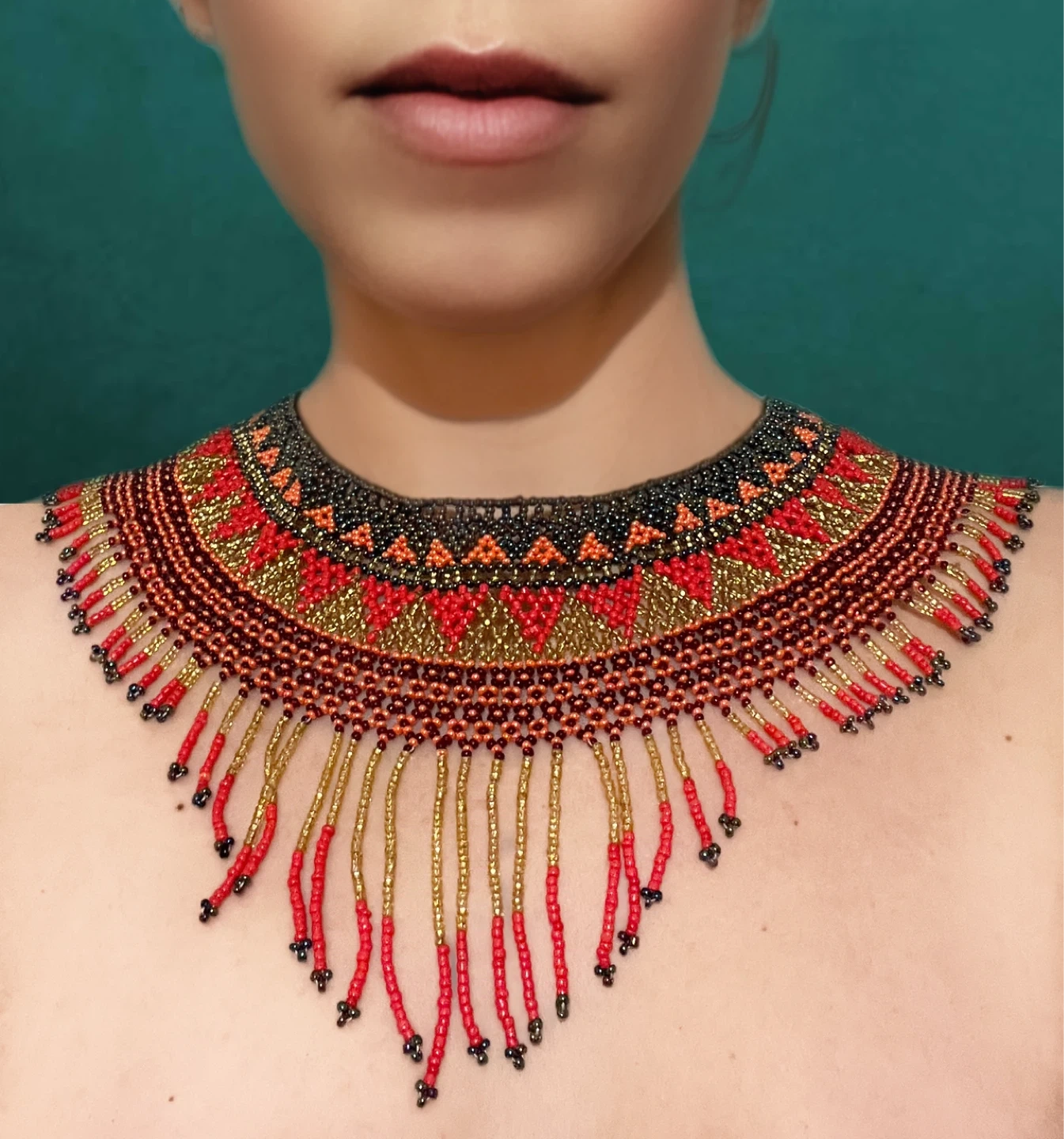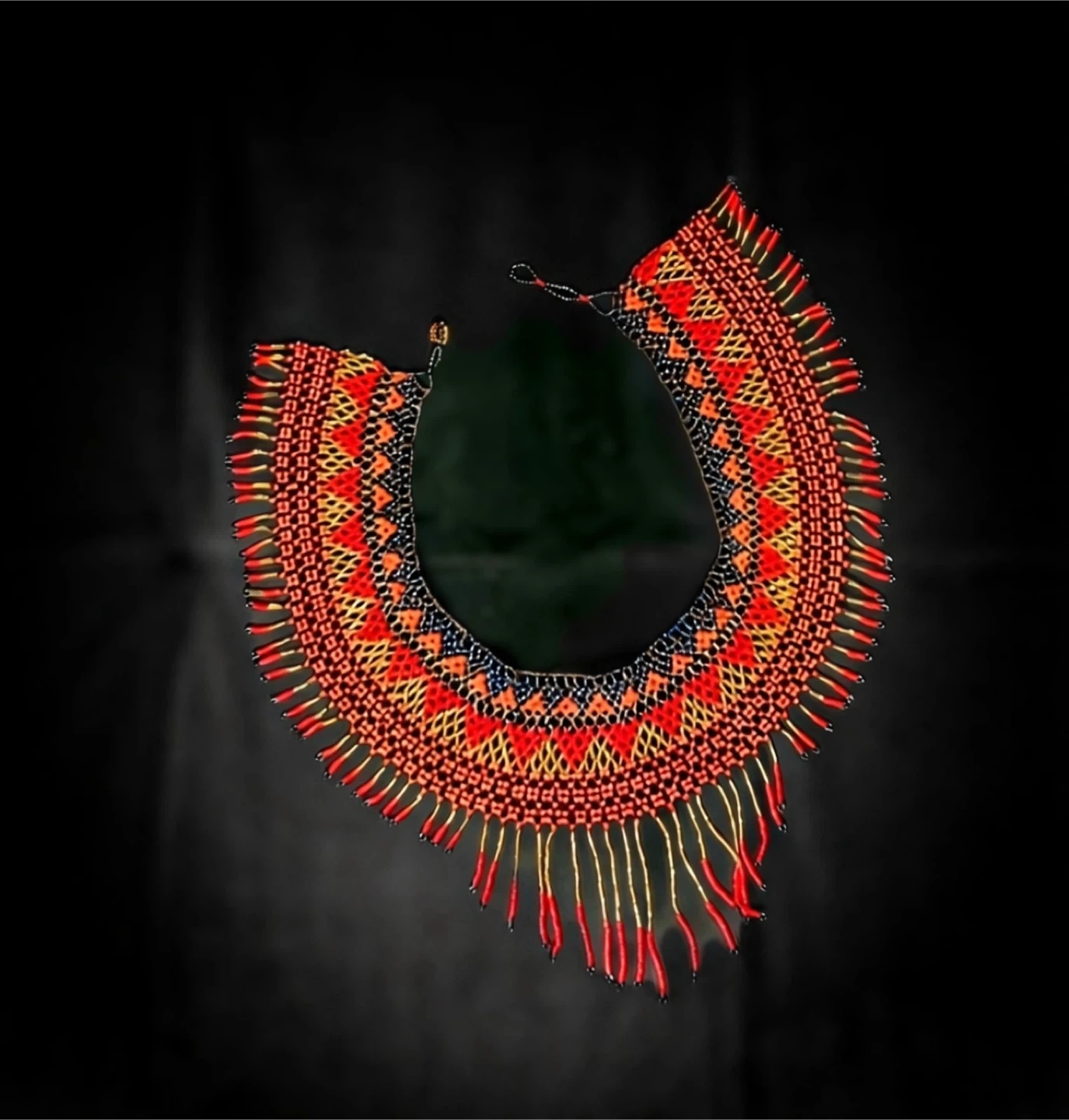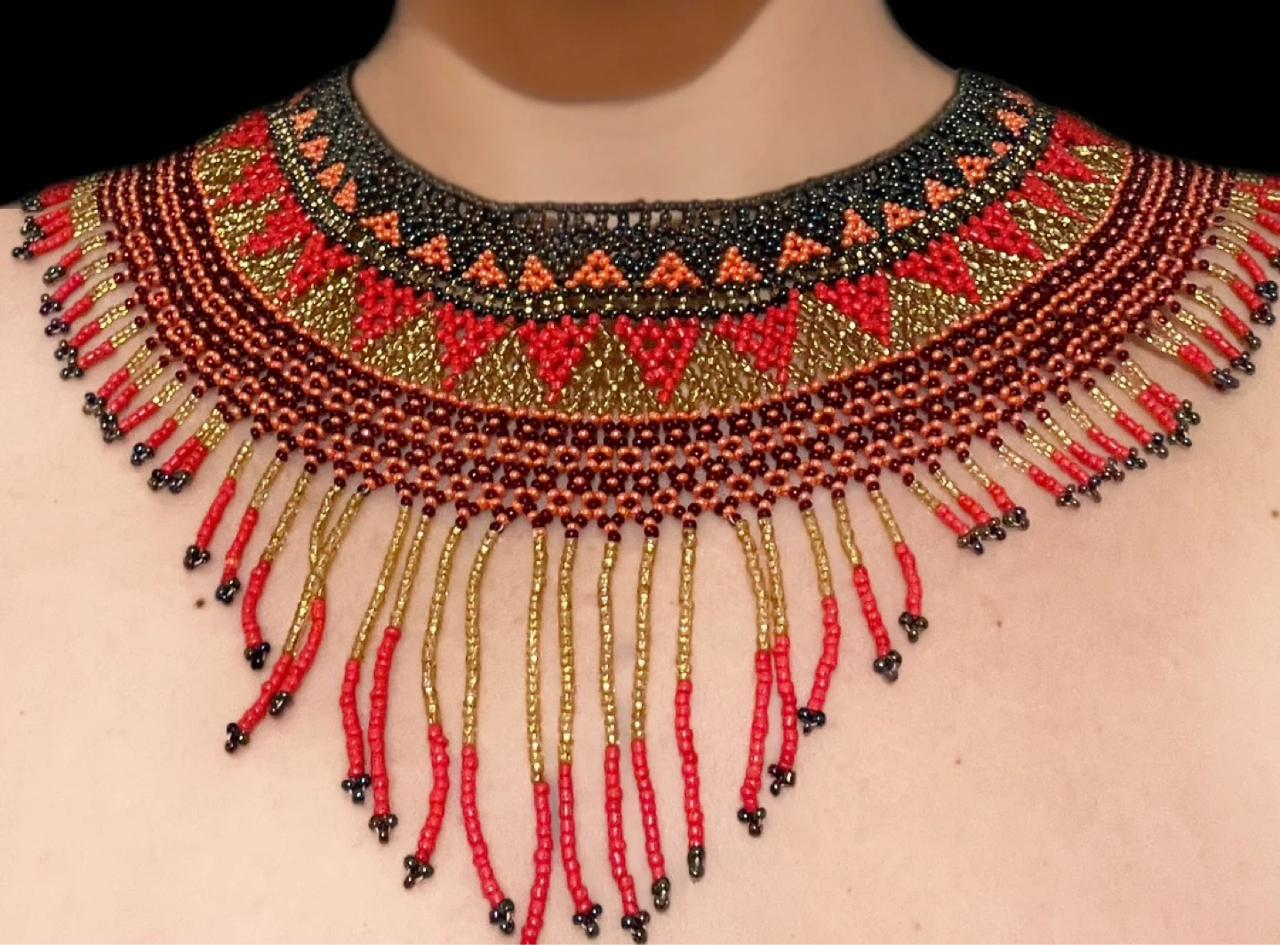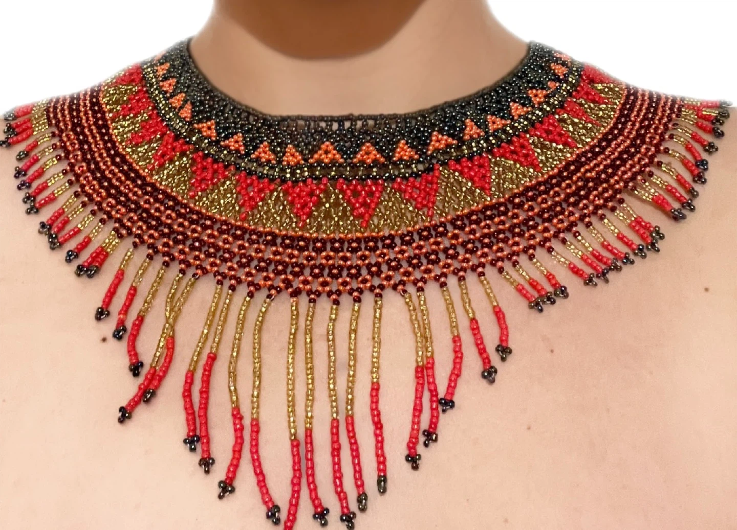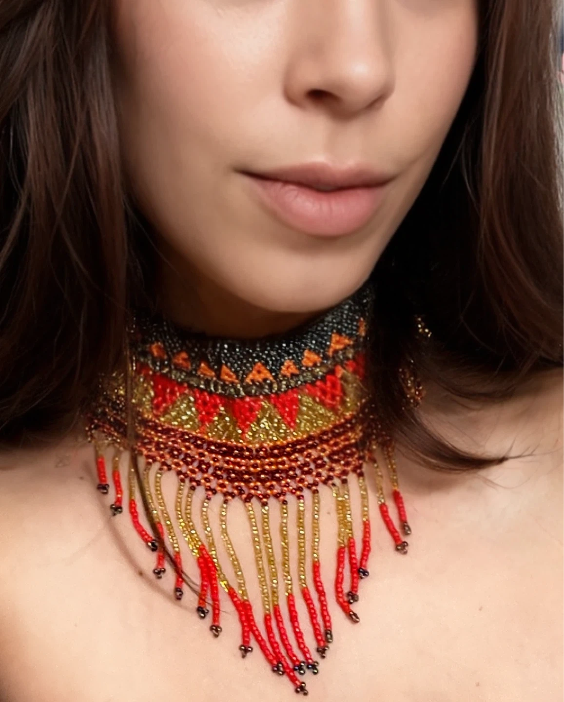 This vibrant choker necklace is crafted with intricate beadwork. It features a striking pattern in shades of red, gold, and black. Dangling beaded strands add dimension and elegance.