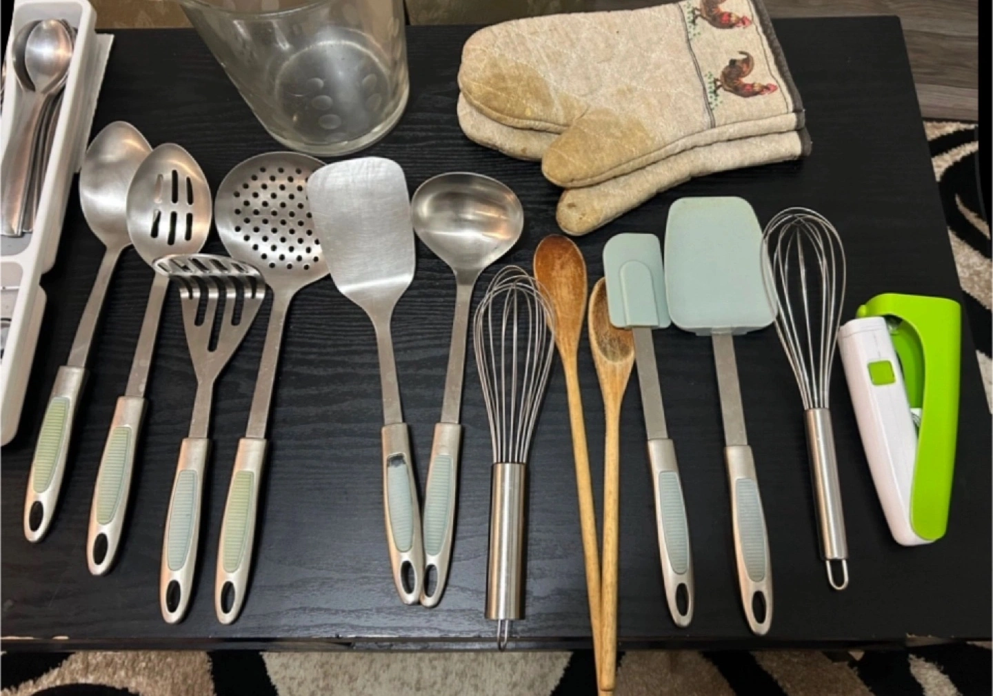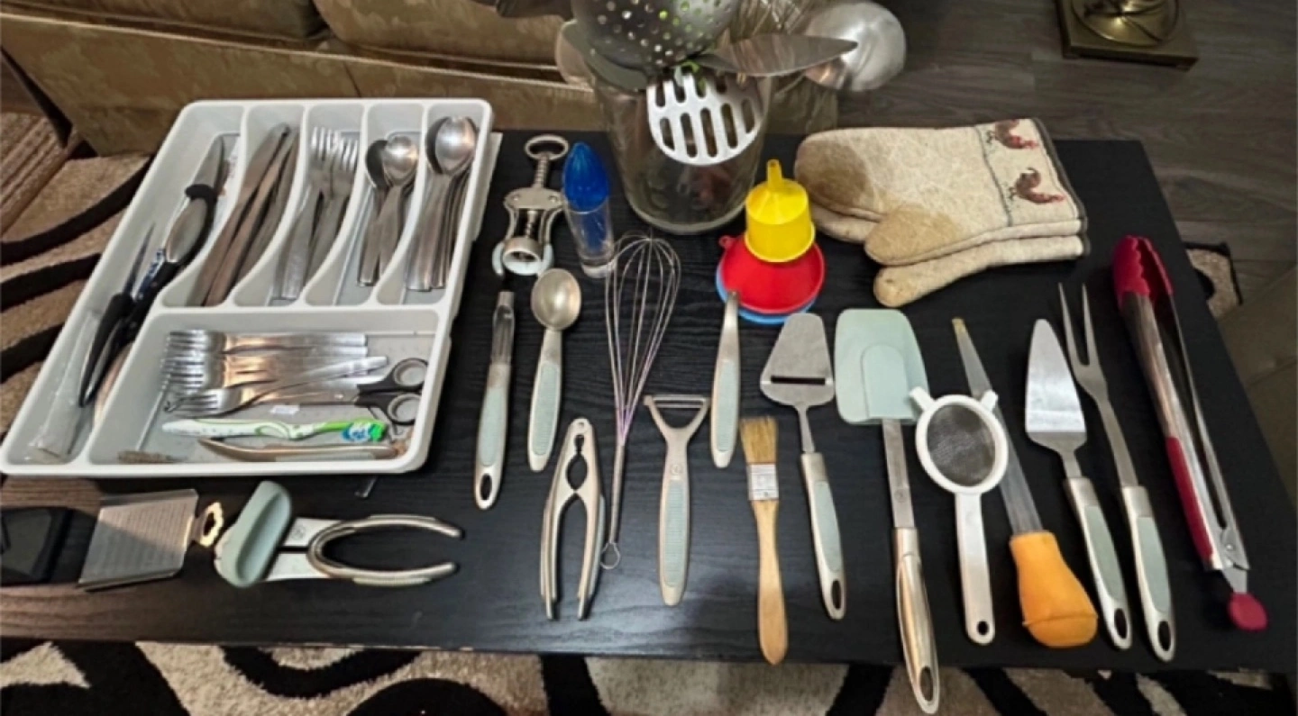 Includes various spoons, spatulas, fork, whisks, a grater, tongs, cutlery, potato peeler, and masher, sifters and more.