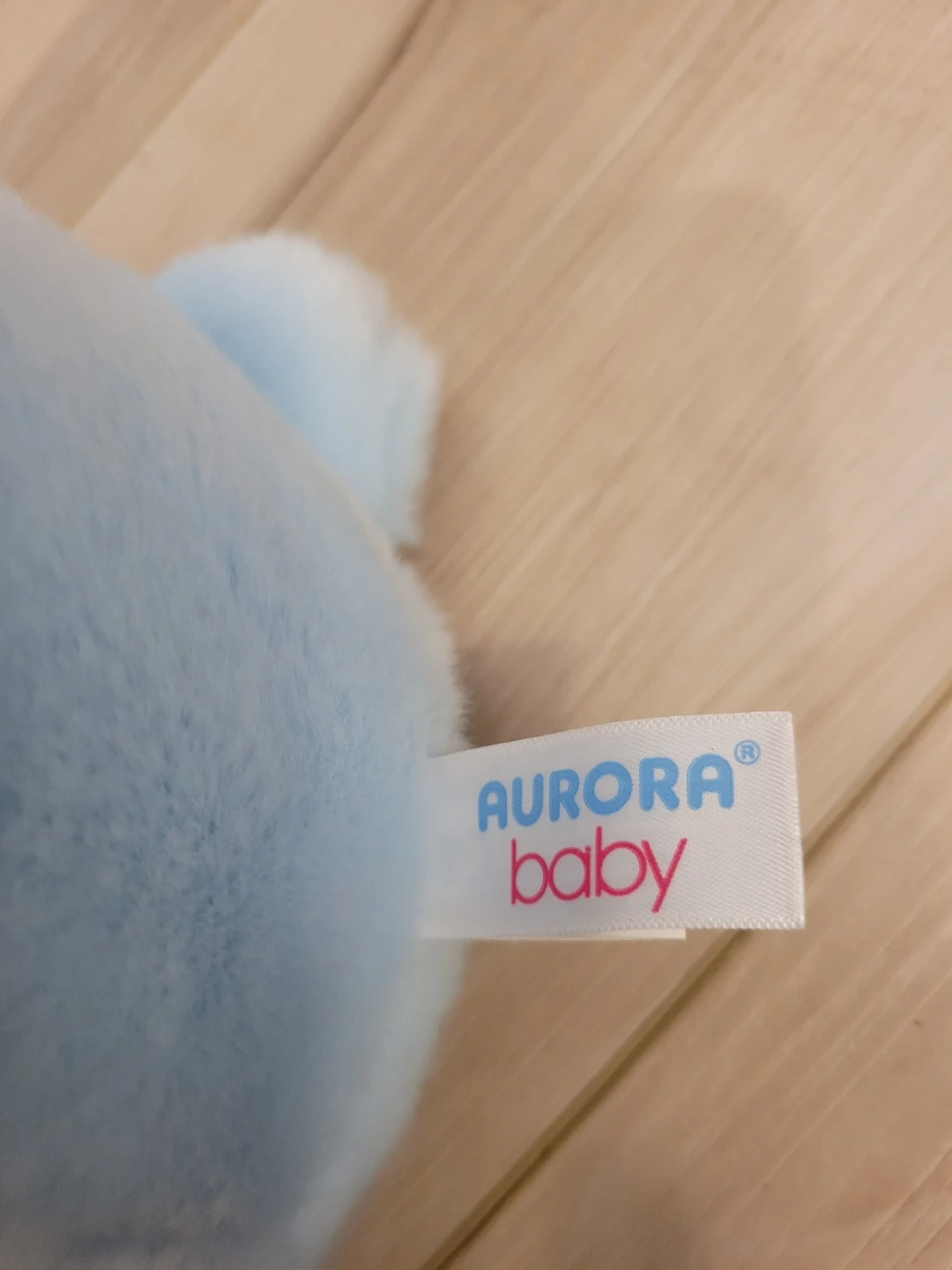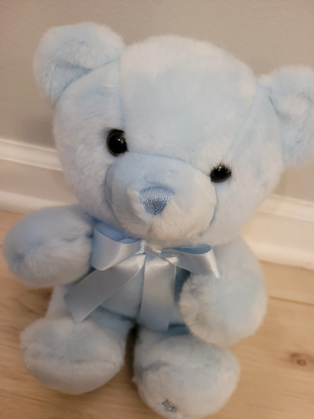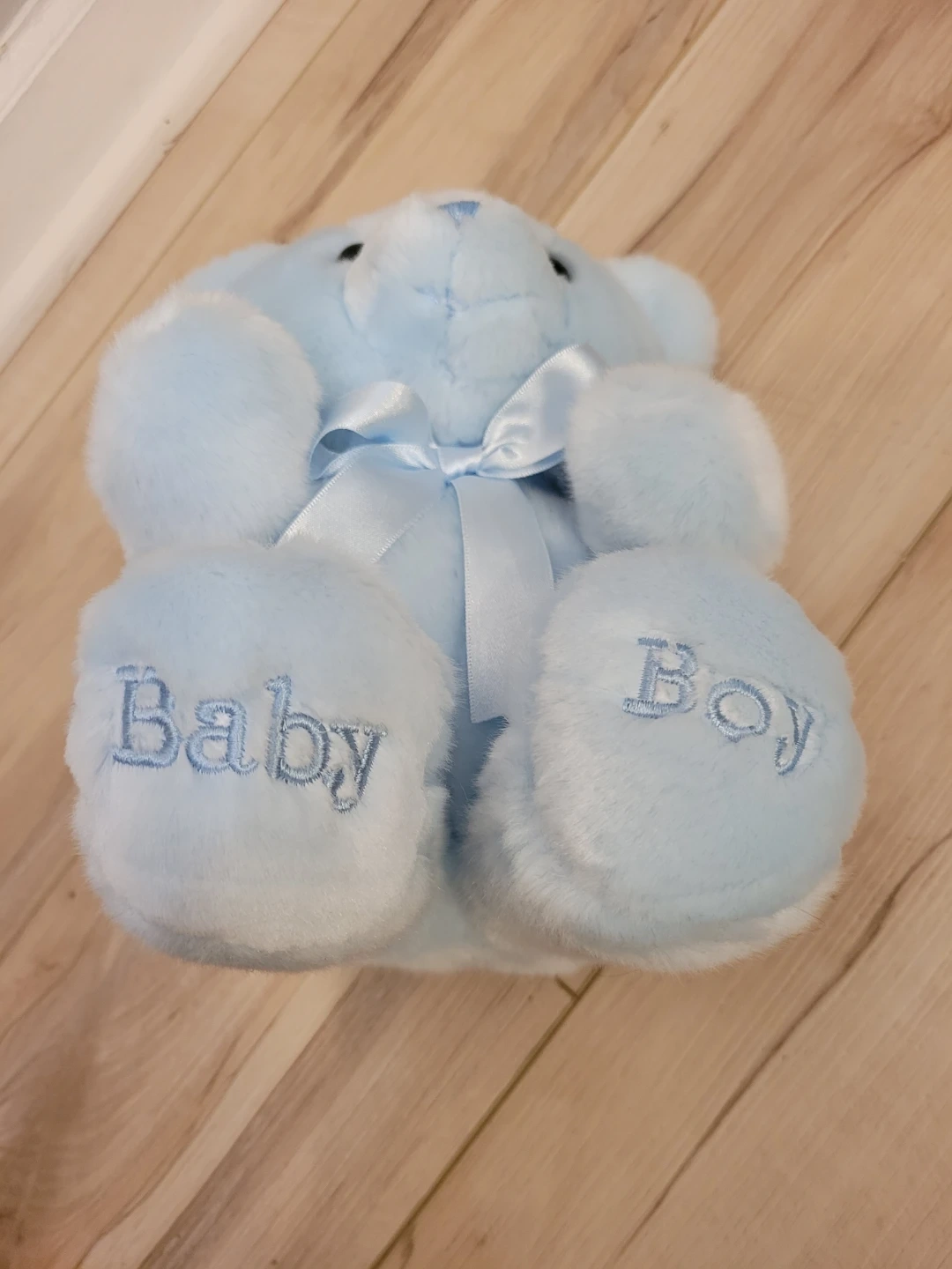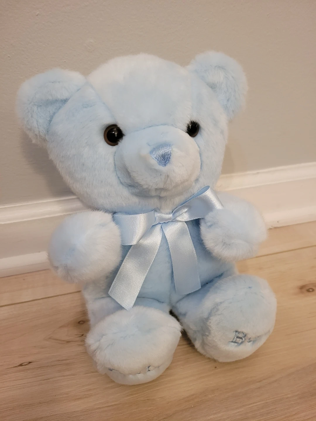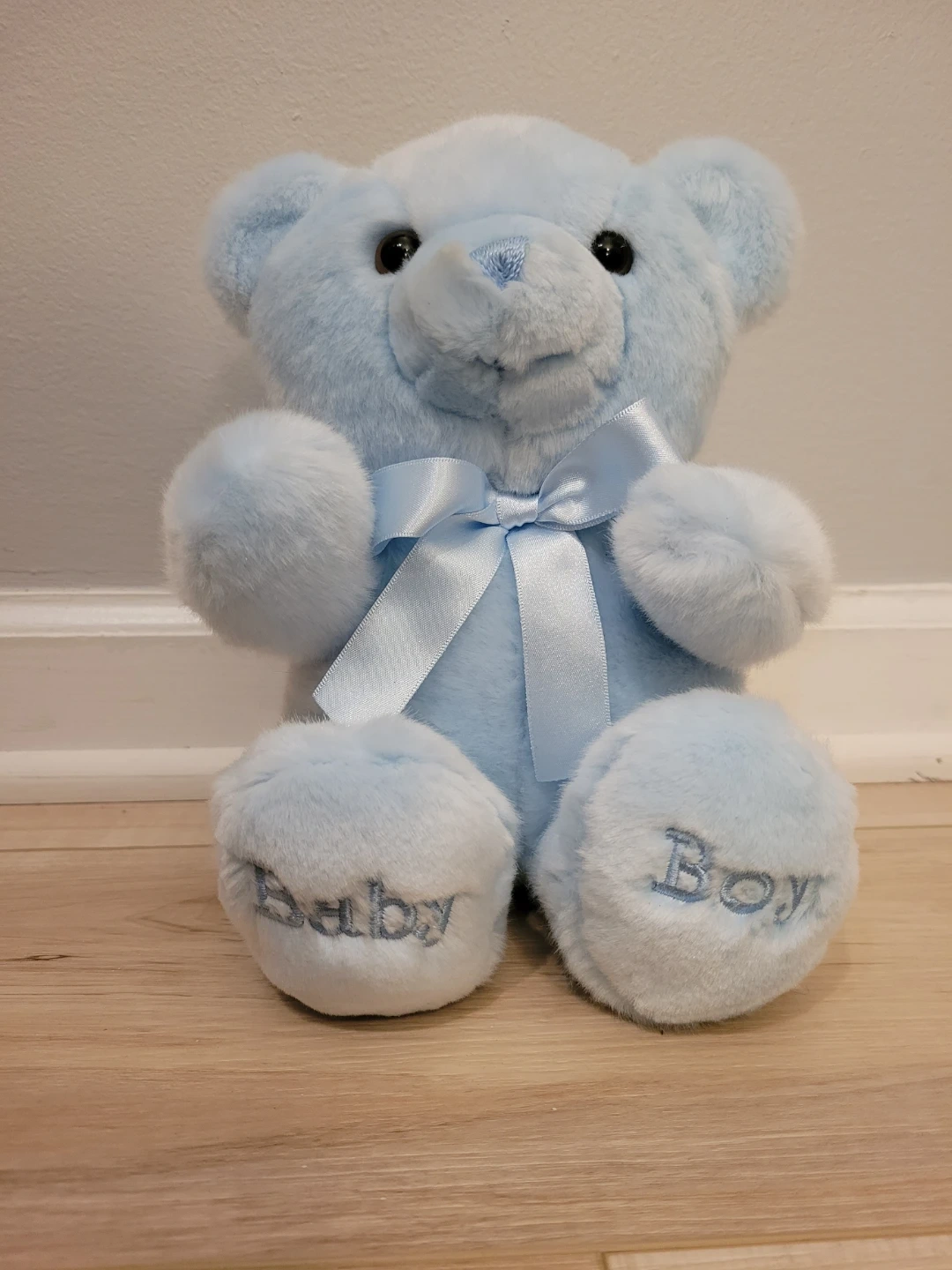 This adorable baby blue teddy bear is super soft and cuddly! It's in great condition and ready for a new home. The brand is Aurora Baby. It features a cute satin bow and 'Baby Boy' embroidered on its feet!