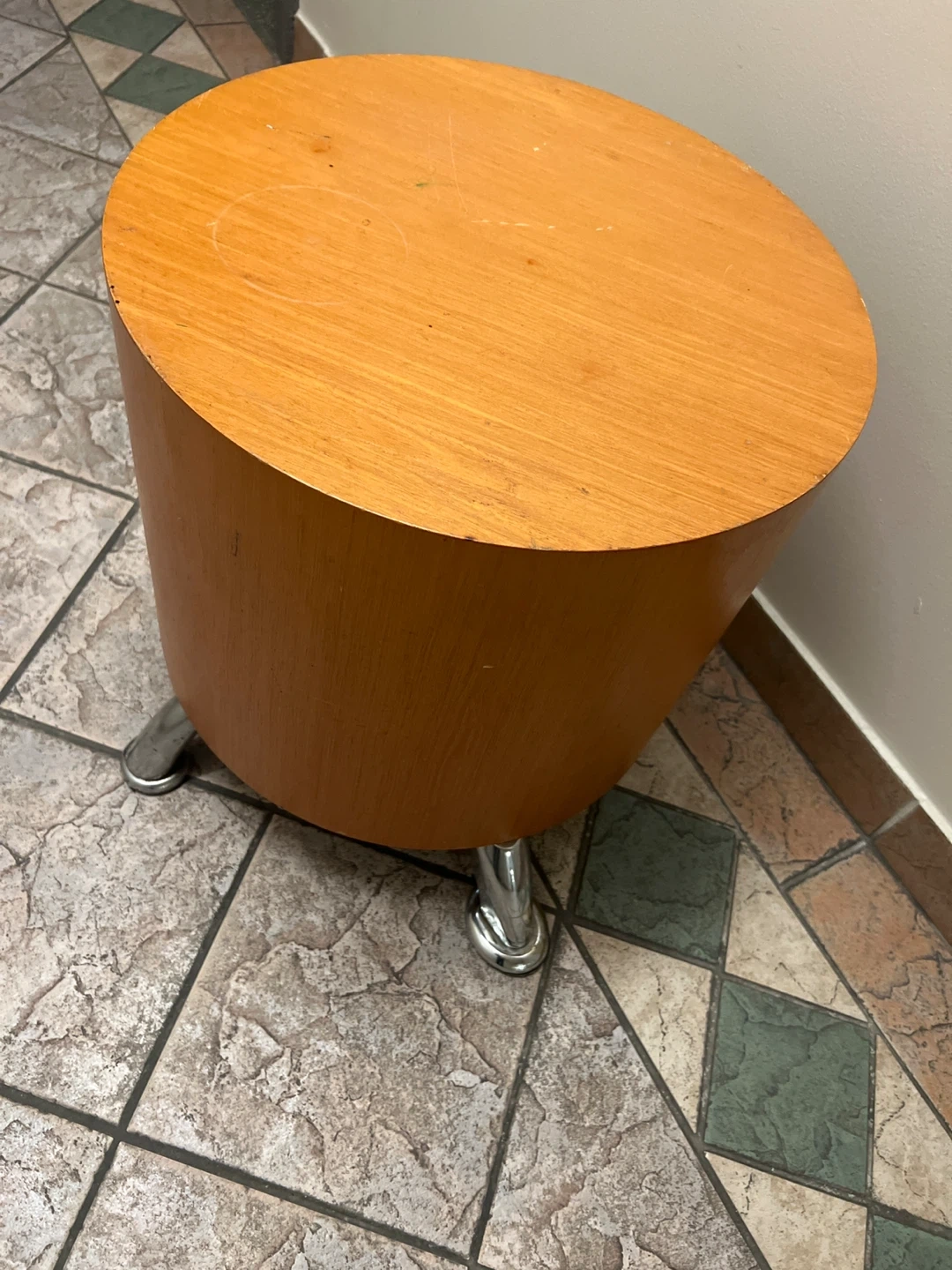 This is a round side table with a light wood finish and chrome legs. It's a good size for placing next to a couch or chair. The table is sturdy and has a clean, simple design.