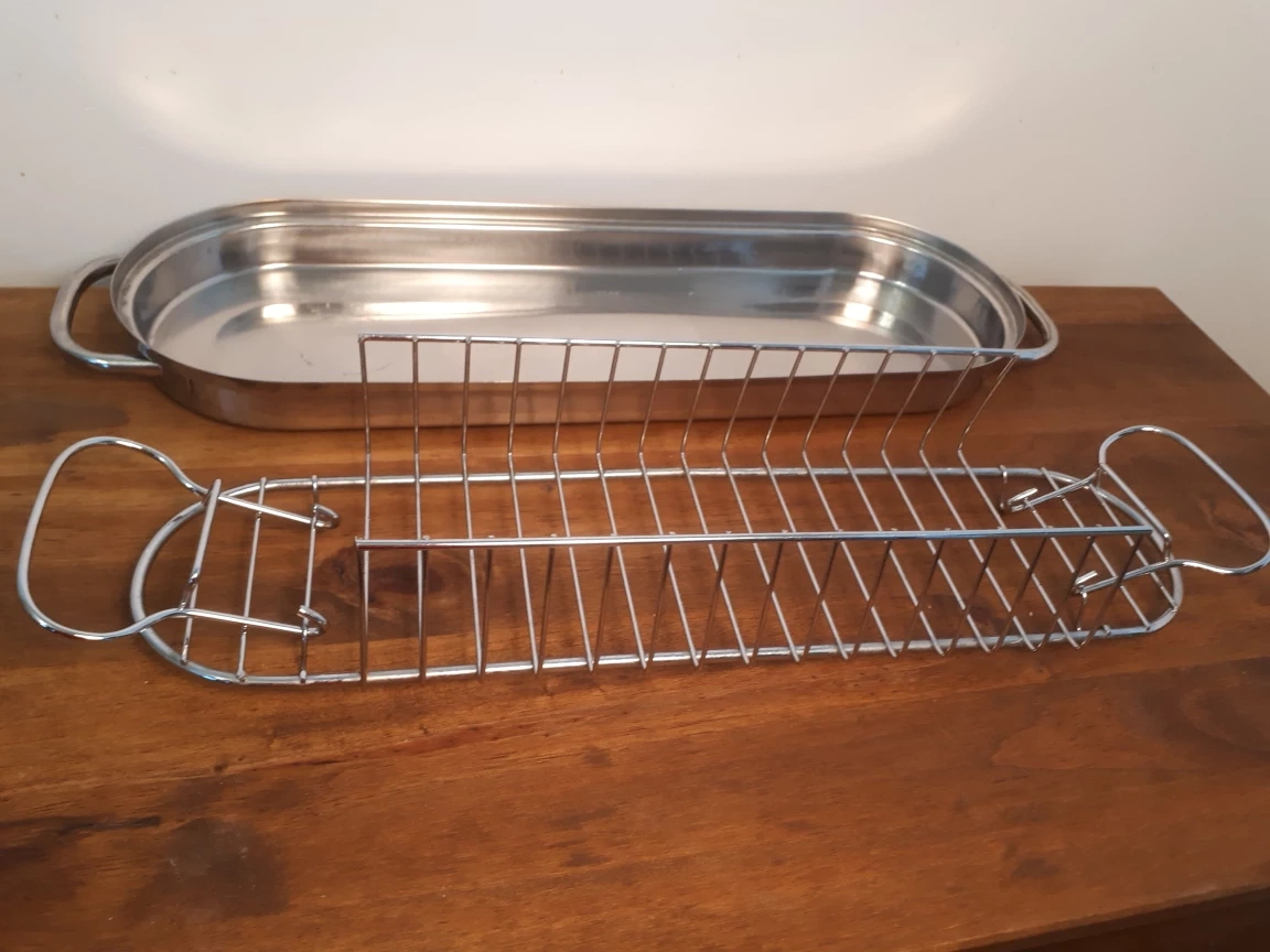 Selling a chrome plated roasting rack. Perfect for oven, this rack helps elevate your food for even cooking and browning. It also comes with removable handles for easy lifting. Sides suport hot food from slipping during handling. Tray has multiple uses: deep enough to use in the oven to collect basting and juices, and looks good enough to be used as serving tray.