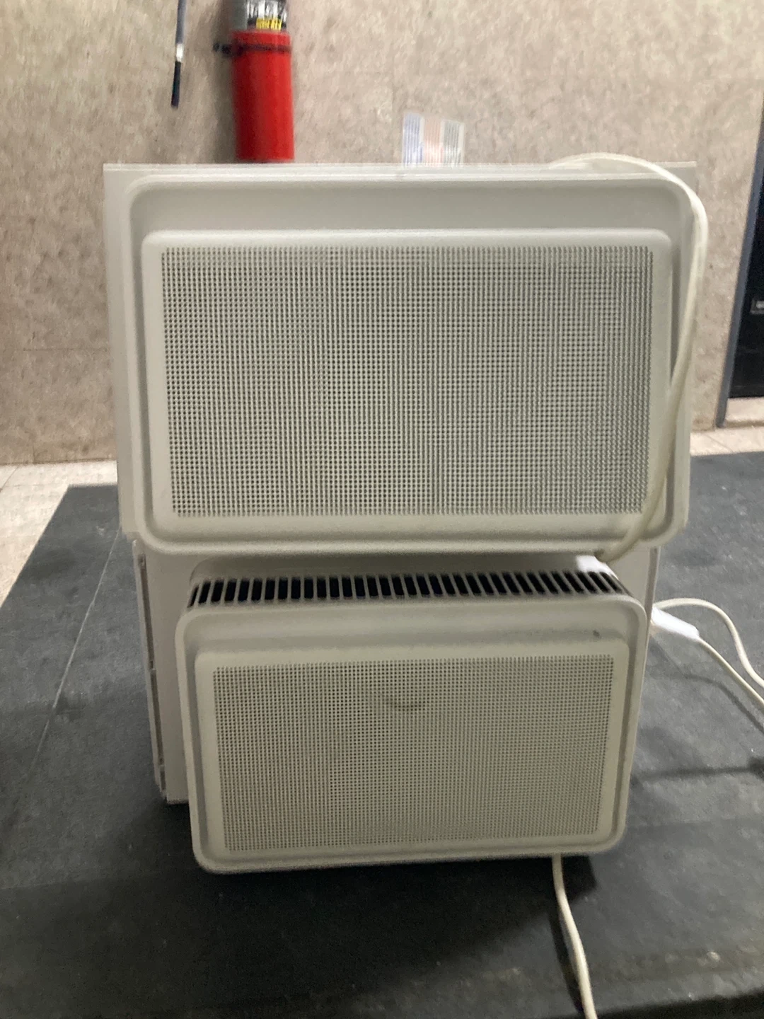 This is a white window air conditioner. It's a compact unit designed for cooling a room. The unit has a front grille for air intake and output.