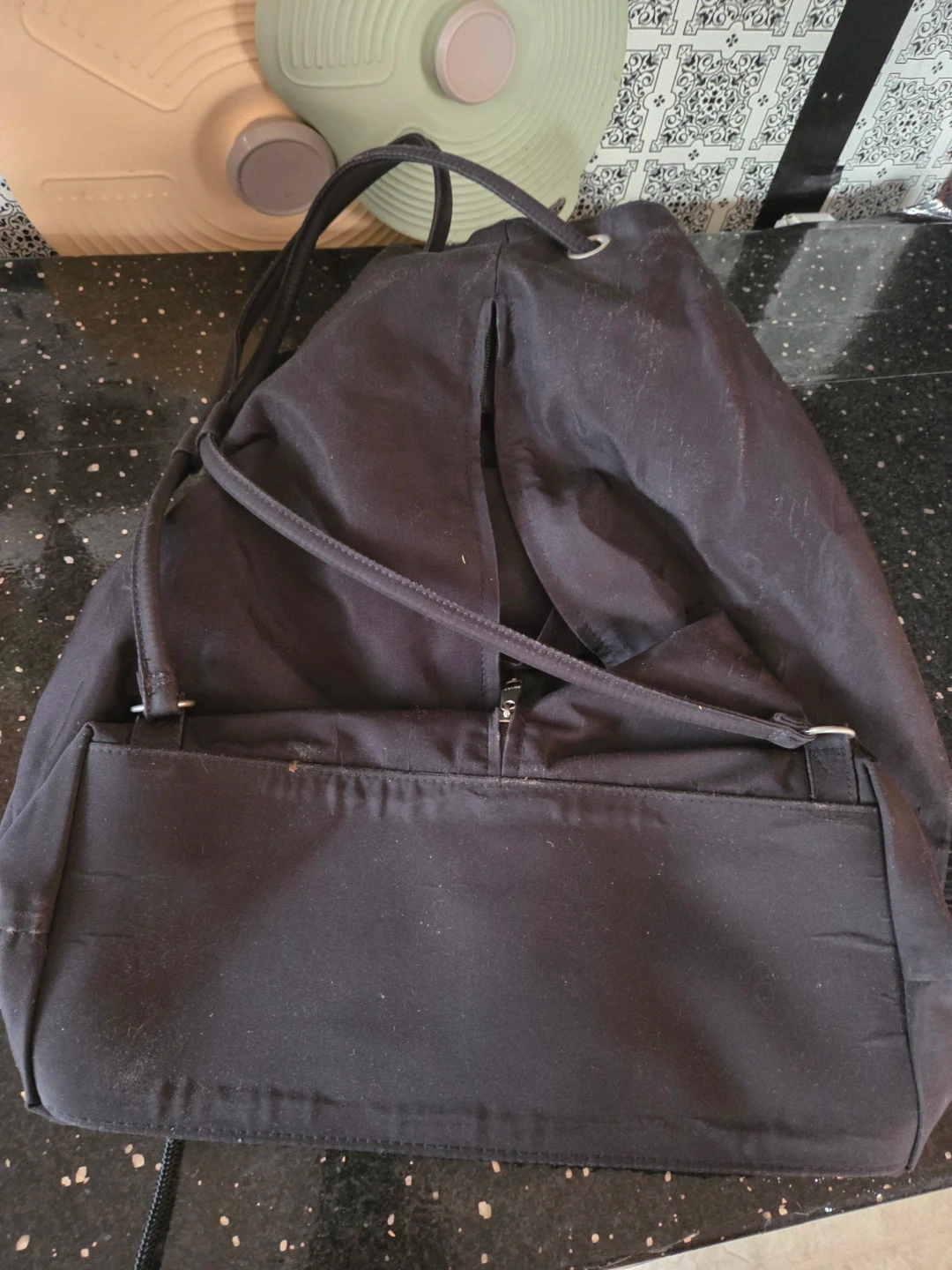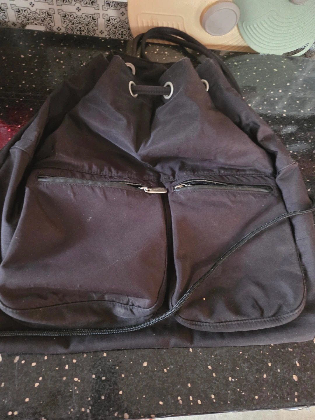 Selling a Esprit black drawstring backpack. It's in good condition and ready for a new owner. It's perfect for carrying your essentials around town or for a weekend getaway. It features a drawstring closure and two front pockets with zippers
