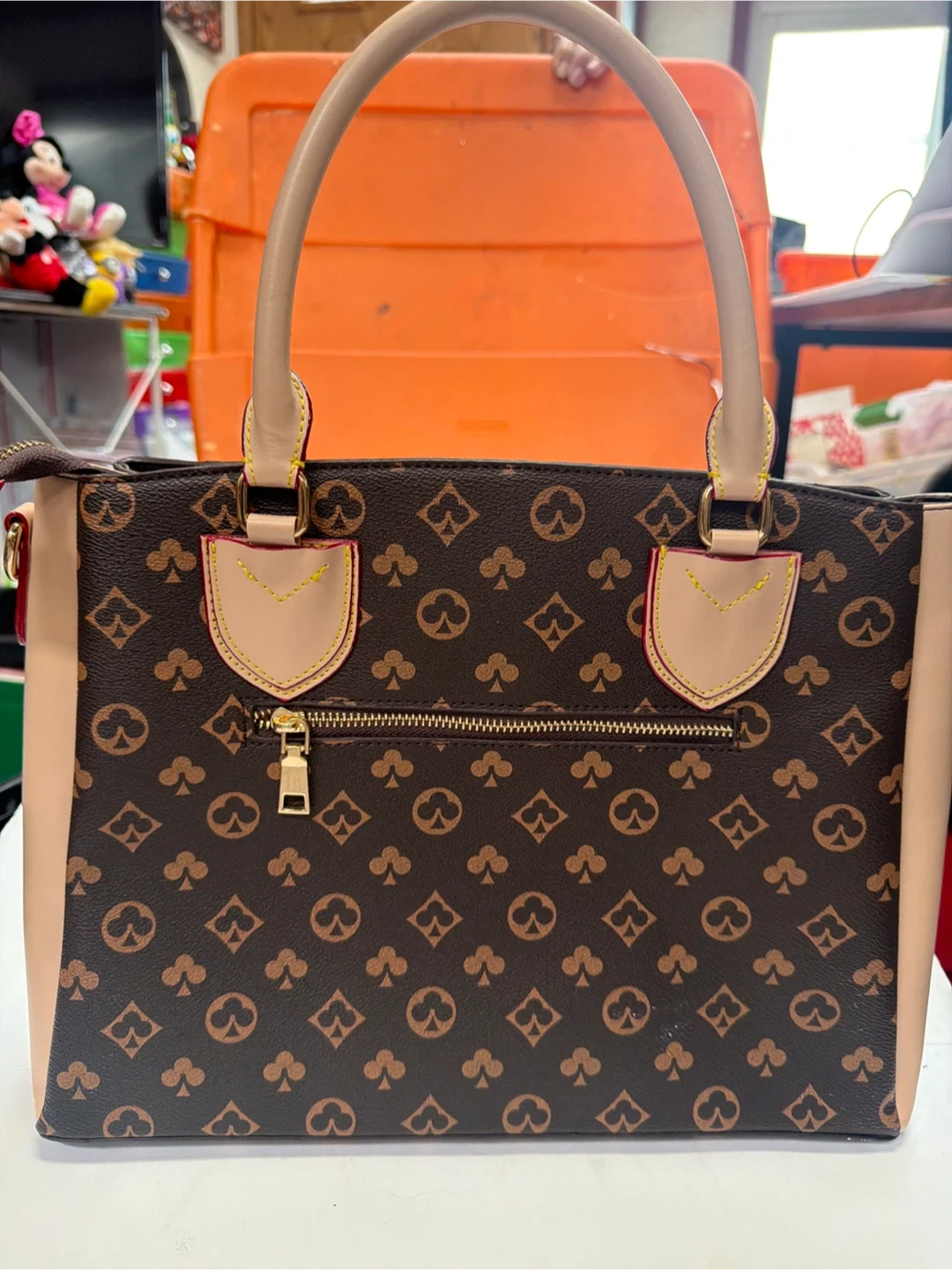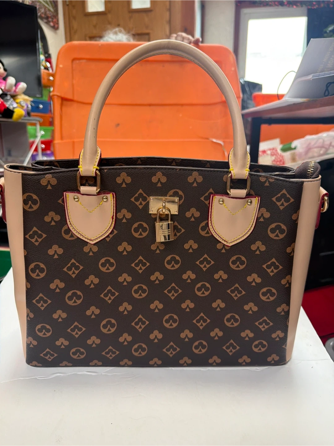 Stylish satchel handbag with a classic monogram print. Features a zip closure pocket on the back and a secure lock closure on the front. Gold-tone hardware and dual top handles complete the look. This bag is perfect for everyday use!