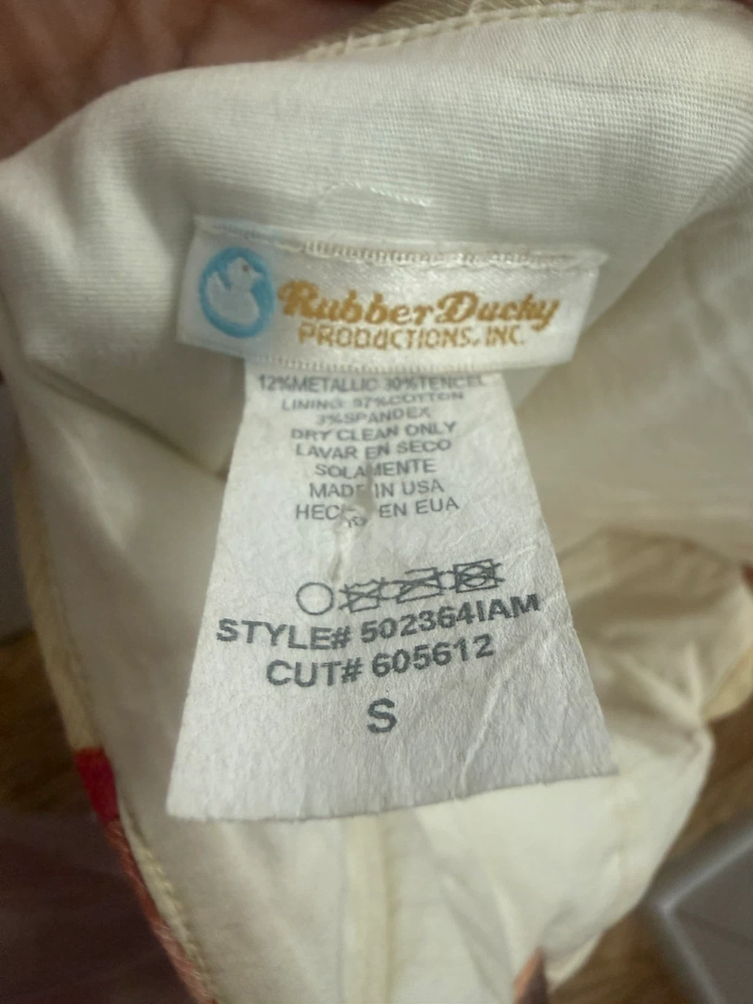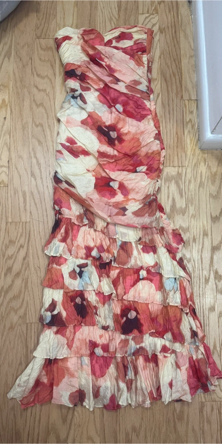 This is a strapless dress by Rubber Ducky Productions. It features a floral print with ruffles. Made of 12% metallic, 87% tencel, and 3% spandex. The lining is 97% cotton and 3% spandex. Made in USA. Size S.